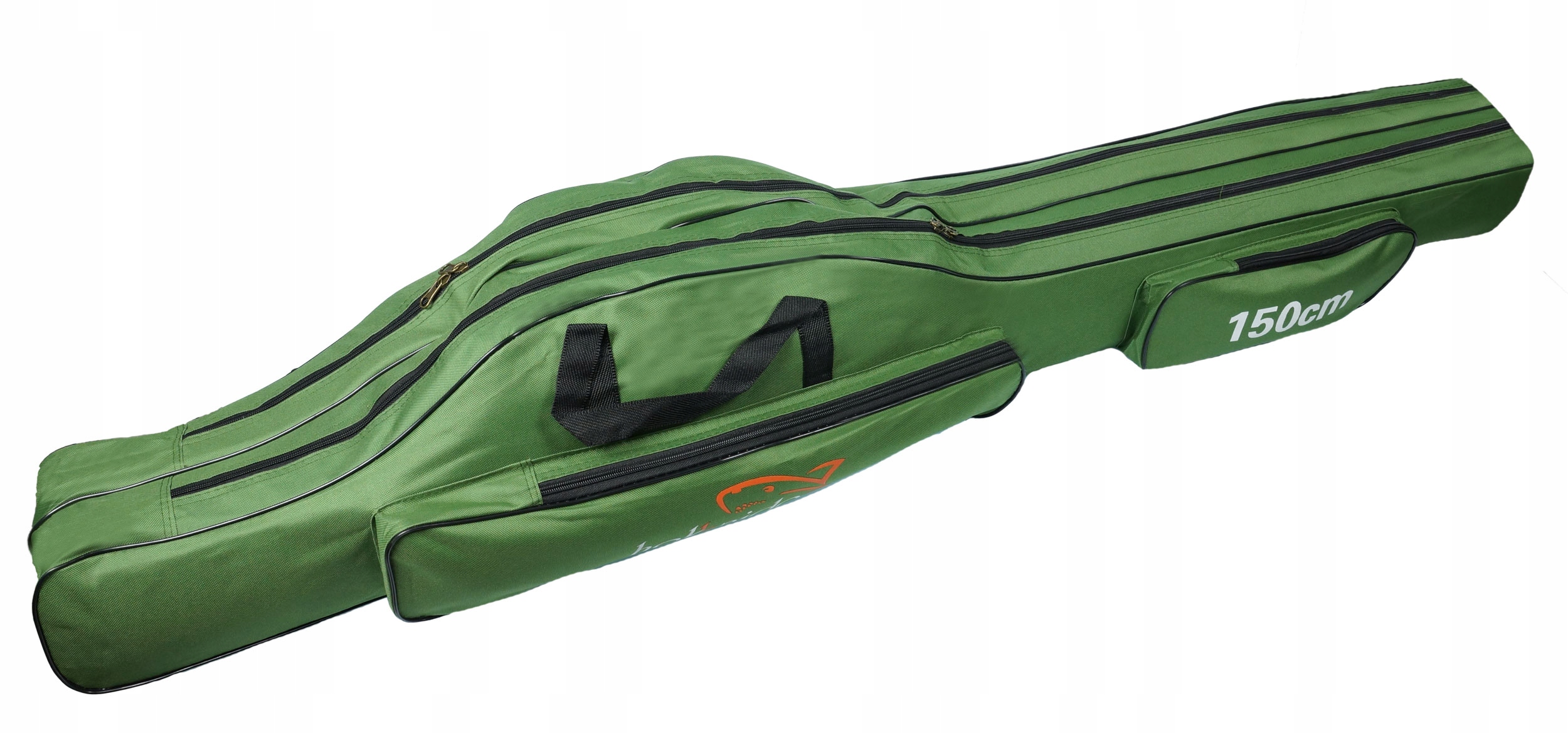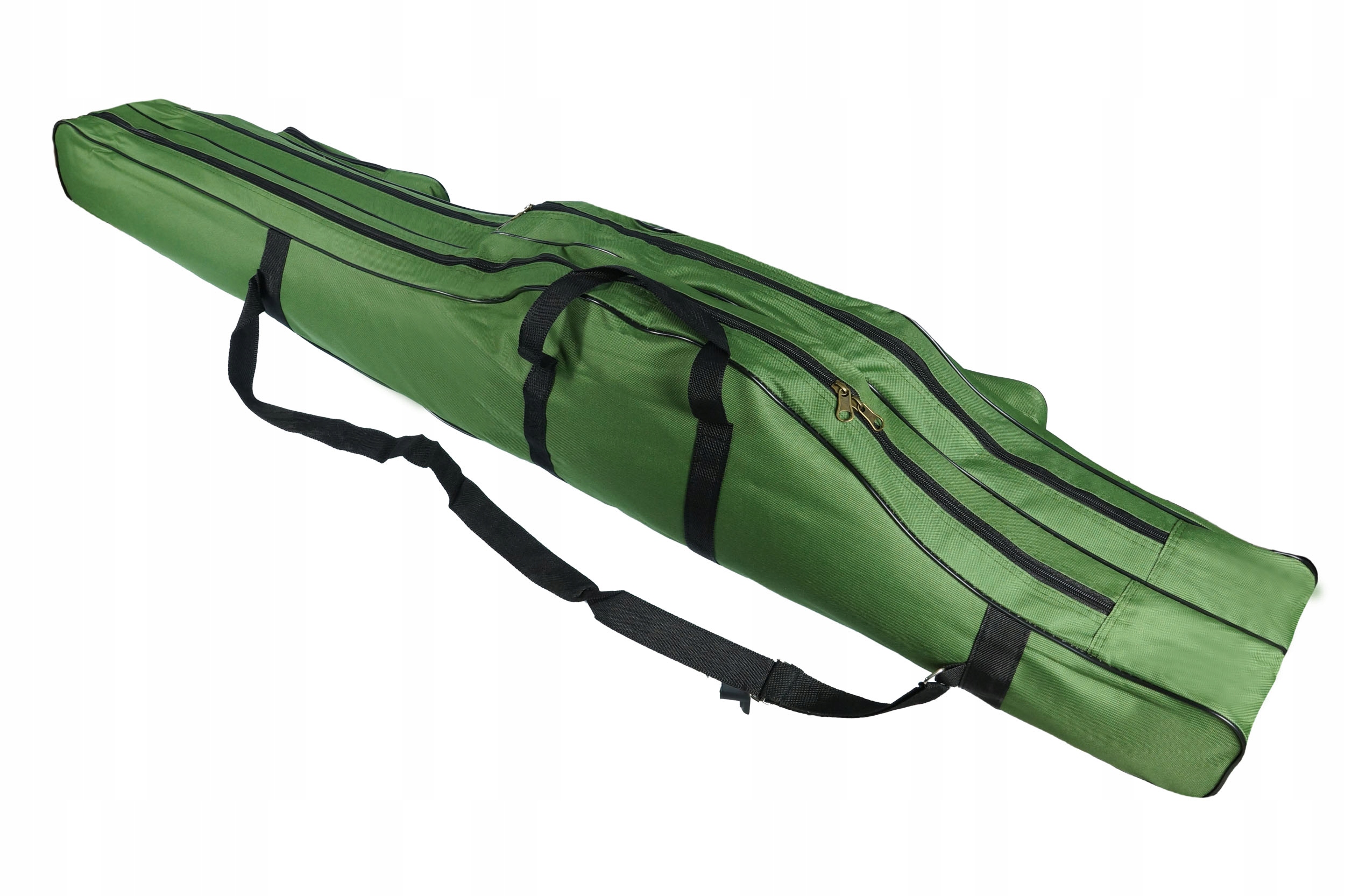 Pokrowiec ze sztywnego materiału w kolorze wojskowej zieleni. Posiada 2 komory po 150cm.Wygodny do noszenia w ręku czy na ramieniu, solidnie wykonany z bardzo dobrej jakości sztywnego materiału.Na boku znajdują się kieszenie, w których można przenosić mniejsze akcesoria, ich wymiary to: 55x12cm oraz 32x12cm.