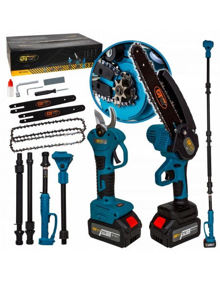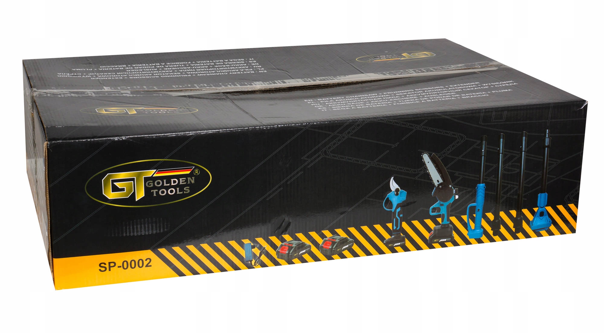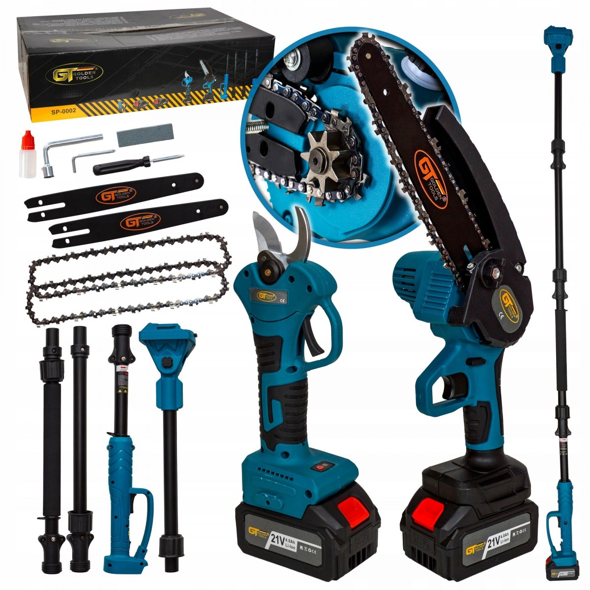 Aku pilarka łańcuchowa marki GOLDEN TOOLS z 2 prowadnicami 8" , dwoma łańcuchami 8" i systemem smarowania łańcucha jest doskonałym narzędziem do cięcia gałęzi, mniejszych drzew i innych prac związanych z pielęgnacją roślin. Dzięki kompaktowej i bezprzewodowej konstrukcji zapewnia maksymalną swobodę ruchu, co ułatwia pracę w trudno dostępnych miejscach.