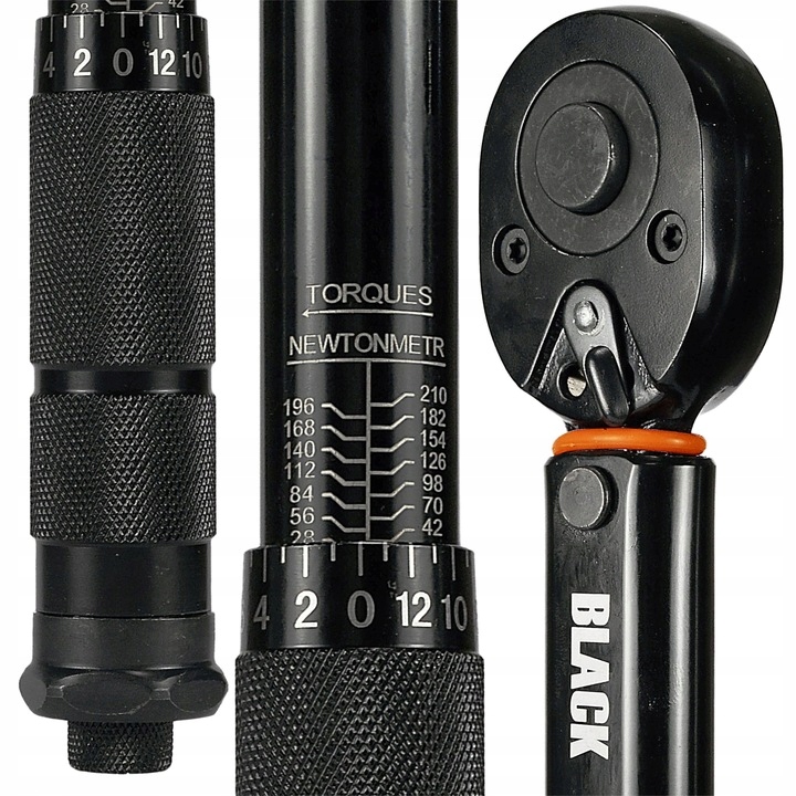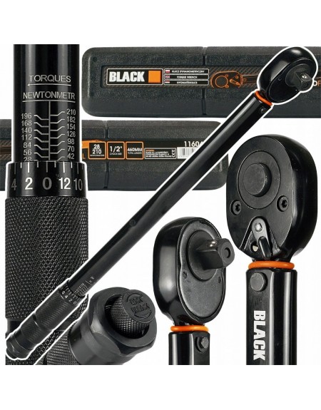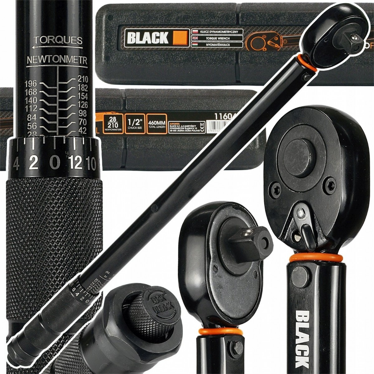 Klucz dynamometryczny 1/2" marki Black to narzędzie zaprojektowane z myślą o wymagających użytkownikach. Doskonale sprawdzi się zarówno w profesjonalnych warsztatach samochodowych, jak i w domowych warunkach przez majsterkowiczów. Dzięki niemu można precyzyjnie dokręcać śruby z określoną siłą, co jest niezbędne w wielu aspektach inżynierii i mechaniki. Klucz oferuje zakres roboczy od 28 do 210 Nm, co czyni go wszechstronnym i dokładnym przy różnych zadaniach.
