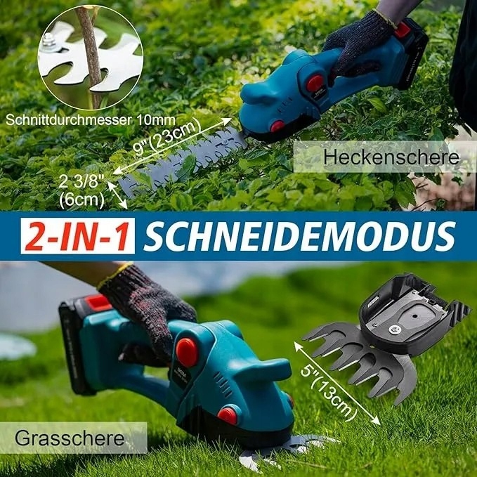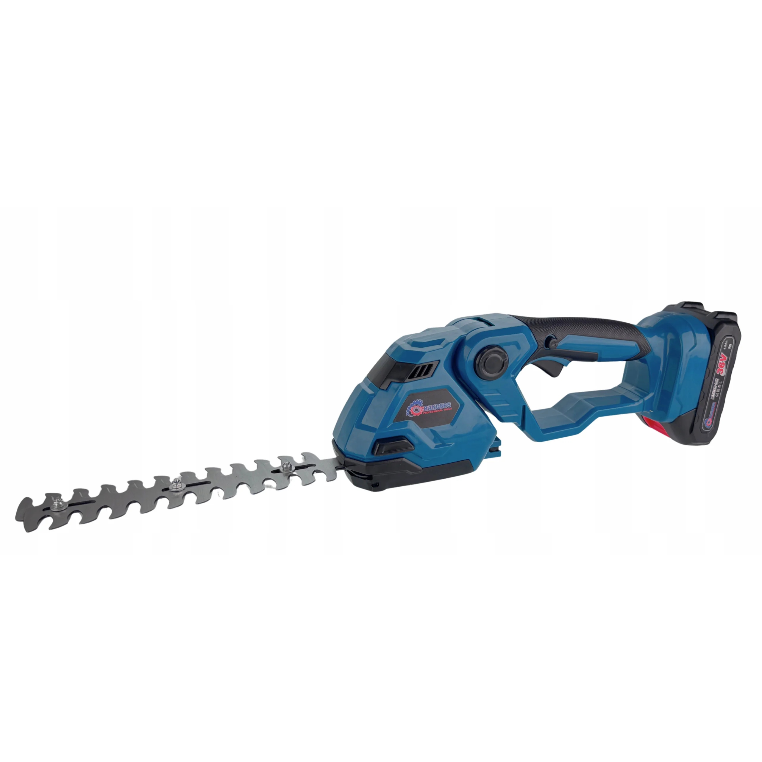 Nożyce akumulatorowe 2w1 to nowoczesne narzędzie zaprojektowane z myślą o wymagających użytkownikach. Dzięki wymiennym ostrzom urządzenie łączy funkcję nożyc do trawy oraz nożyc do krzewów i żywopłotu, zapewniając wszechstronność w codziennej pielęgnacji ogrodu.