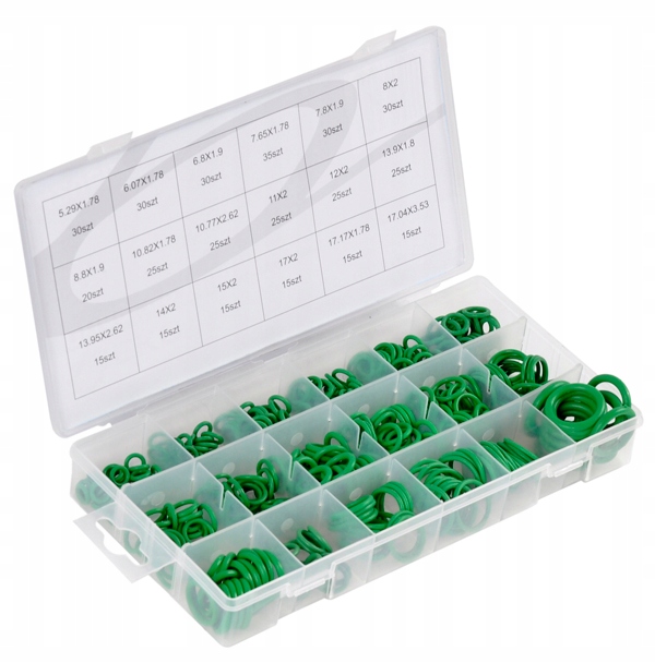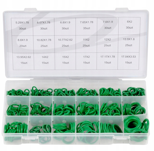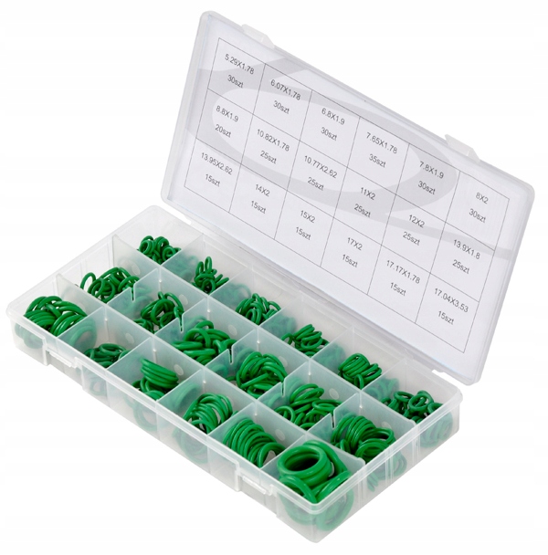 - Profesjonalny zestaw o-ringów o średnicach otworów od 5.29 do 17mm oraz grubości 1.78, 2.62 oraz 3.53 mm