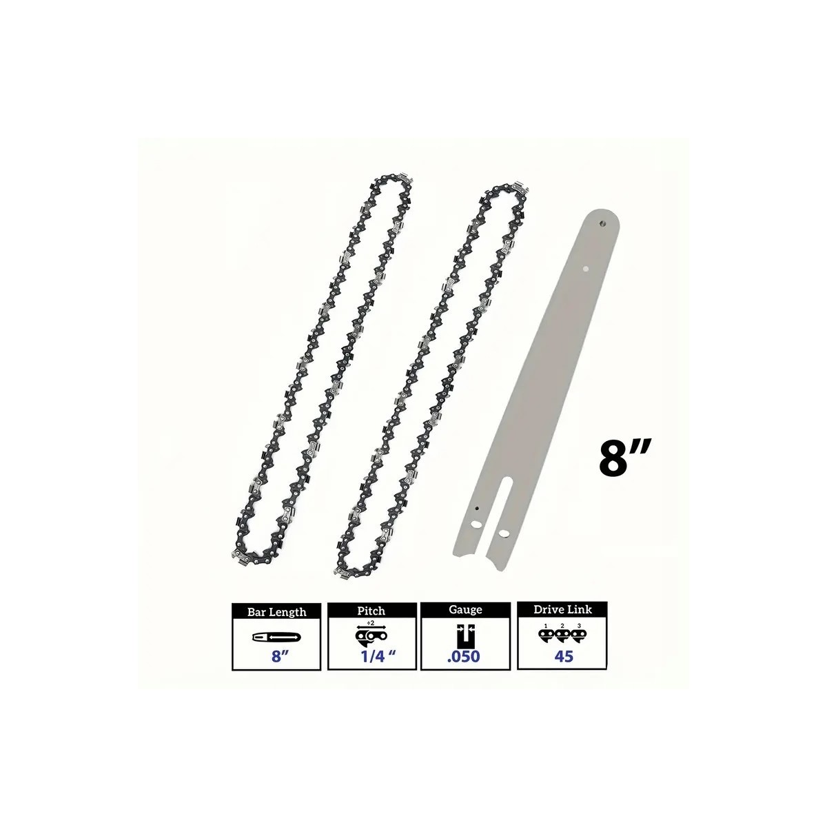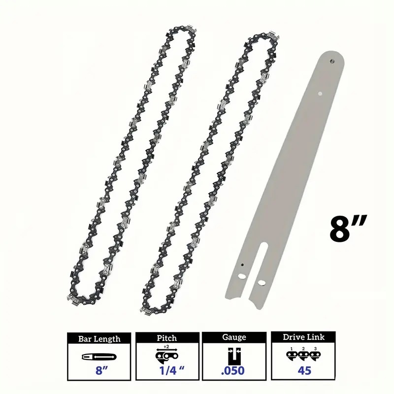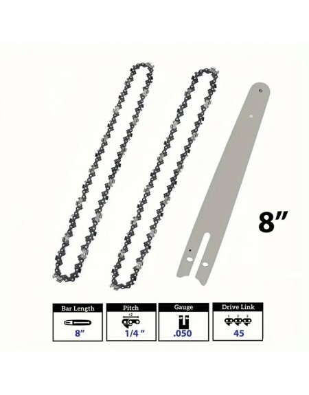 Prowadnica do piły łańcuchowej o długości 8" (około 20 cm) z dwoma łańcuchami zapasowymi to kompaktowy zestaw, idealny do lekkich prac związanych z cięciem drewna, przycinaniem gałęzi oraz pielęgnacją drzew i krzewów.