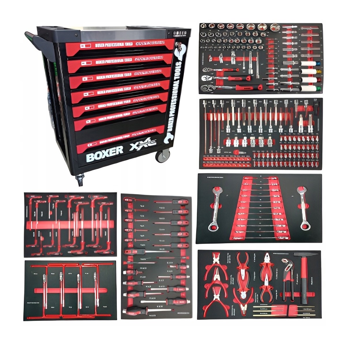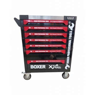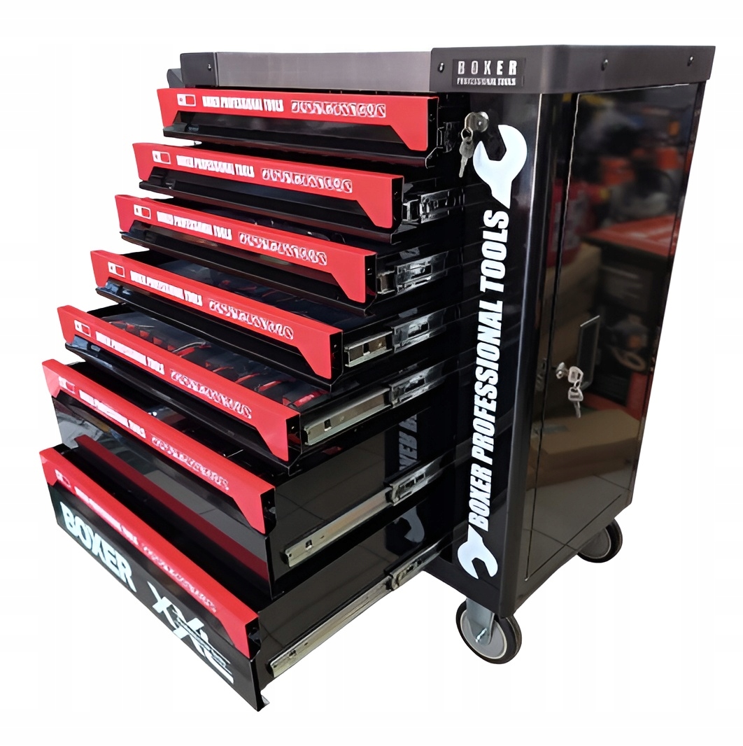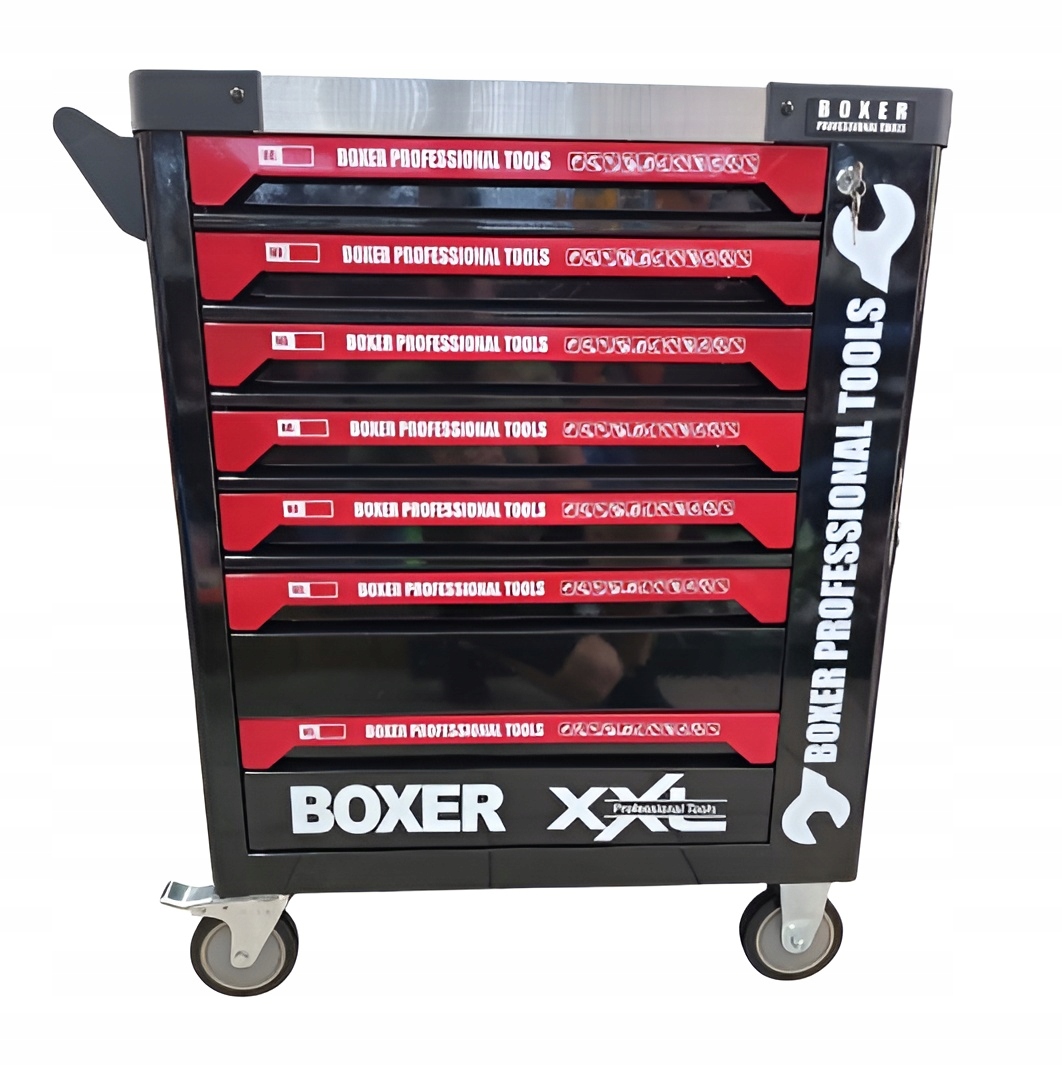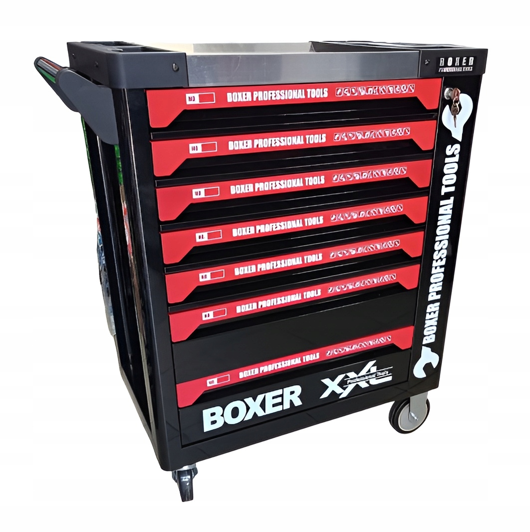 Solidny wózek warsztatowy BOXER BX-015 z wyposażeniem aż 356 elementów to niezastąpiony sprzęt w każdym warsztacie. Wyposażony w 7 szuflad z kulkowymi łożyskami, stalowy blat oraz centralny zamek, zapewnia wygodę i bezpieczeństwo przechowywania narzędzi i akcesoriów.
