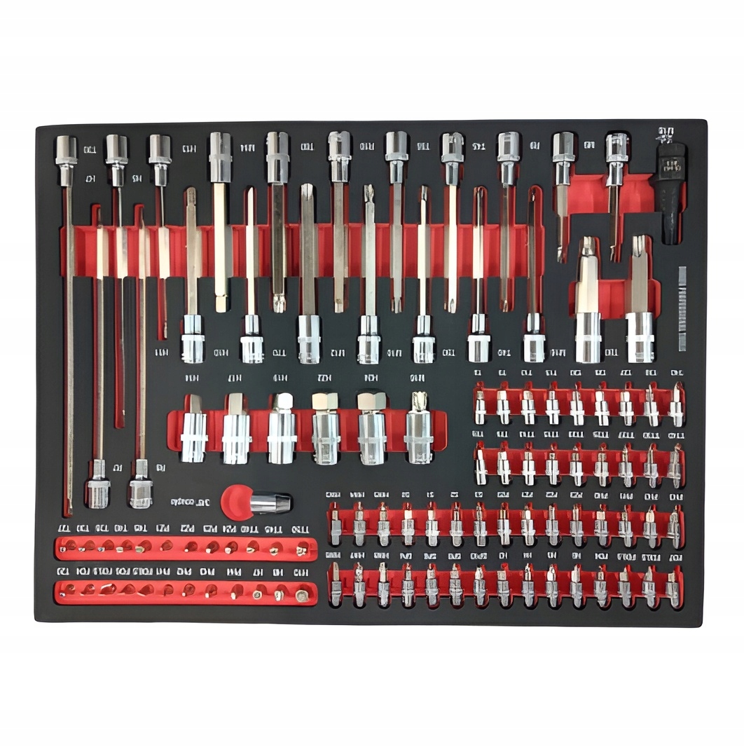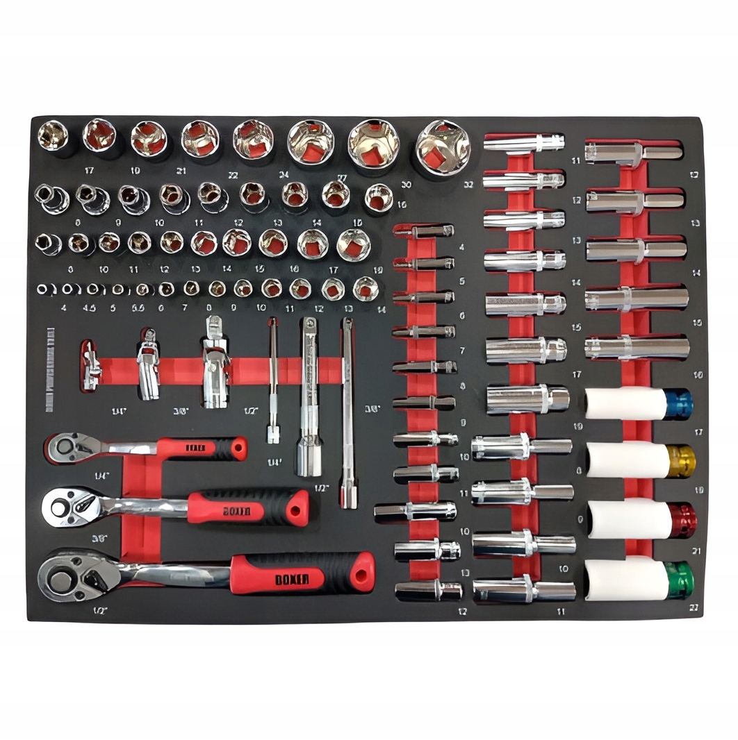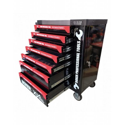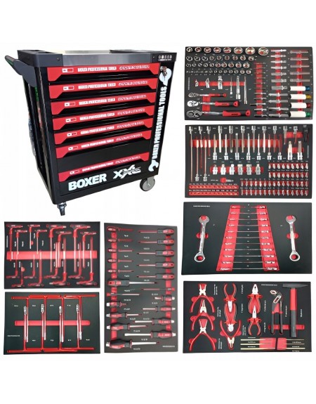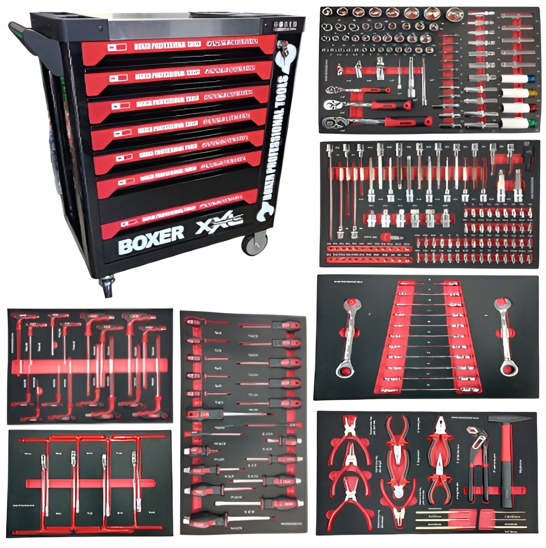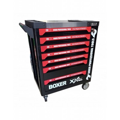 Solidny wózek warsztatowy BOXER BX-015 z wyposażeniem aż 356 elementów to niezastąpiony sprzęt w każdym warsztacie. Wyposażony w 7 szuflad z kulkowymi łożyskami, stalowy blat oraz centralny zamek, zapewnia wygodę i bezpieczeństwo przechowywania narzędzi i akcesoriów.