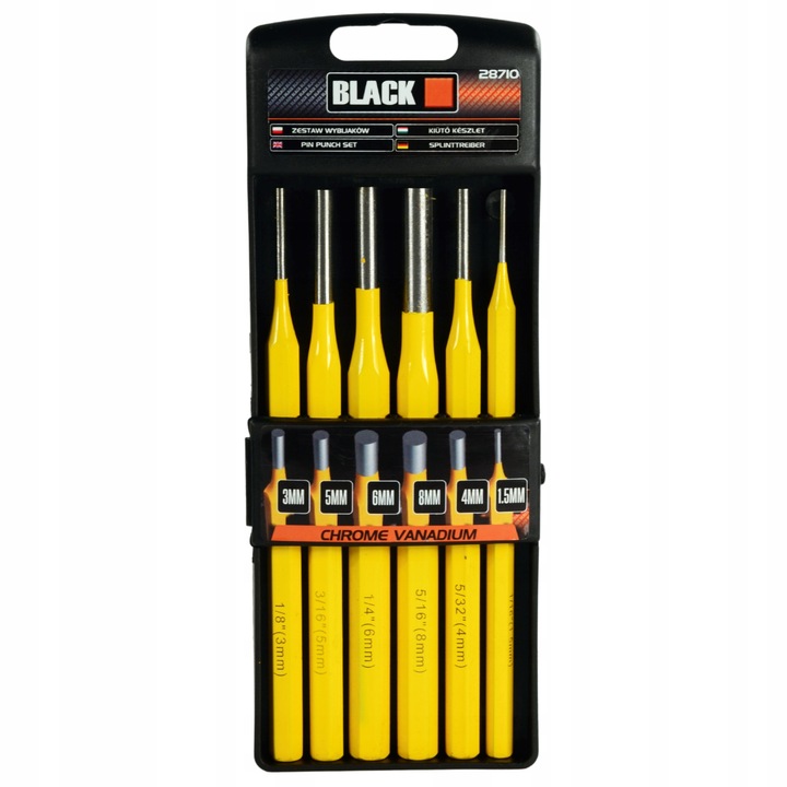 Zestaw umieszczony w praktycznym etui na zatrzask ułatwiającym przechowywanie ze względu na uporządkowane miejsca na każdy przebijak z możliwością zawieszenia zestawu na haku np. w warsztacie.