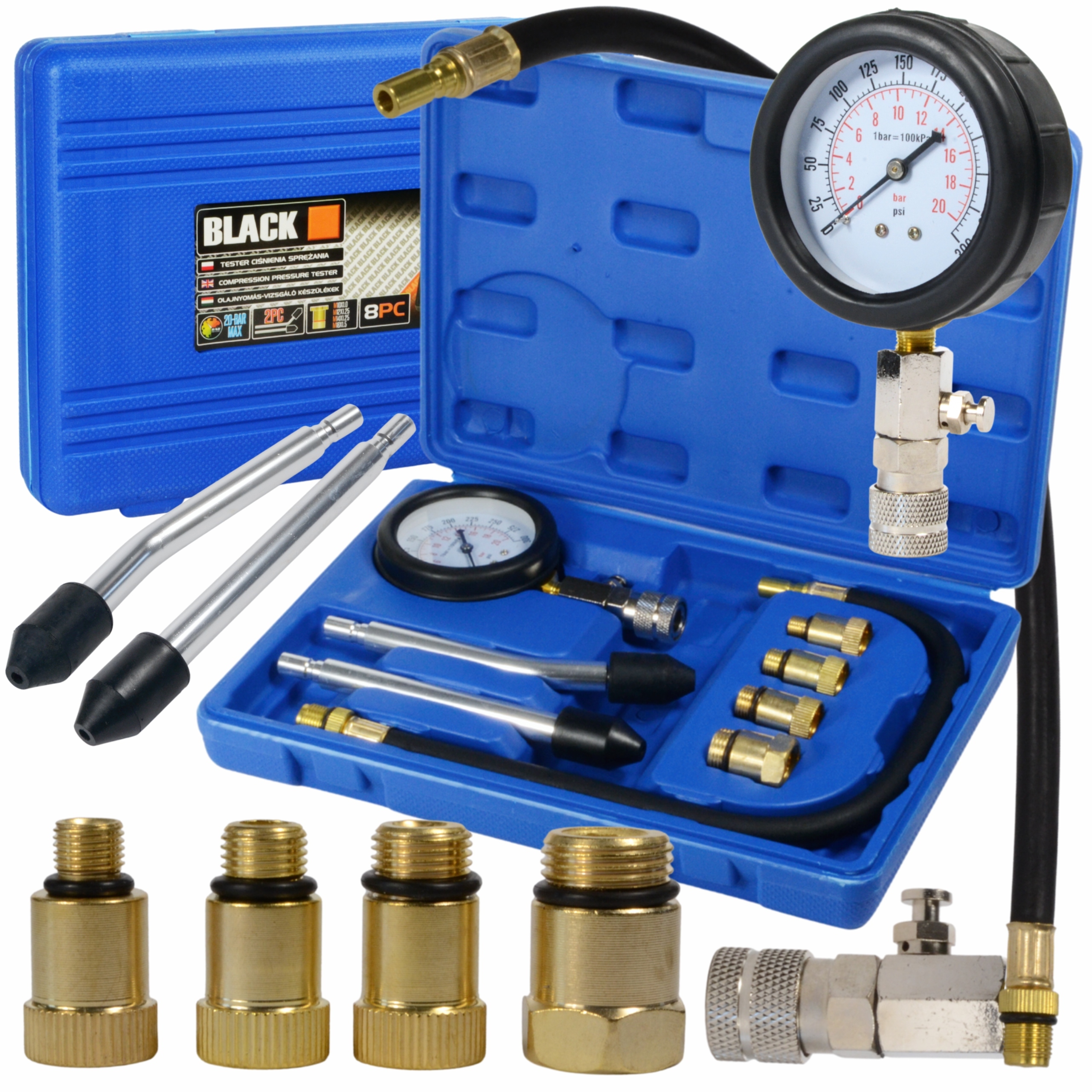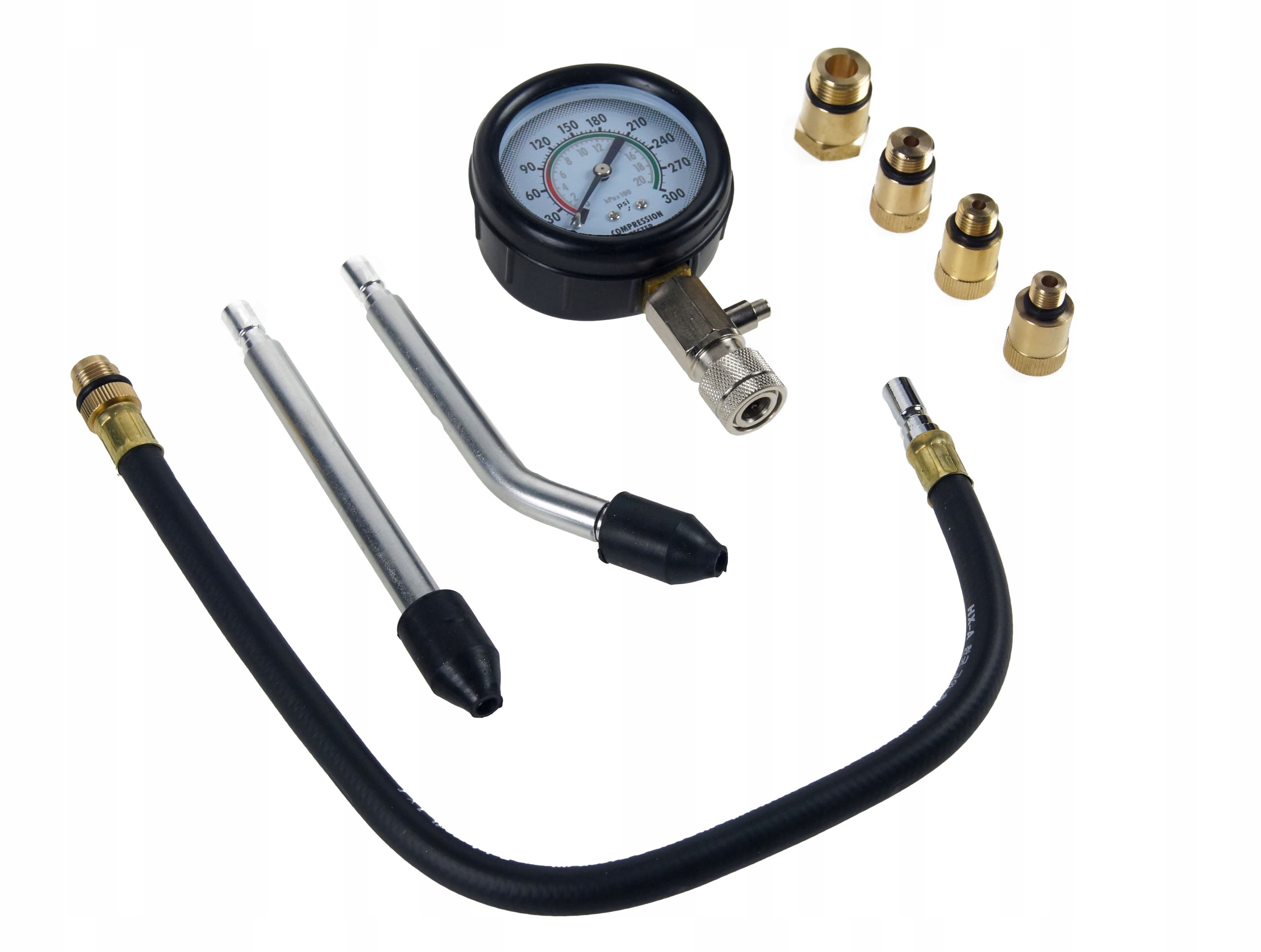 Tester do kontroli ciśnienia sprężania w cylindrach silników benzynowych z wyposażeniem poszerzającym jego możliwości.