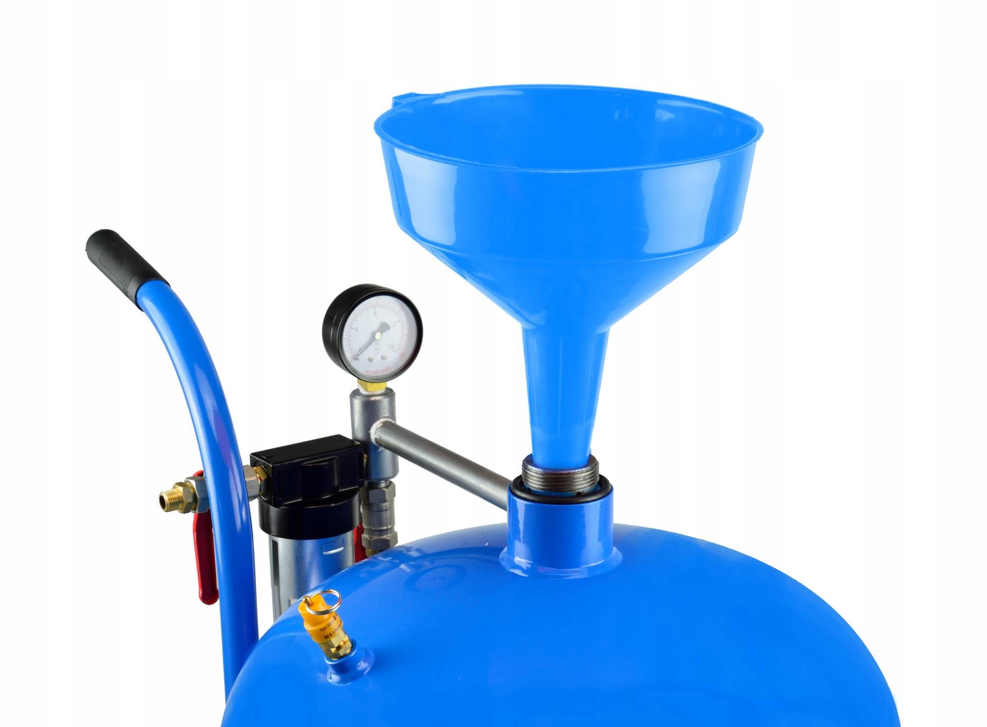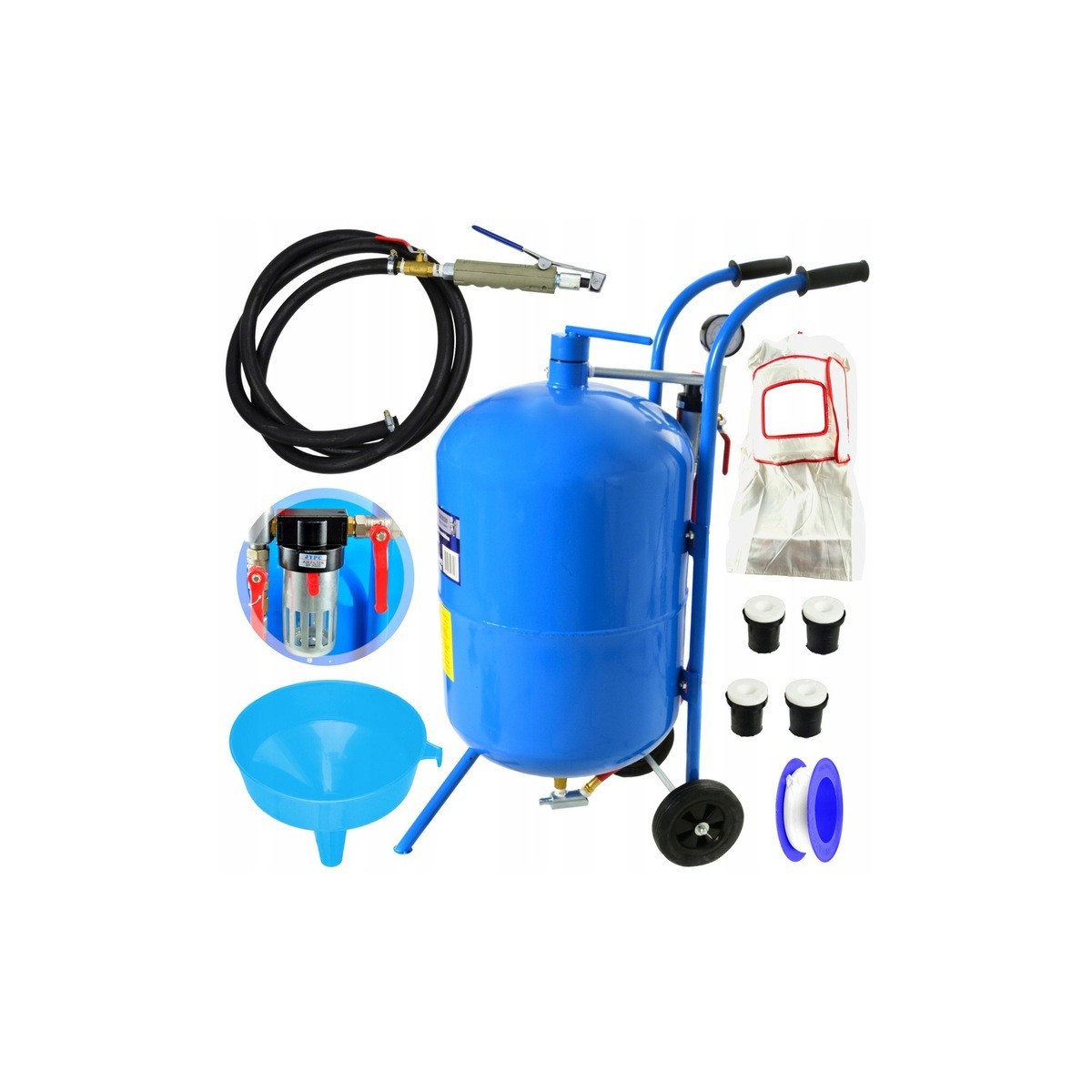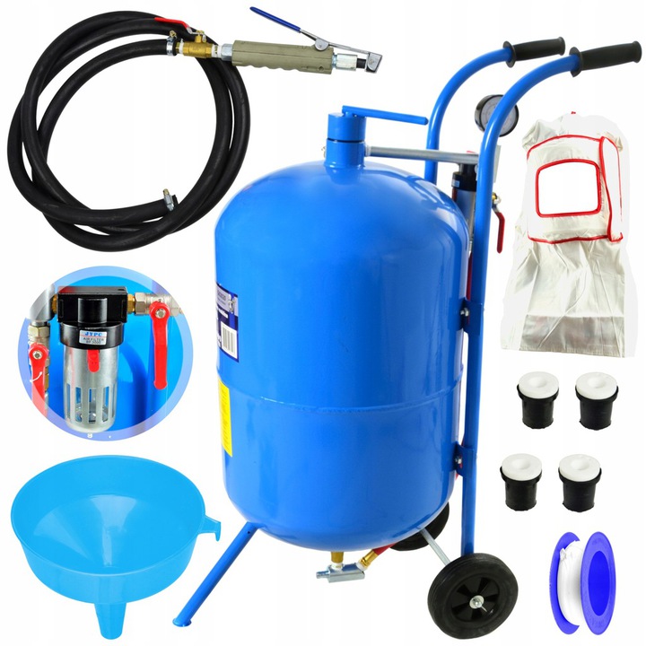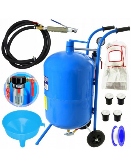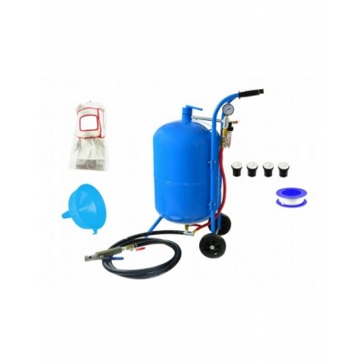 Mobilna piaskarka syfonowa ze zbiornikiem o pojemności aż 76 litrów oraz ciśnieniem roboczym od 4,1 do 8,6 bar.