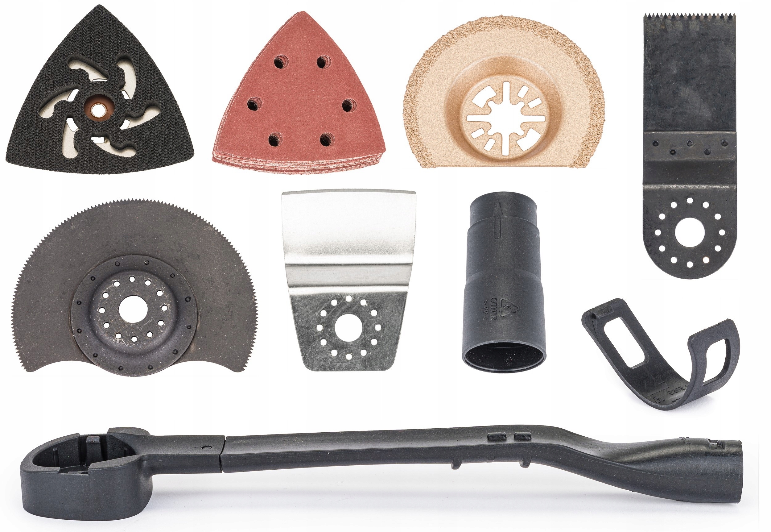 5 wymiennych końcówek przeznaczonych do cięcia, szlifowania, skrobania metalu, drewna lub ceramiki