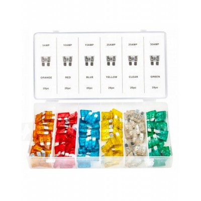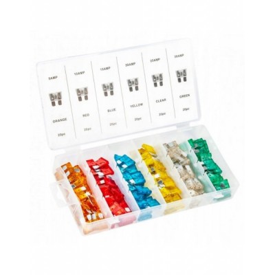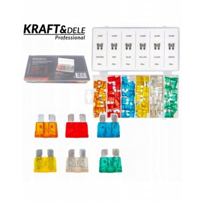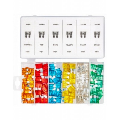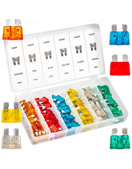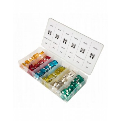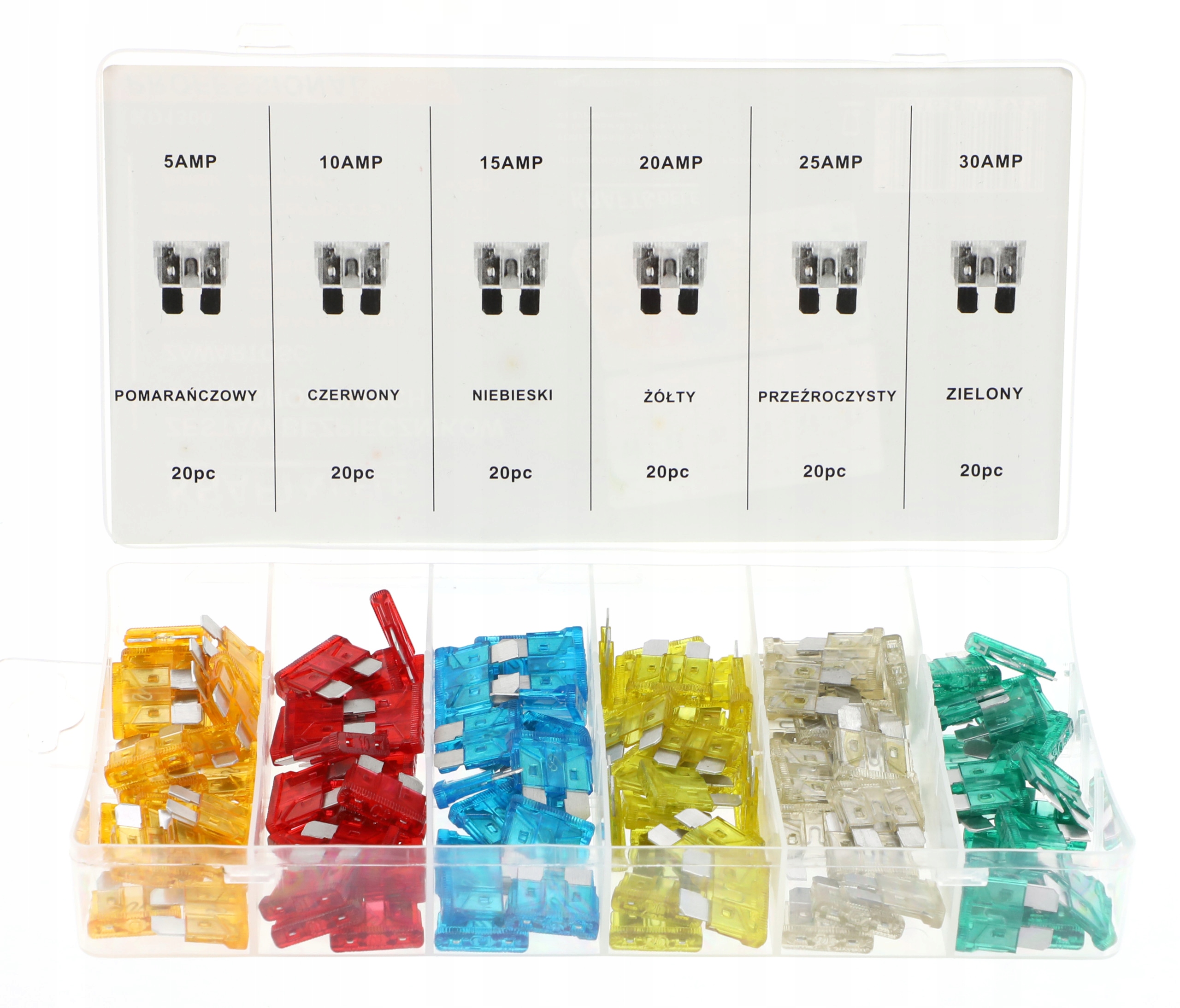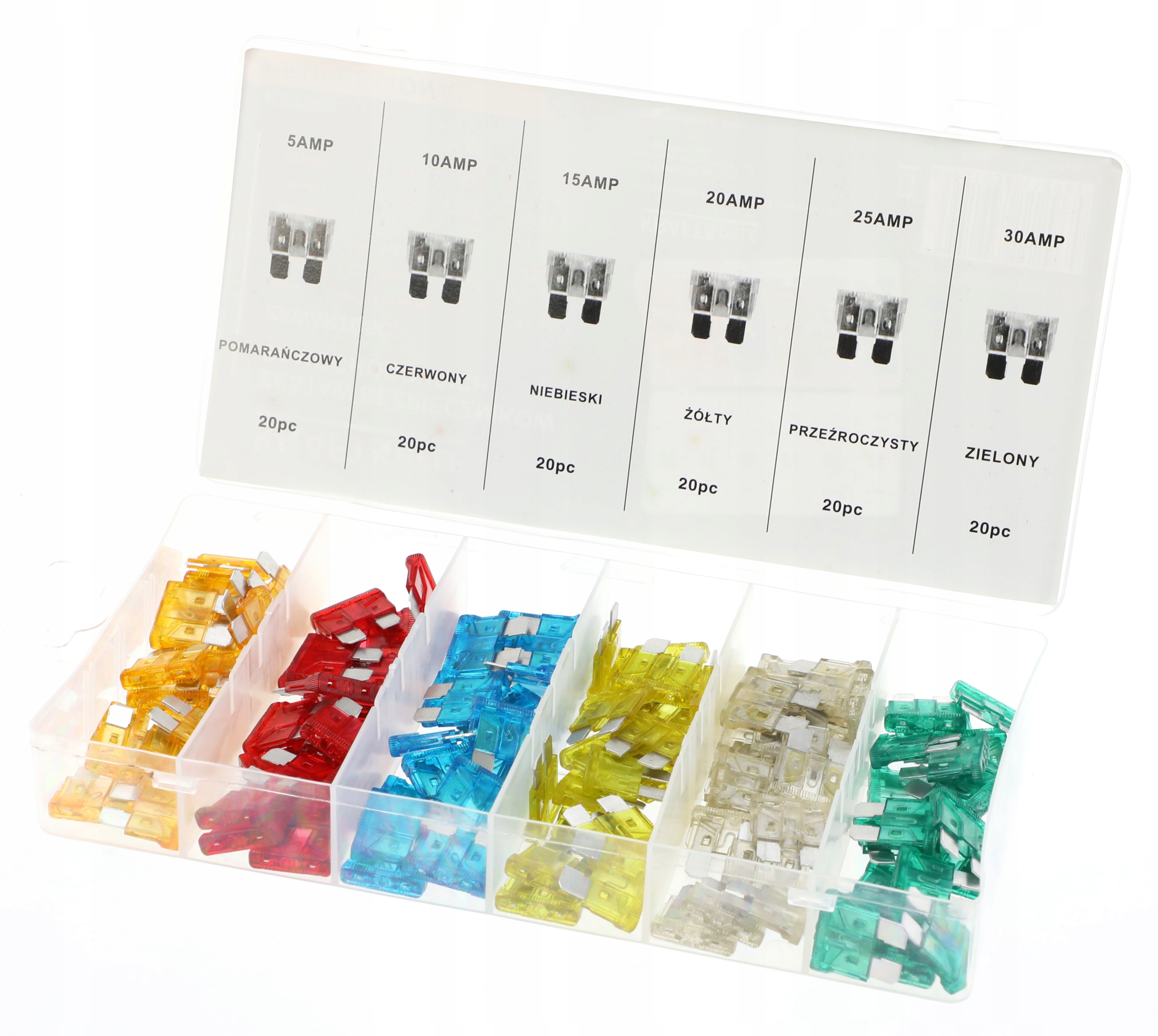 Zestaw bezpieczników samochodowych zawierający 120 elementów o różnej mocy. Bezpieczniki choć są niewielkich rozmiarów pełnia ważną rolę i są odpowiedzialne za prawidłową pracę urządzeń elektrycznych w samochodzie.