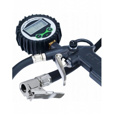 Pistolet z manometrem cyfrowym, to niezbędne urządzenie w serwisie ogumienia. Posiada on solidną konstrukcje, wyposarzony w zawór spustowy oraz cyfrowy manometr który posiada gumową obudowę.