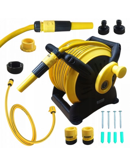 Zestaw marki BOXER to praktyczne i kompletne rozwiązanie do podlewania ogrodu. W skład zestawu wchodzi wysokiej jakości wąż ogrodowy na stabilnym wózku z kołowrotkiem, który znacznie ułatwia przechowywanie i użytkowanie węża. Produkt został wykonany z trwałych materiałów, dzięki czemu jest odporny na uszkodzenia i zapewnia długą żywotność.