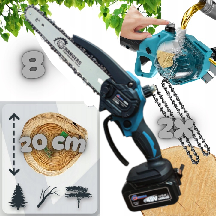 Aku pilarka łańcuchowa marki Rangers z prowadnicą 8" i systemem smarowania łańcucha jest doskonałym narzędziem do cięcia gałęzi, mniejszych drzew i innych prac związanych z pielęgnacją roślin. Dzięki kompaktowej i bezprzewodowej konstrukcji zapewnia maksymalną swobodę ruchu, co ułatwia pracę w trudno dostępnych miejscach.