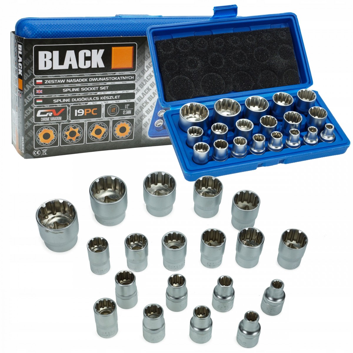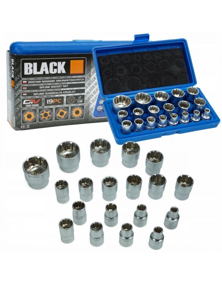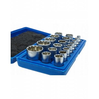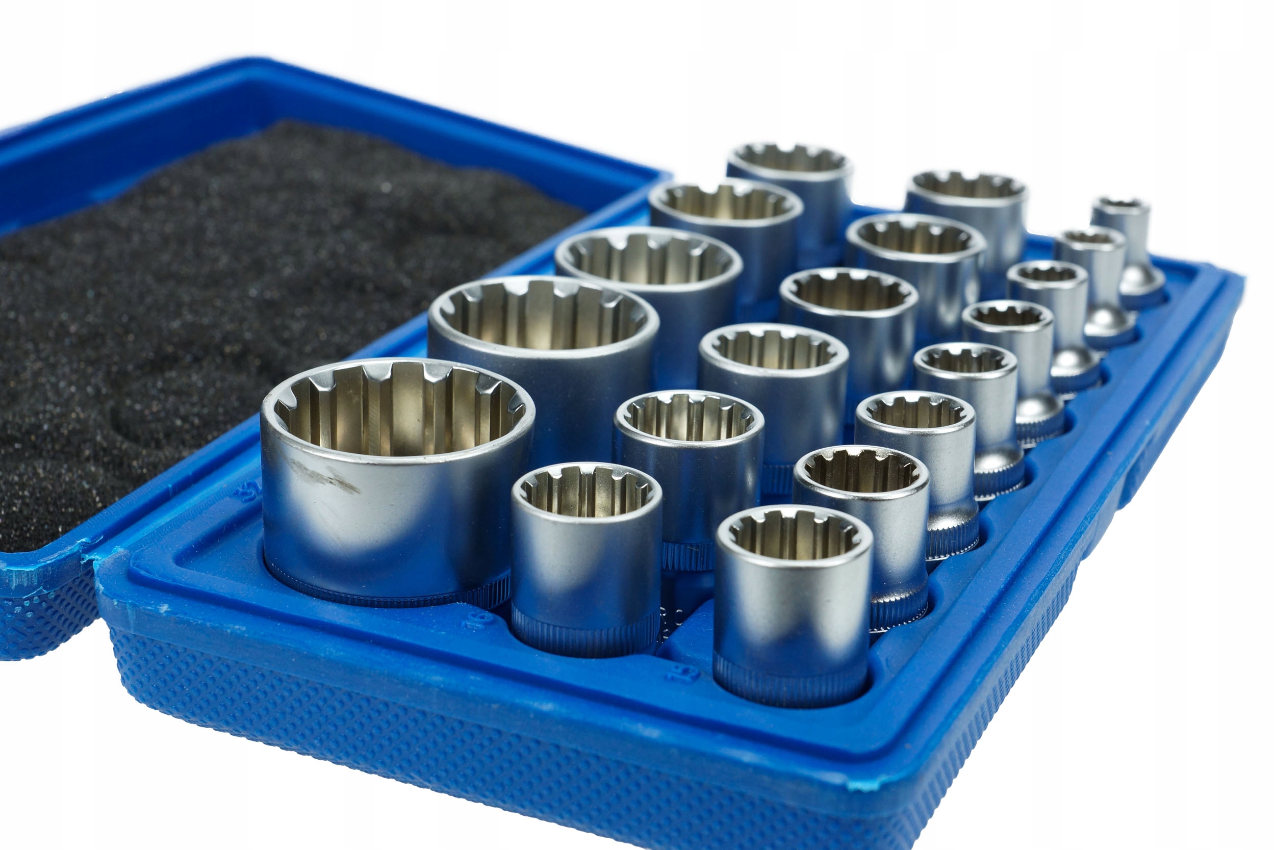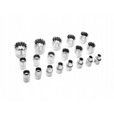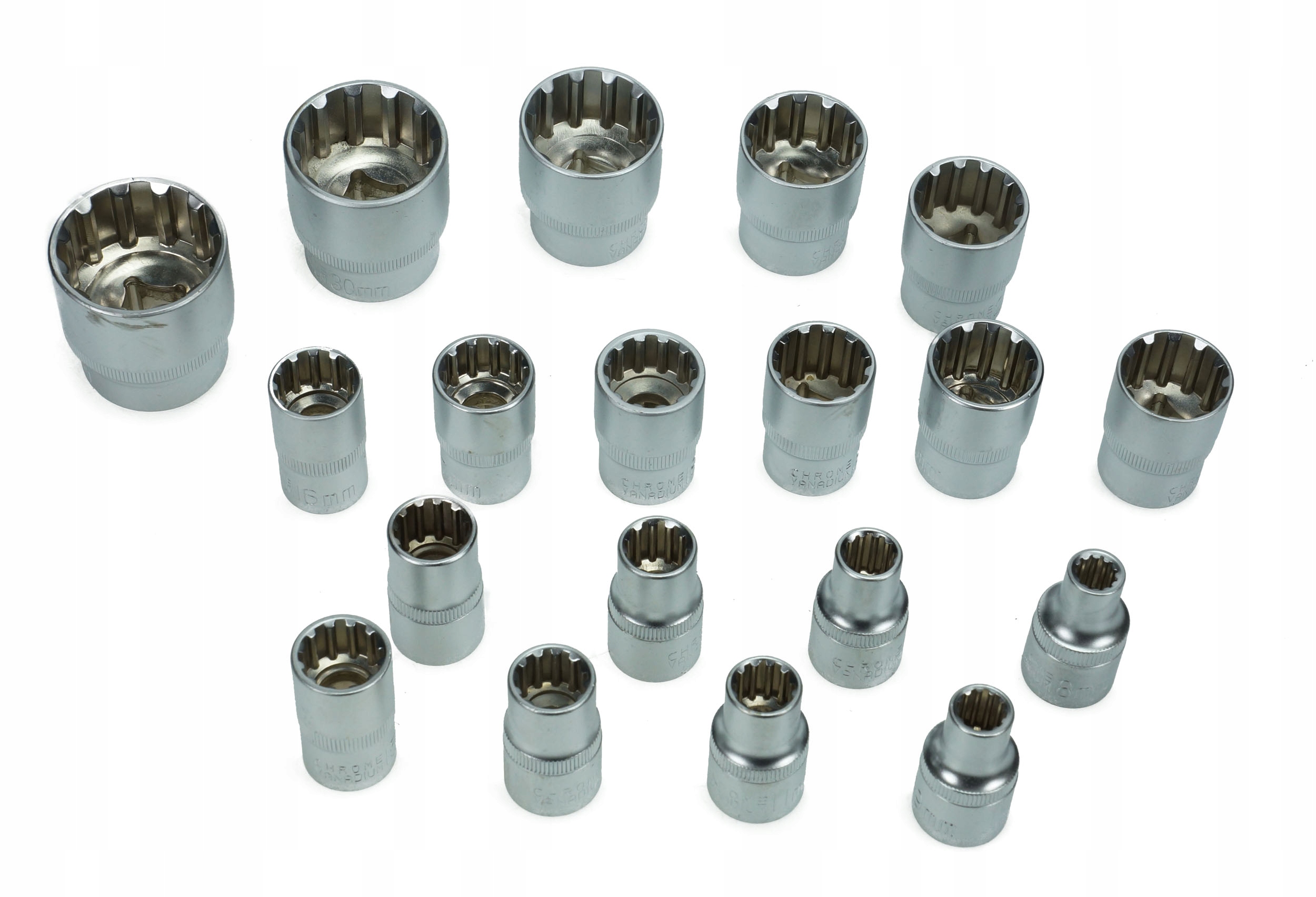 W zestawie znajdziecie 19 sztuk SPLINEów w popularnych rozmiarach. Nasadki opracowane z myślą o profesjonalnym zastosowaniu. Wykonane są z wytrzymałej stali chromowo-wanadowej