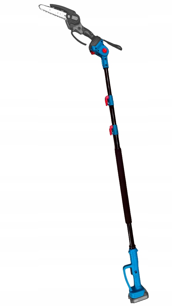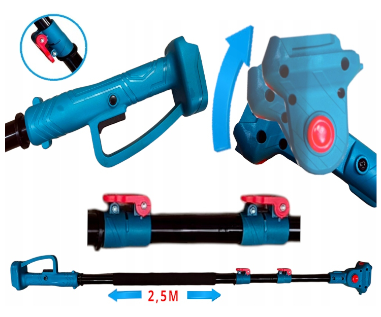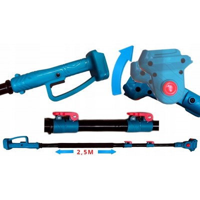 Wysięgnik. Idealnie nadaje się do przycinania i podcinania gałęzi. Regulacja długości w zakresie od 125 do 250 cm. Regulowany kąt cięcia w zakresie od 0 do 90 stopni. Podwójny teleskop.