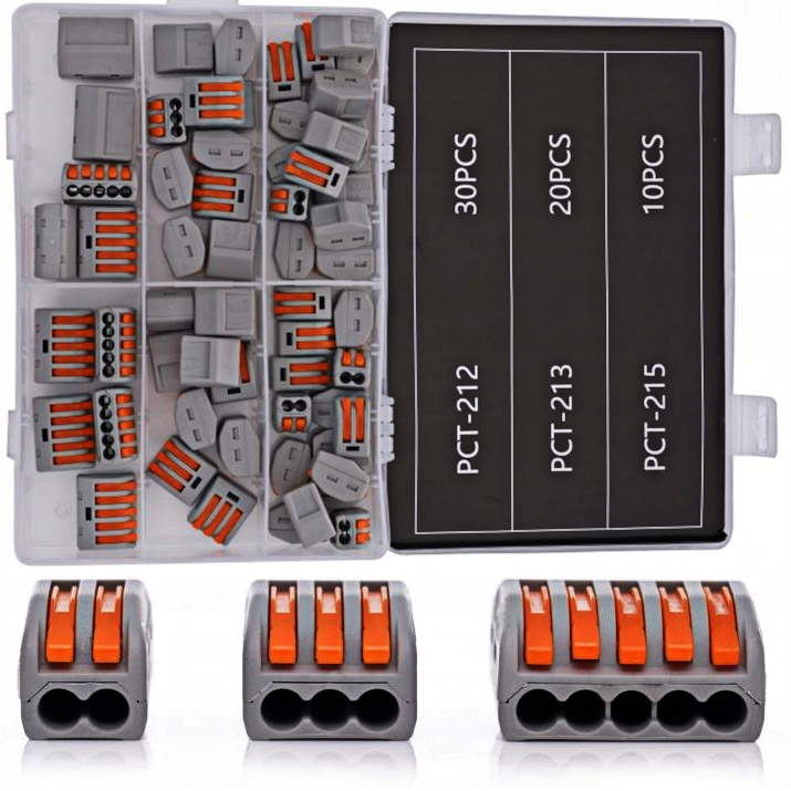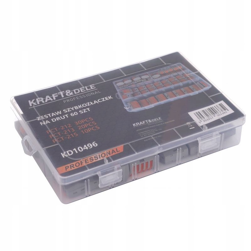 Zestaw 60szt. szybkozłączek na drut w 3 rozmiarach polskiej marki Kraft&Dele o modelu KD10496. Całość zapakowana w wygodne przezroczyste opakowanie z wydzielonymi przegrodami na poszczególne rozmiary.