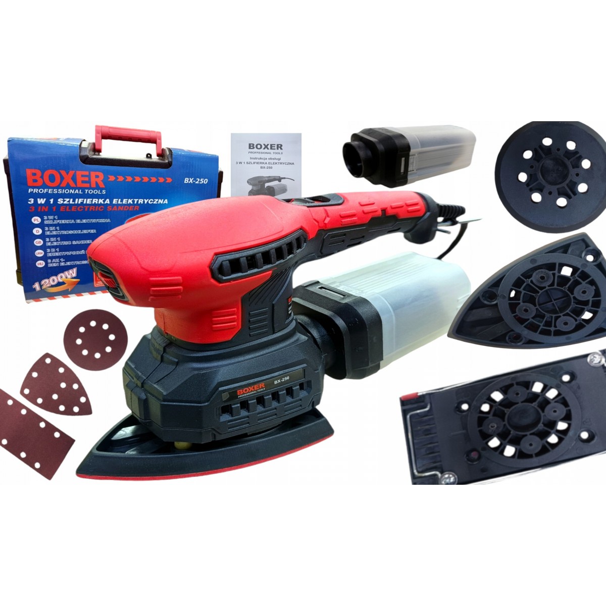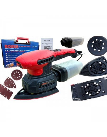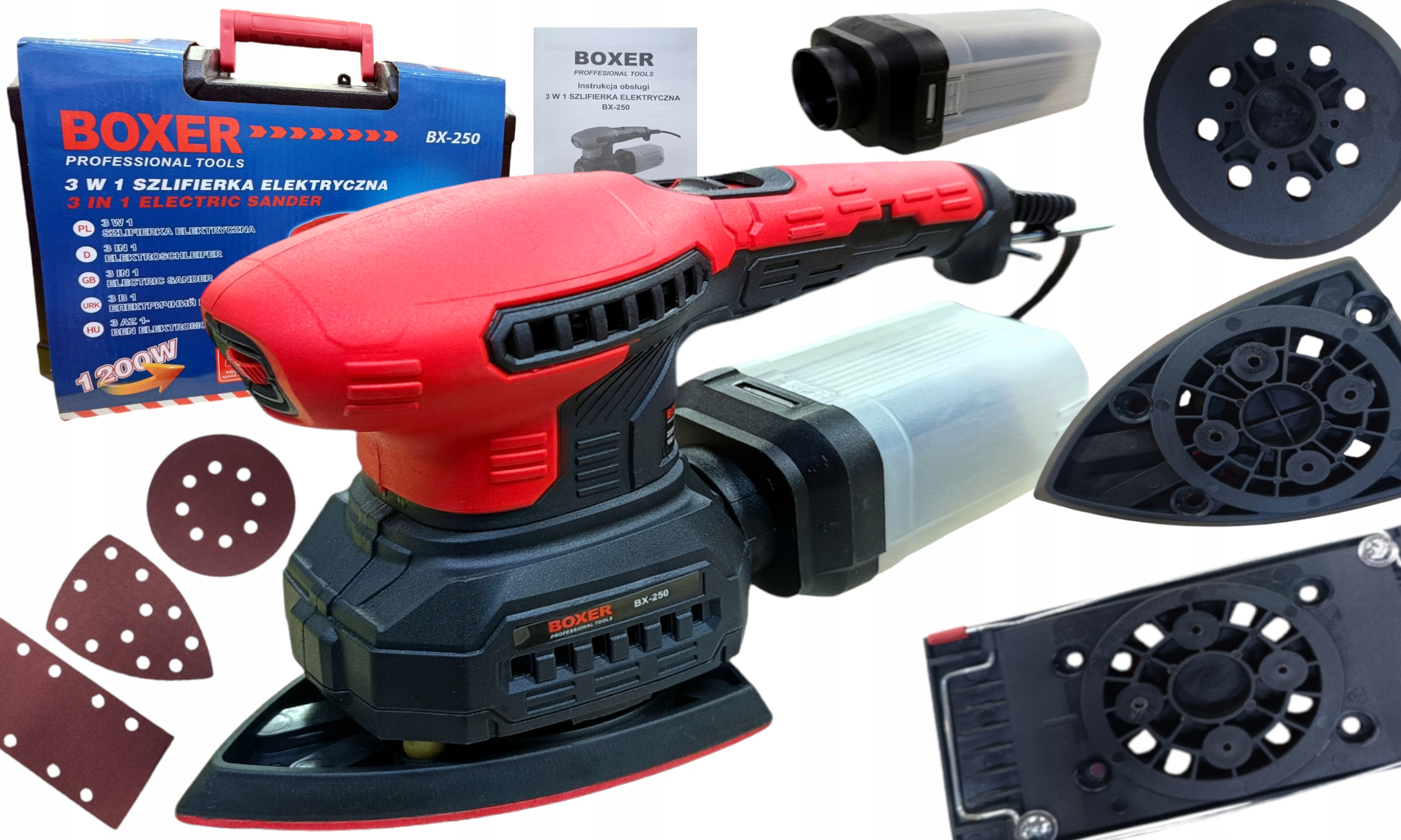 W celu szlifowania wielofunkcyjnego - mimośrodowego i oscylacyjnego szlifierka posiada możliwość zamontowania 3 różnych padów szlifierskich (Orbitalny - do szlifowania płaskich powierzchni; Trójkątny - do szlifowania powierzchni nierównych; Prostokątny - do szlifowania narożników i krawędzi).
