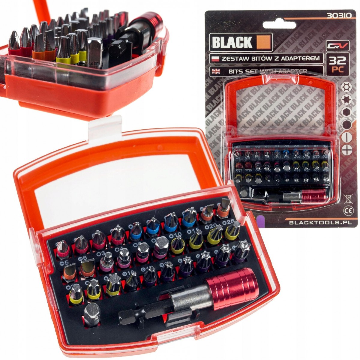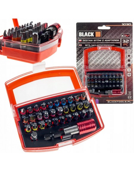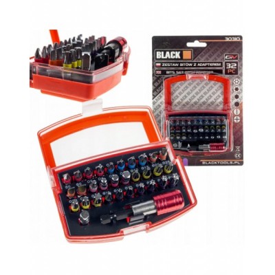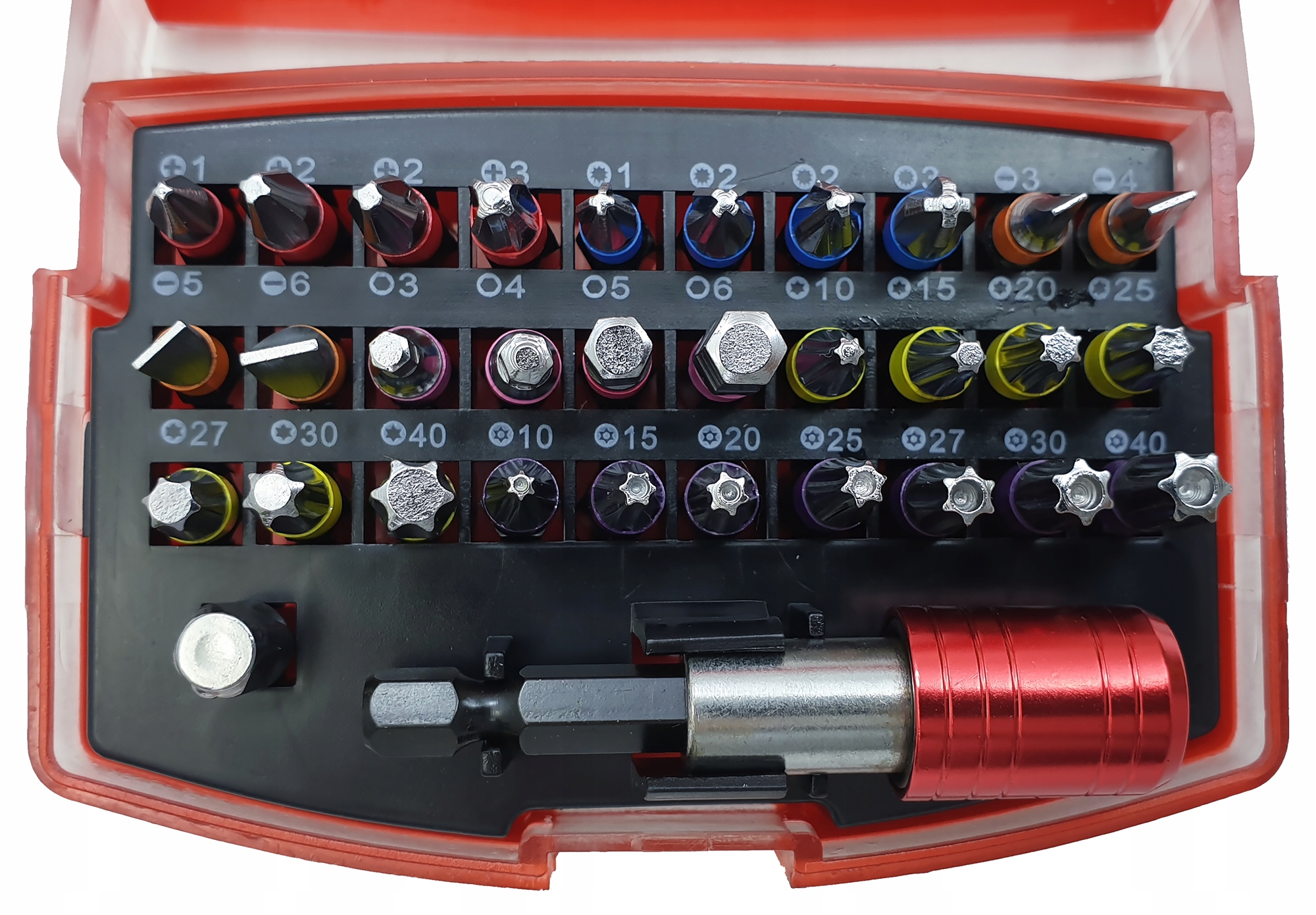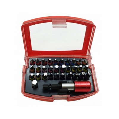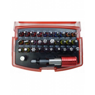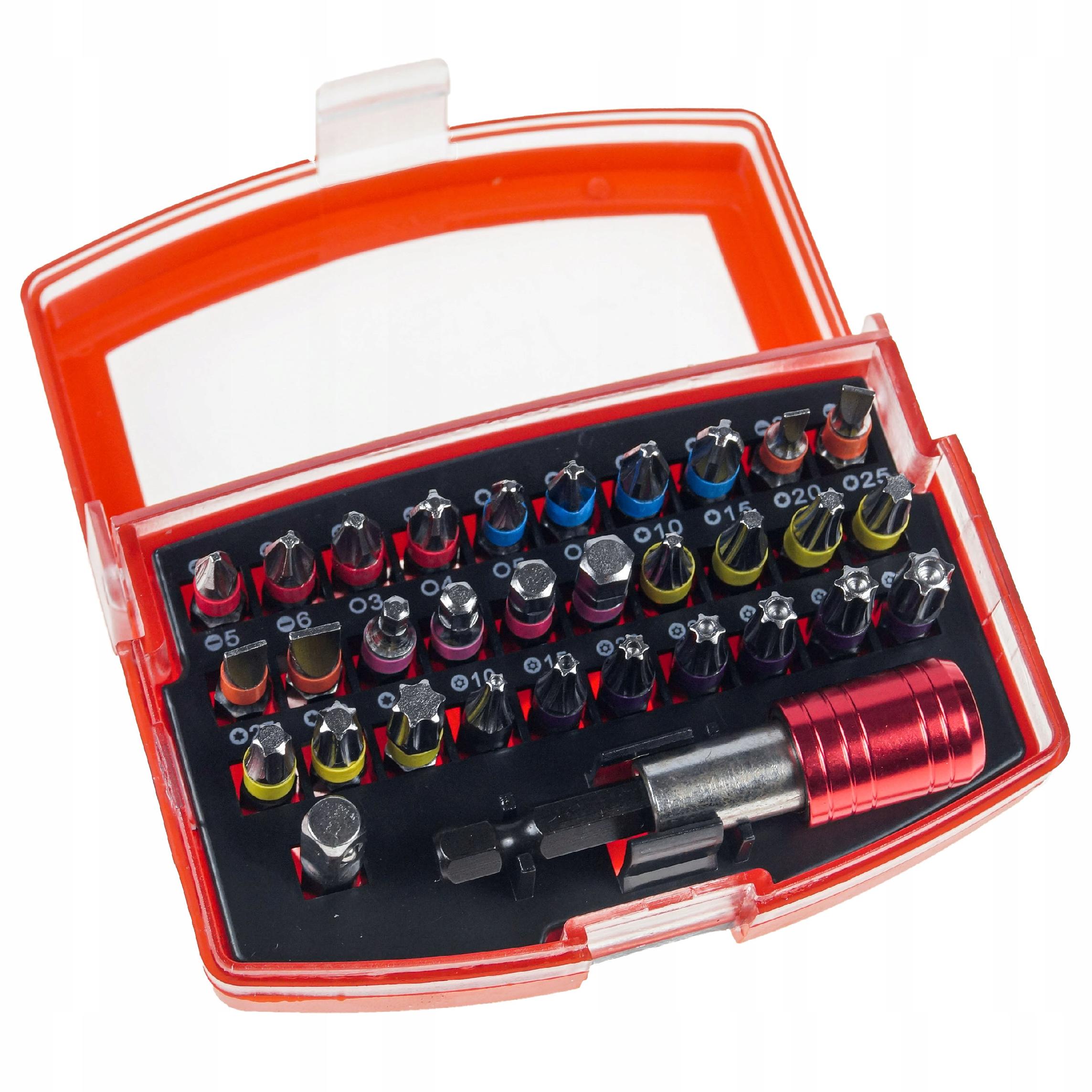 Zestaw zawiera 31 elementów, w tym: 4 bity Philips, 4 bity Pozidriv, 4 bity Slotted, 7 bitów Torx, 7 bitów Torx z otworem, 4 końcówki HEX, adapter z 1/4" sześciokąt na 1/4" kwadrat umożliwiający mocowanie nasadek 1/4", uchwyt magnetyczny 6.35mm 1/4".