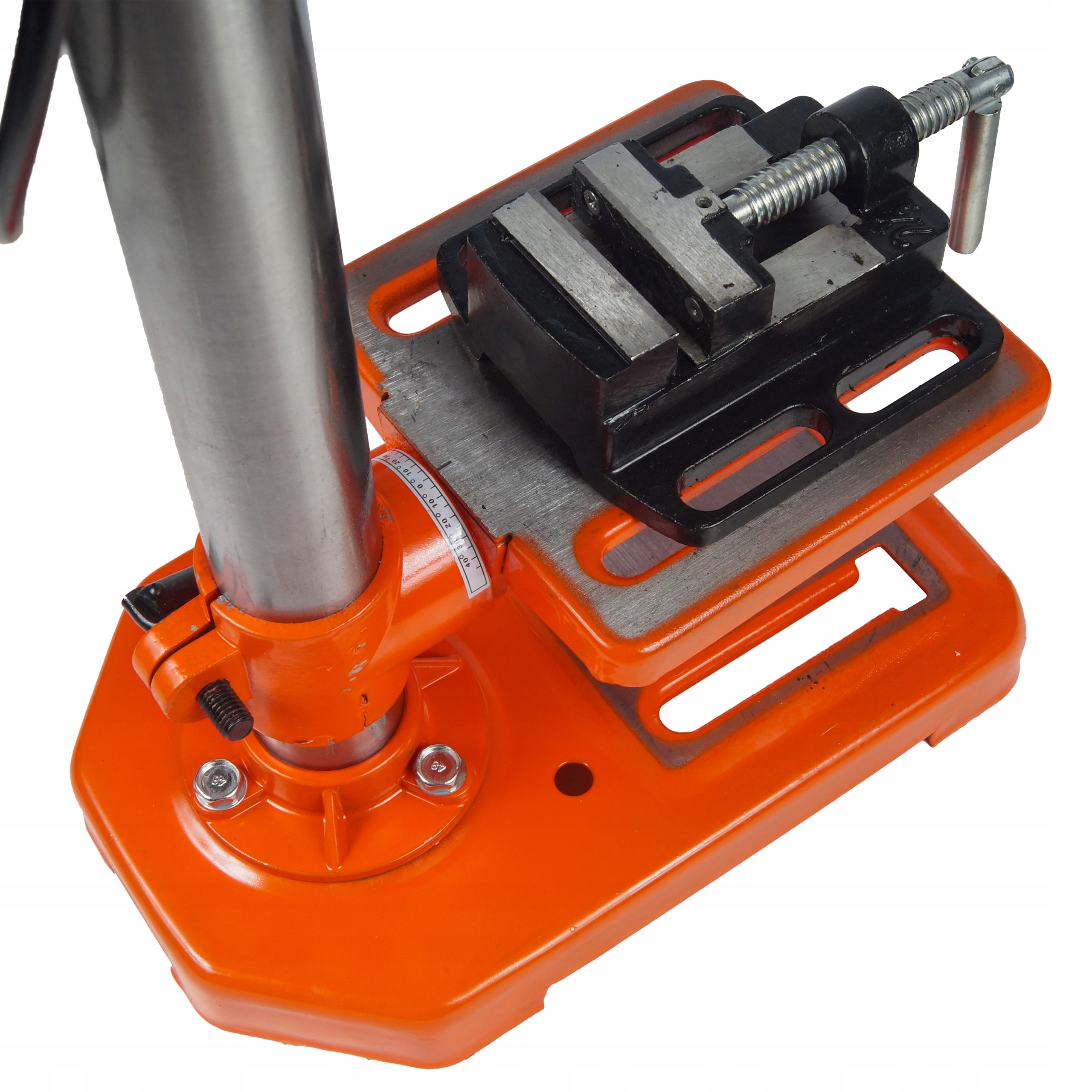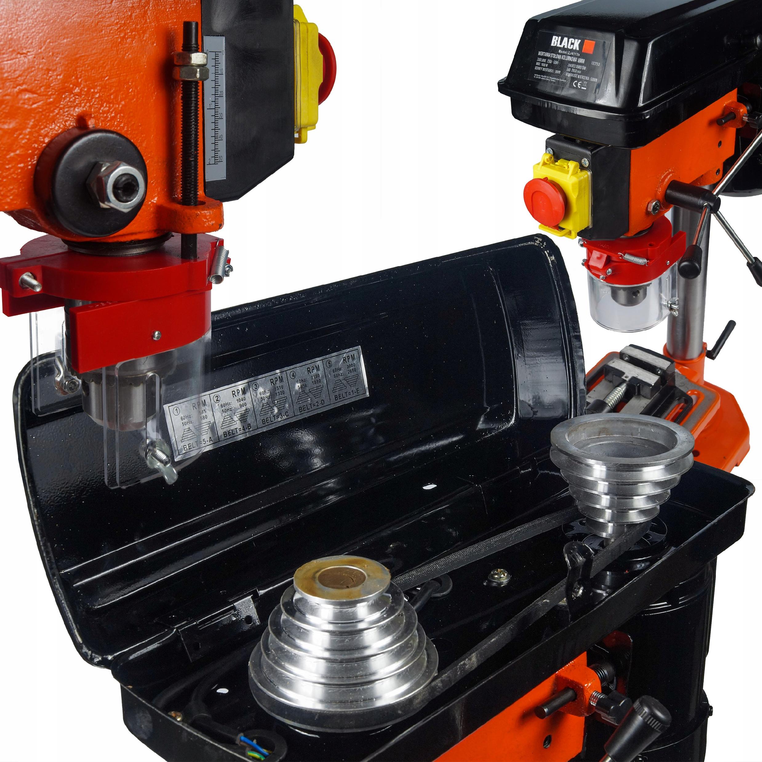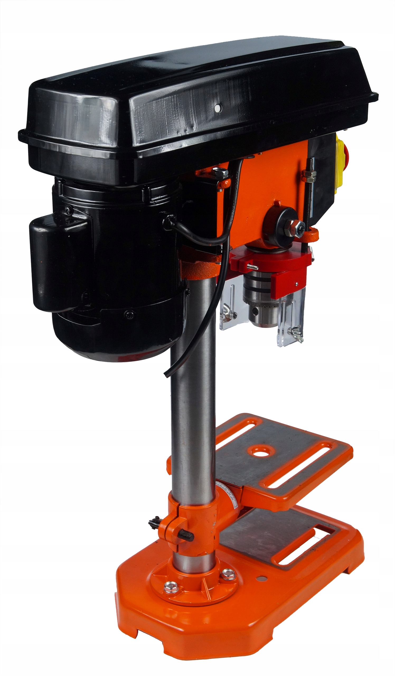 Dodatkowo wiertarka została wyposażona w wygodną prowadnicę pionową, regulację wysokości blatu, wycięcia w blacie pozwalające na pewniejsze zamocowanie obrabianego przedmiotu i komfortowe pokrętło boczne. Całość dopełnia bezpieczna, ciężka i stabilna podstawa urządzenia.