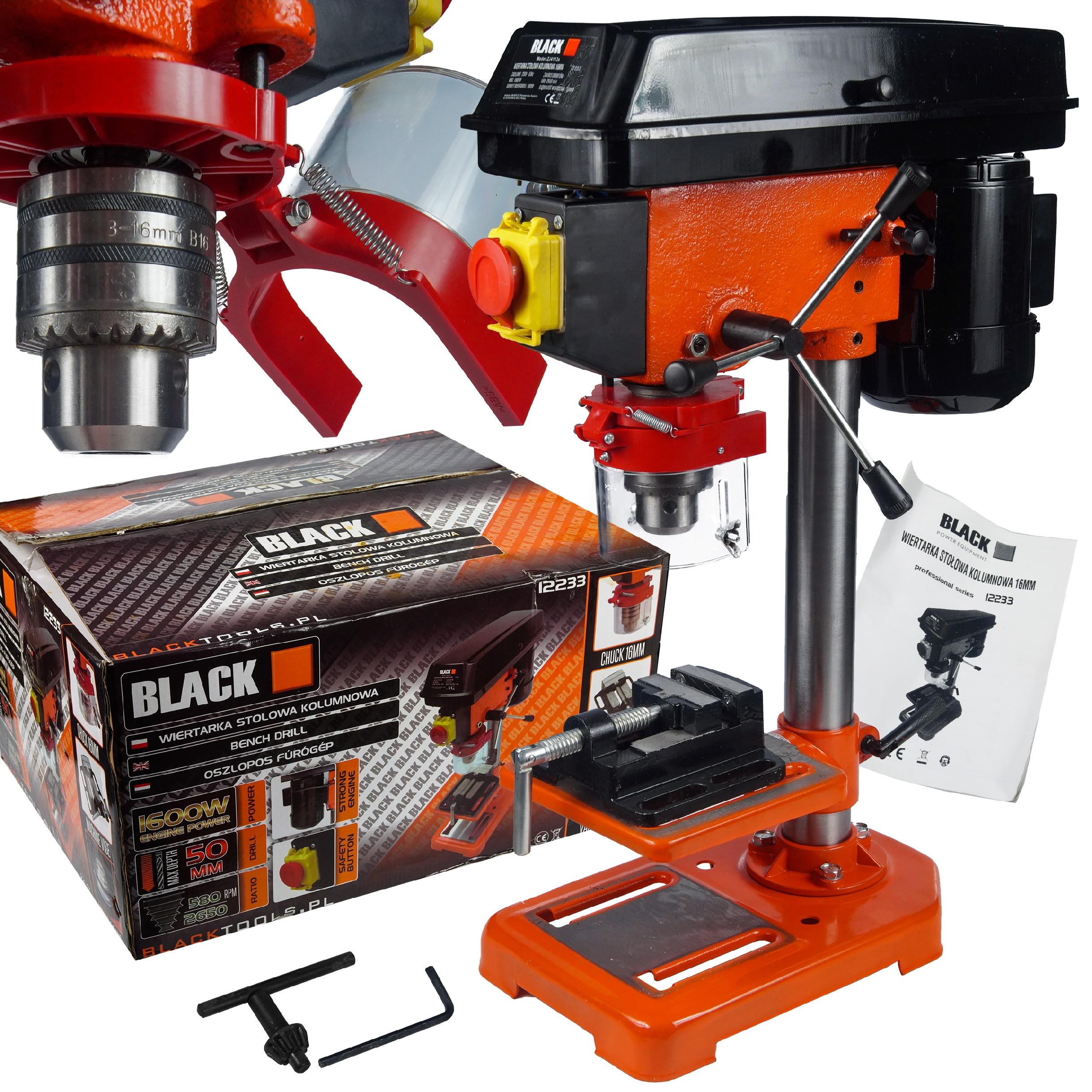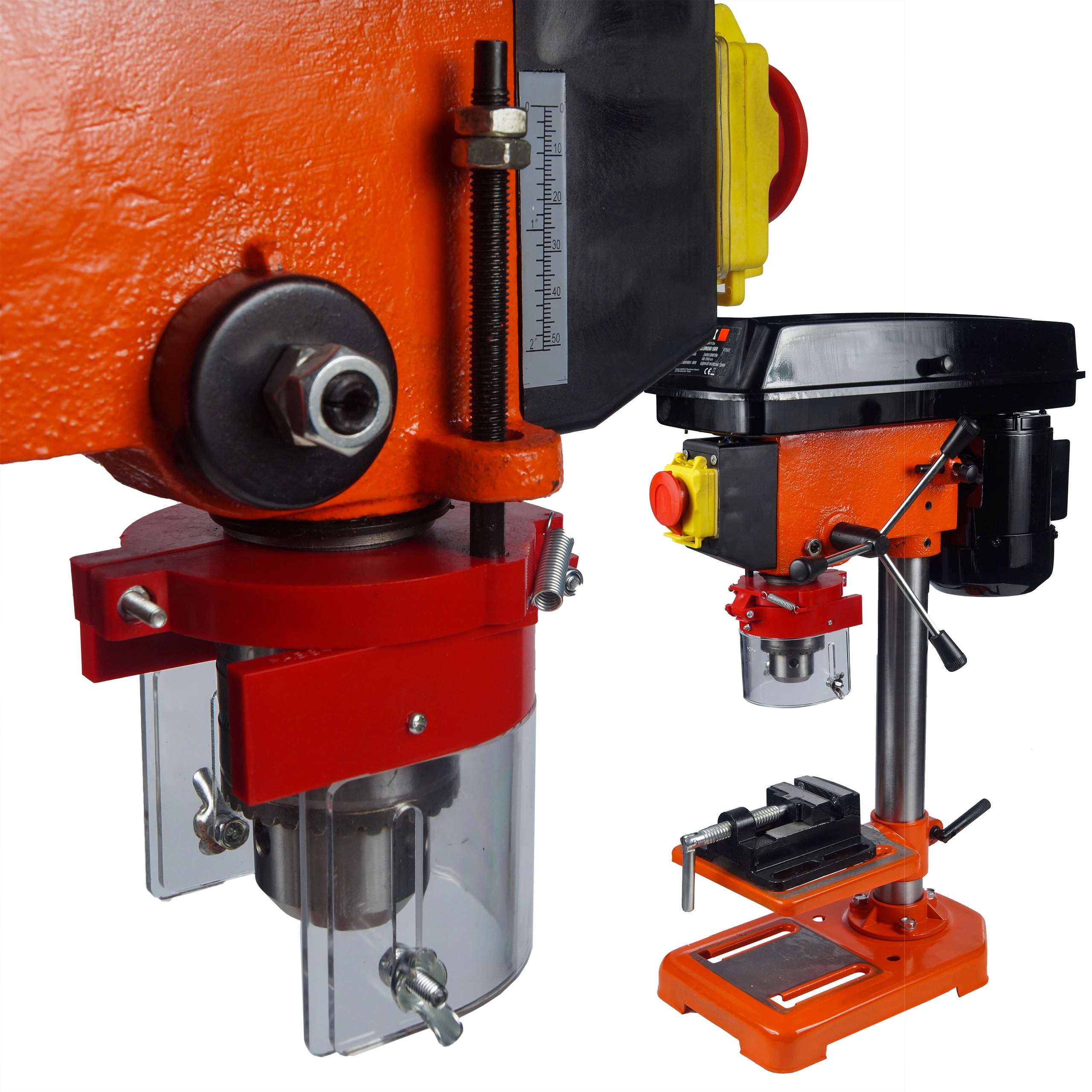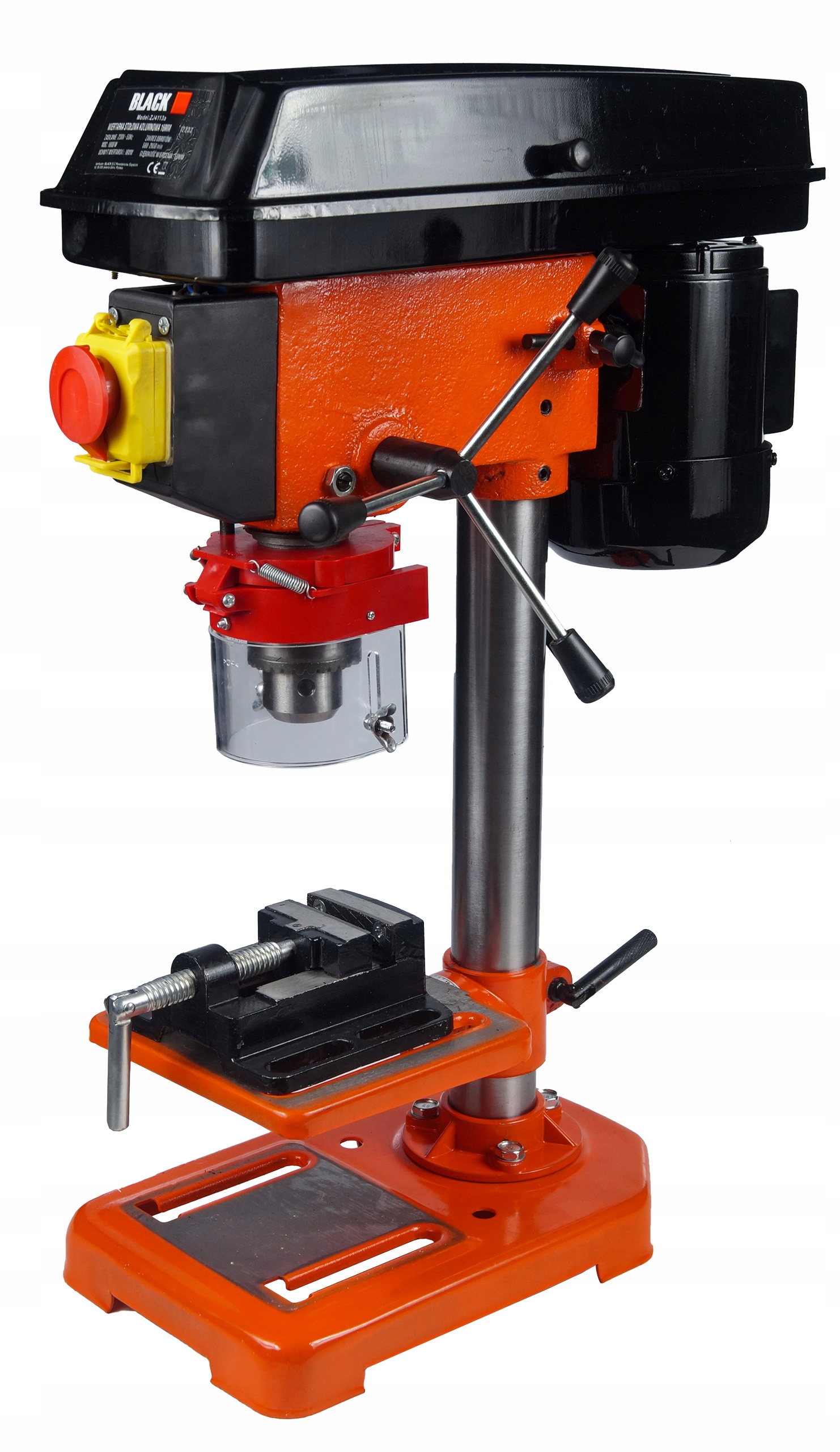 Dodatkowo wiertarka została wyposażona w wygodną prowadnicę pionową, regulację wysokości blatu, wycięcia w blacie pozwalające na pewniejsze zamocowanie obrabianego przedmiotu i komfortowe pokrętło boczne. Całość dopełnia bezpieczna, ciężka i stabilna podstawa urządzenia.