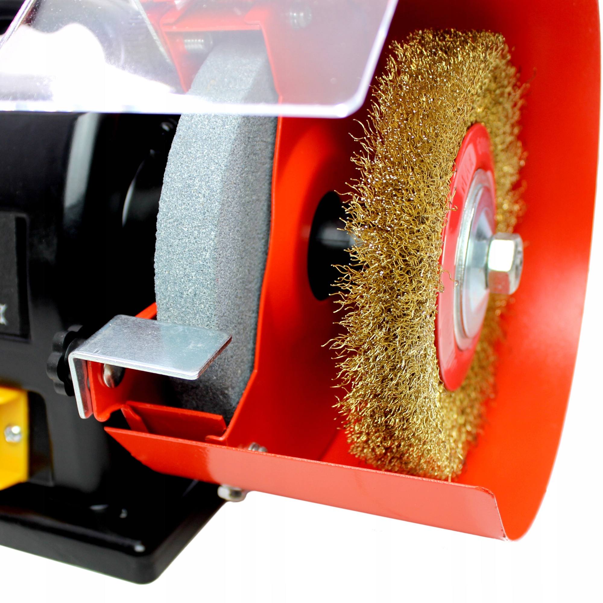 Szlifierka posiada duże, regulowane ekrany zabezpieczające przed iskrami i odpryskami, a także gumowe stopki, które zapewniają bezpieczne podparcie i tłumią drgania. Dodatkowo, w podstawie s gotowe otwory do przytwierdzenia szlifierki do blatu roboczego.