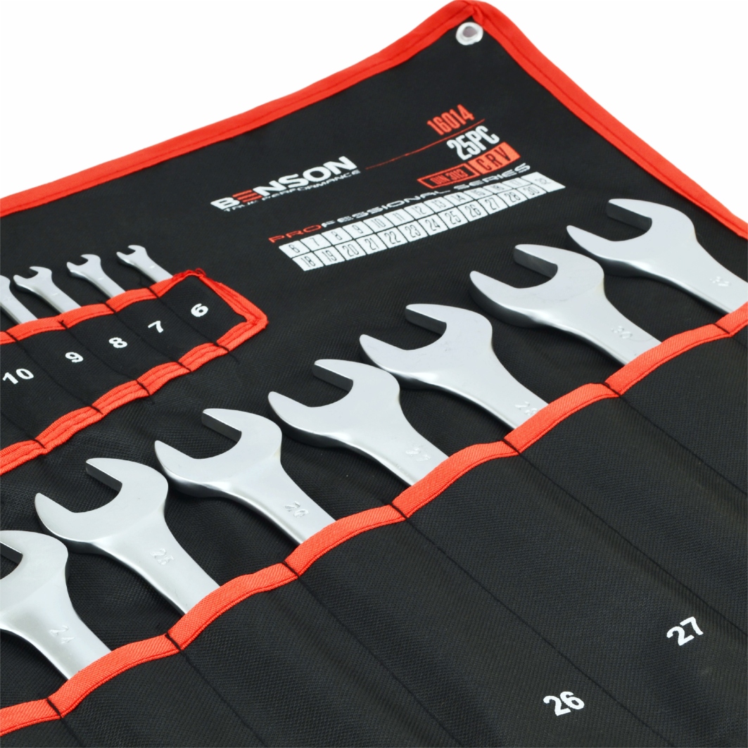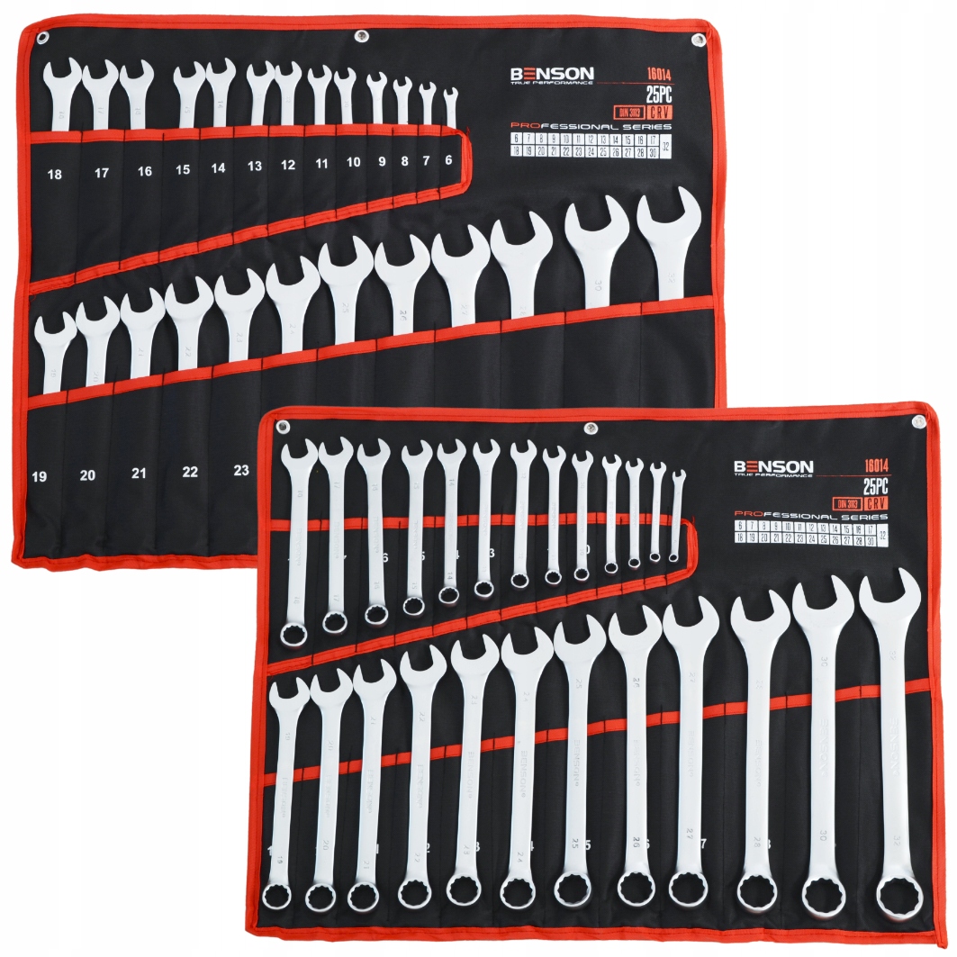 Idealny zestaw kluczy BENSON, który zapewnia niezawodność i wygodę podczas pracy! Wykonane z wysokiej jakości stali chromo-wanadowej, te klucze płasko-oczkowe są dedykowane dla profesjonalistów oraz domowych majsterkowiczów. Zestaw jest praktycznie ułożony na specjalnej płachcie z kieszonkami i nadrukowanymi rozmiarami.