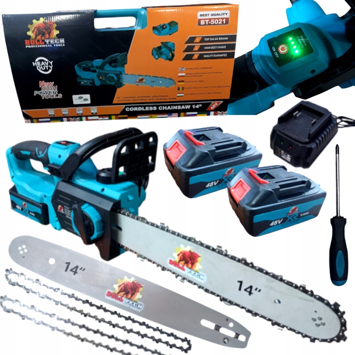 AKUMULATOROWA PILARKA PIŁA ŁAŃCUCHOWA DO DREWNA 2 X 48V 5AH 14" BULL-TECH to urządzenie o niezwykle wydajnej i zwartej konstrukcji. Dzięki solidnym materiałom i nowoczesnym technologiom, pilarka ta sprawdzi się nie tylko w pracach budowlanych w drewnie, ale również w gospodarstwie domowym, rolnictwie i sadownictwie. Pilarka została specjalnie zaprojektowana do pielęgnacji koron drzew, co czyni ją uniwersalnym narzędziem do prac przydomowych i leśnych.