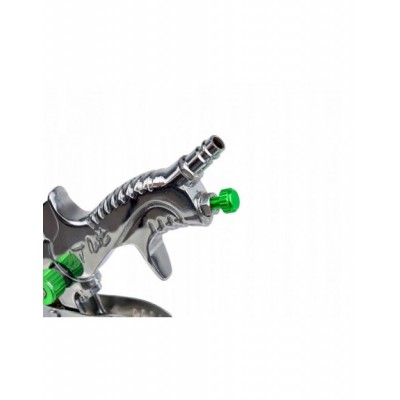 Profesjonalny pistolet lakierniczy niskociśnieniowy Dragon HVLP GEKO. Wykonany z najlepszej jakości materiałów. Pistolet jest zasilany sprężonym powietrzem. Powietrze z kompresora dociera do zbiornika z farbą i do dyszy pistoletu. Powstałe ciśnienie "wypycha" ciecz ze zbiornika, a rozpylone cząsteczki farby są wyrzucane poprzez dyszę na lakierowaną powierzchnię.