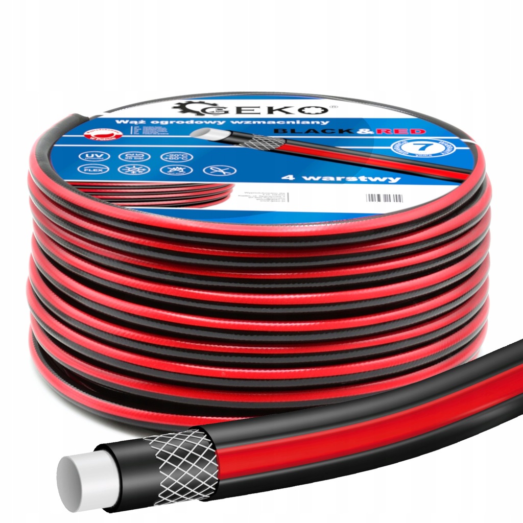 Wąż ogrodowy 4 - warstwowy, wzmacniany Black&Red marki Geko o średnicy 3/4" i długości 50 mb. Doskonale nadaje się do podlewania ręcznego oraz podłączenia różnych urządzeń zraszających. Ciśnienie rozrywające sięga aż 25 barów.