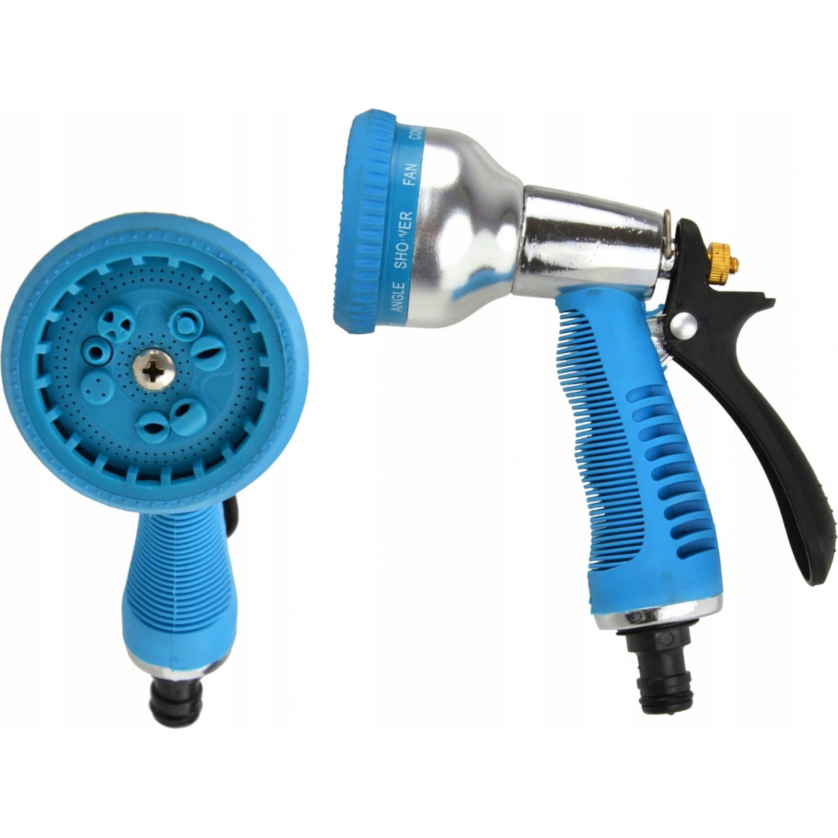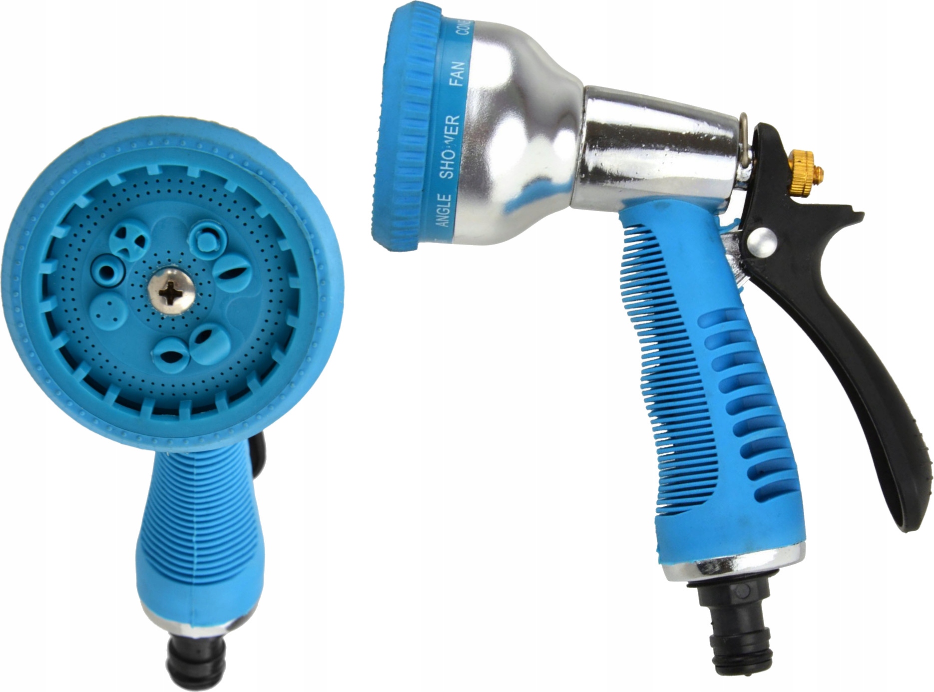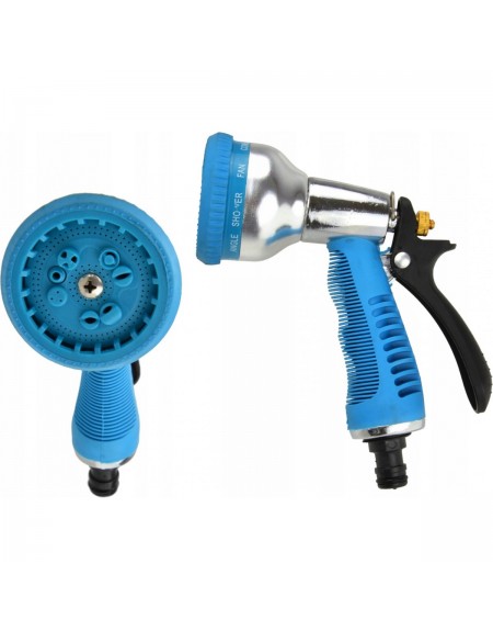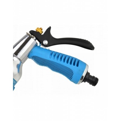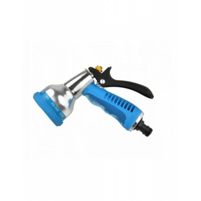 Pistole zraszający 10-funkcyjny (srebrny) BLUE LINE Dzięki wielofunkcyjności zraszania pistolet doskonale się sprawdzi się przy podlewaniu rabat oraz większych powierzchni w ogrodzie. Pistolet wykonany został z metalu. Komfort i wygodę podczas pracy zapewnia ergonomiczna rękojeść z miękkiego antypoślizgowego tworzywa sztucznego. Cechy produktu: 10-funkcji zraszania: wachlarzowy poziomy, kątowy, wachlarzowy pionowy, sitko, prosty, stożek, kwadratowy, cienki prosty, mgła, spieniony wykonany z metalu ergonomiczna antypoślizgowa rękojeść blokada pracy ciągłej