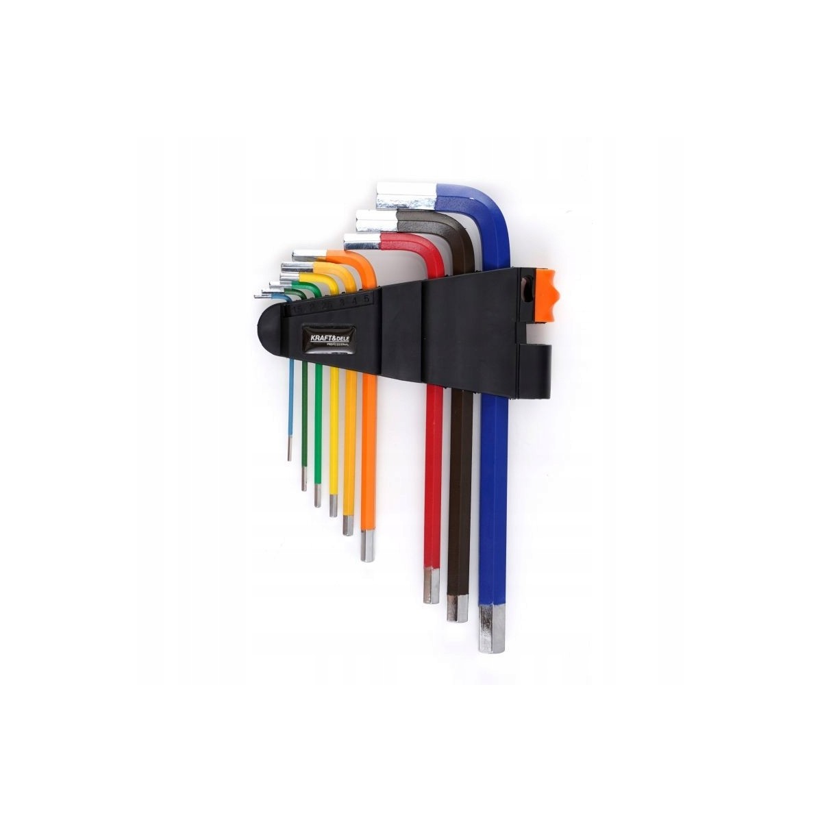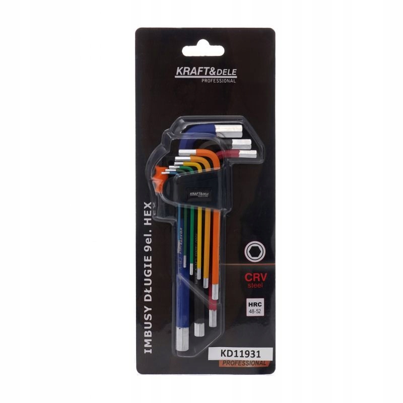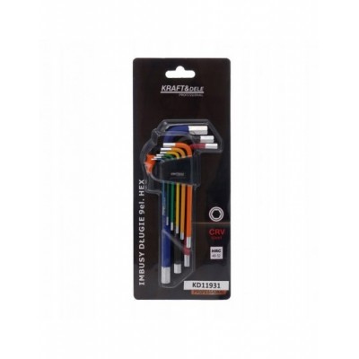 Zestaw kolorowych imbusów marki Kraft&Dele model KD11931 posiadają specjalną końcówkę z otworem dostosowanym do współpracy że śrubami typu HEX.