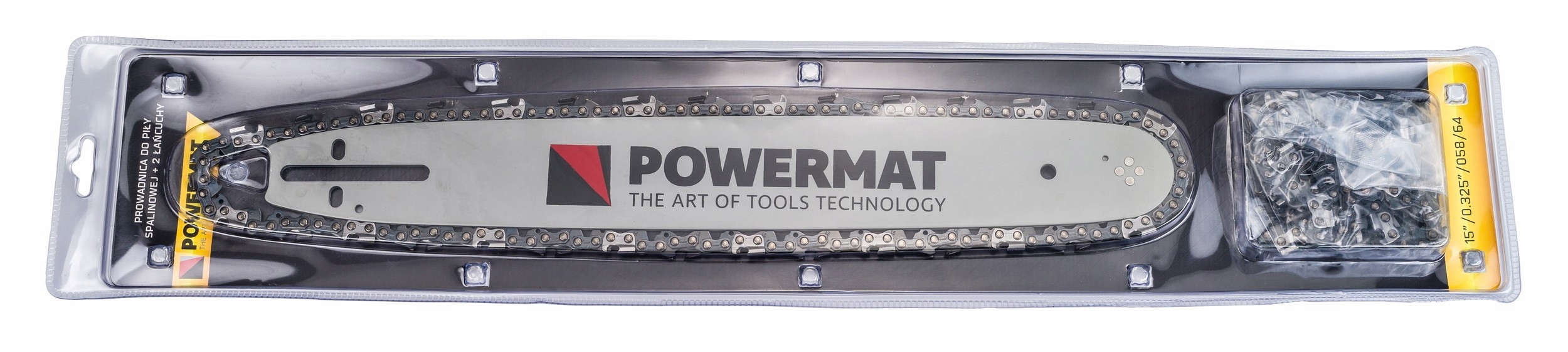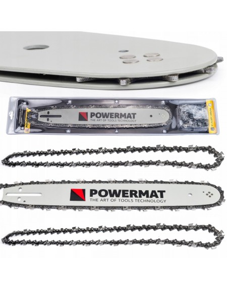 Prowadnica została wykonana z wytrzymałego materiału odpornego na ścieranie oraz temperatury występujące podczas pracy. Zestaw pasuje do pił spalinowych pracujących z łańcuchami o skoku 0,325" i szerokością ogniwa prowadzącego 1,5mm między innymi do pił POWERMAT, HUSQVARNA, Makita, Nac Dolmar i odpowiedników.