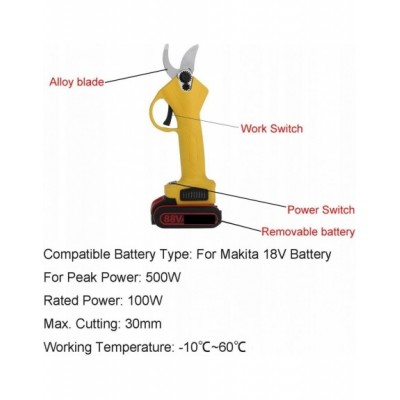 Lekkie i przenośne: Elektryczne nożyce do przycinania mają lekką konstrukcję, ergonomiczny kształt, są łatwe w obsłudze, oszczędzają czas i energię oraz przycinają przez długi czas bez zmęczenia. Nadaje się do przycinania ogrodów, przycinania grubych gałęzi, szczepienia drzew owocowych itp.