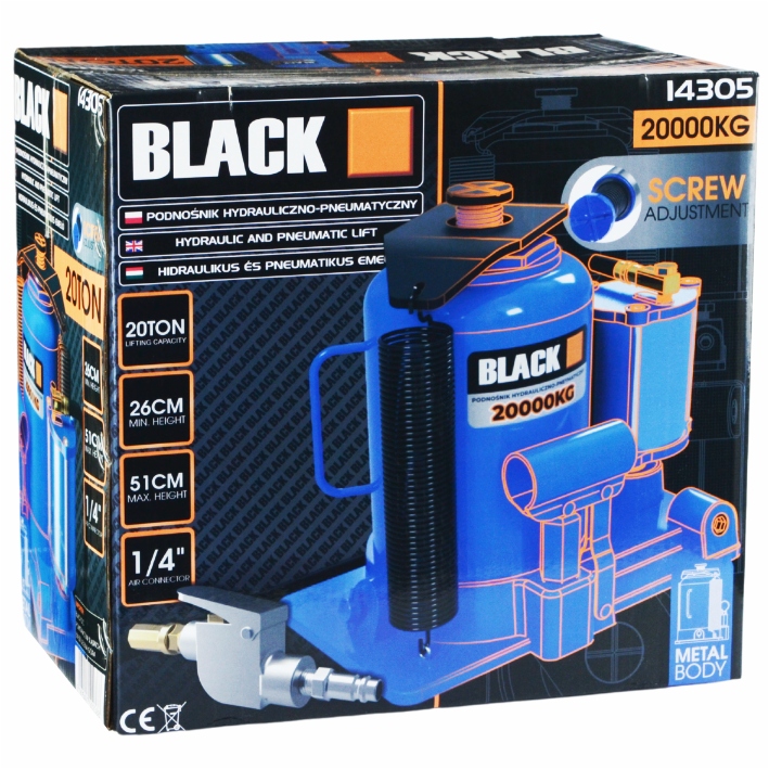 Podnośnik hydrauliczno-pnełmatyczny firmy BLACK to idealne rozwiązanie stosowane w profesjionalnych warsztatach samochodowych obsługujących pojazdy o dużej masie własnej (autobusy, samochody ciężarowe itp.) jednak znajdzie również zastosowanie w przydomowych garażach. Prosta, solidna konstrukcja zwiększa bezawaryjność urządzenia. Małe rozmiary gwarantują łatwość w użytkowaniu i dużą mobilność.