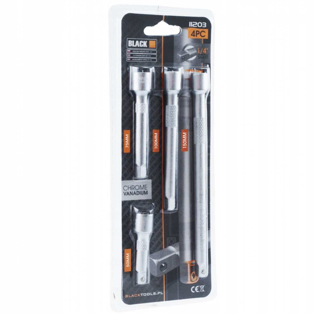Zestaw przedłużek firmy BLACK służą do przykręcania i odkręcania śrub znajdujących się w trudno dostępnych miejscach, np. pod maską samochodu, potrzebne Ci będzie narzędzie o odpowiedniej długości. Stworzysz je, korzystając z dostępnych tutaj przedłużek. Wykonane z chromowo-wanadowej ( CRv)stali cechują się doskonałą trwałością i żywotnością, a więc posłużą Ci przez długi czas w nienagannym stanie.