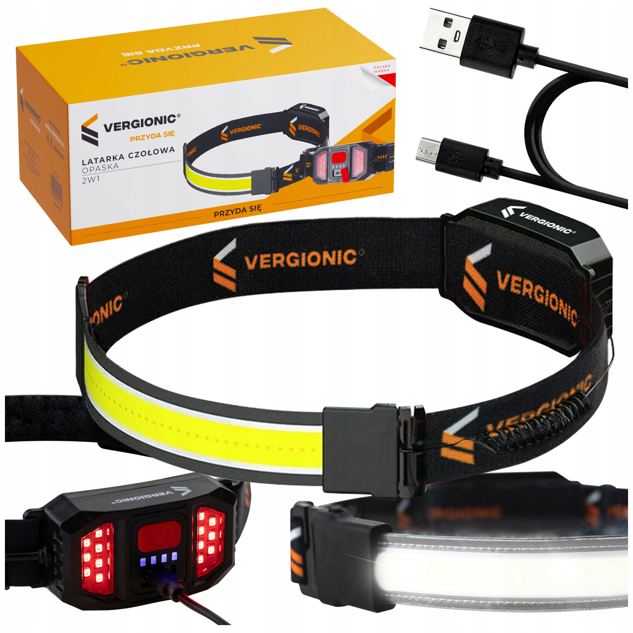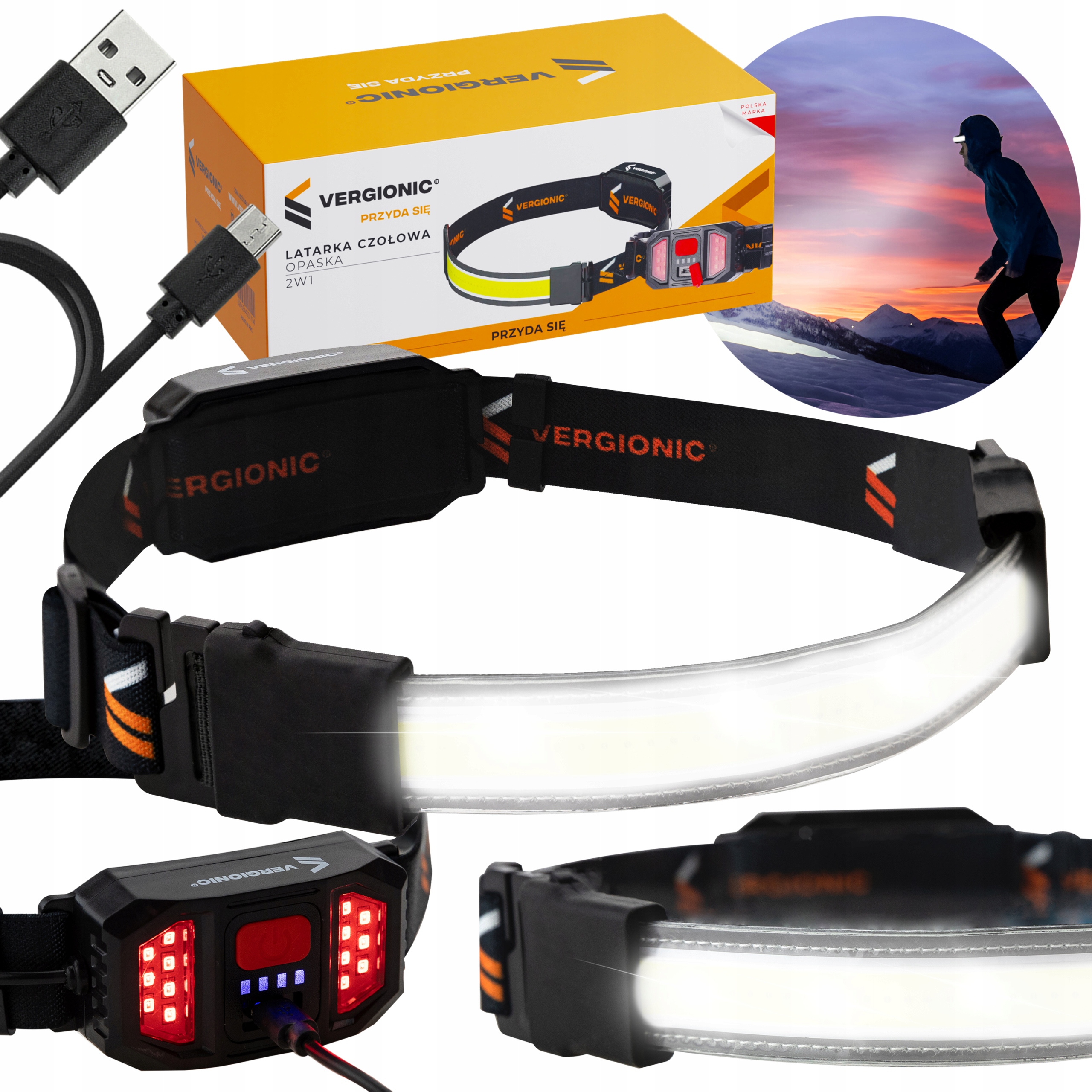 ✅ Nasza latarka wyposażona jest w dwie lampki – przednią i tylną. Przednia posiada mocną białą taśmę LED COB, która świeci na odległość 50 m.