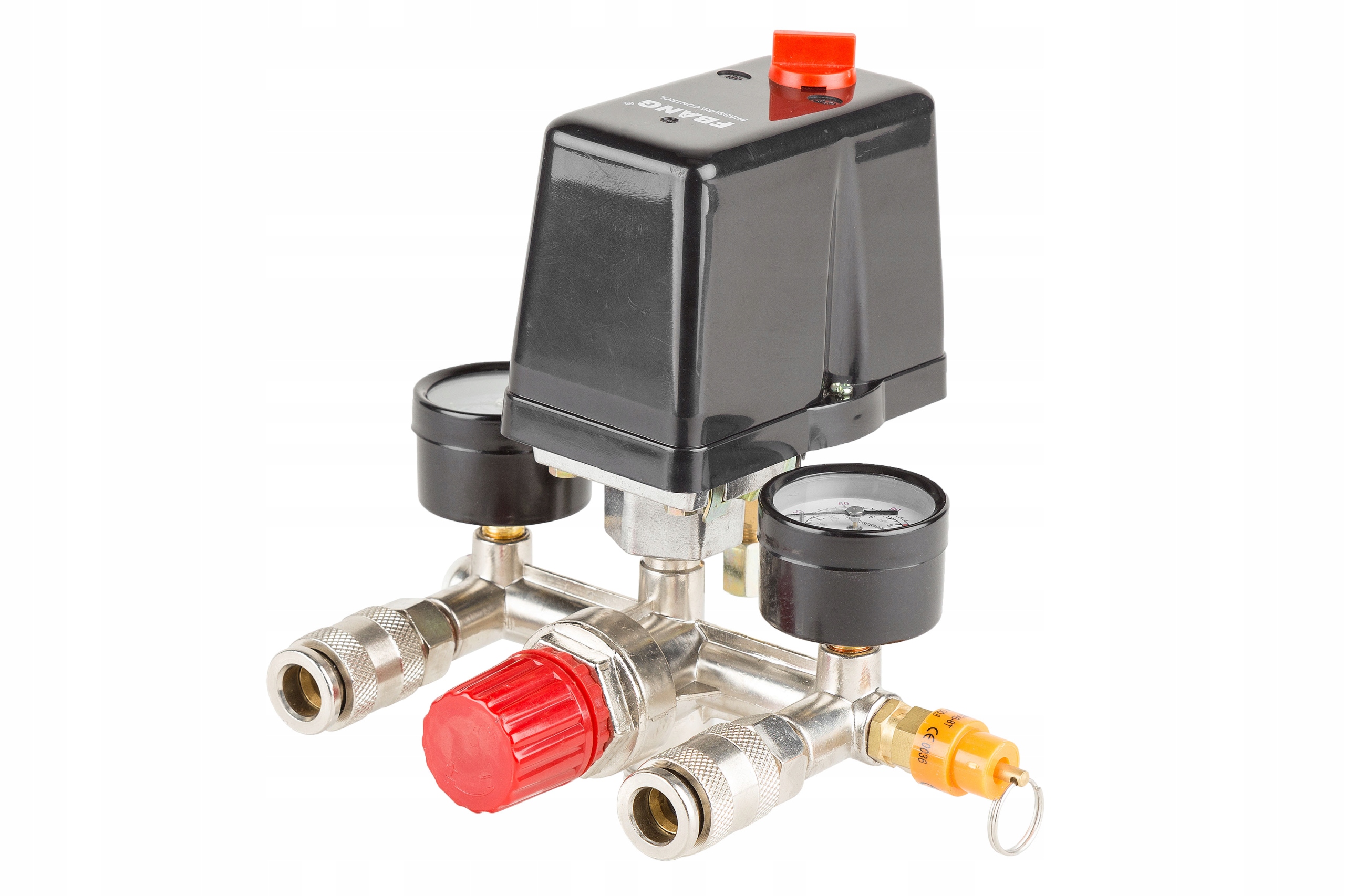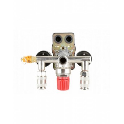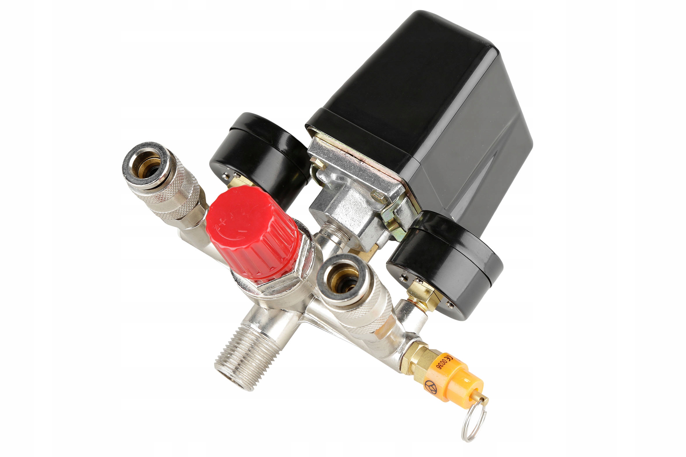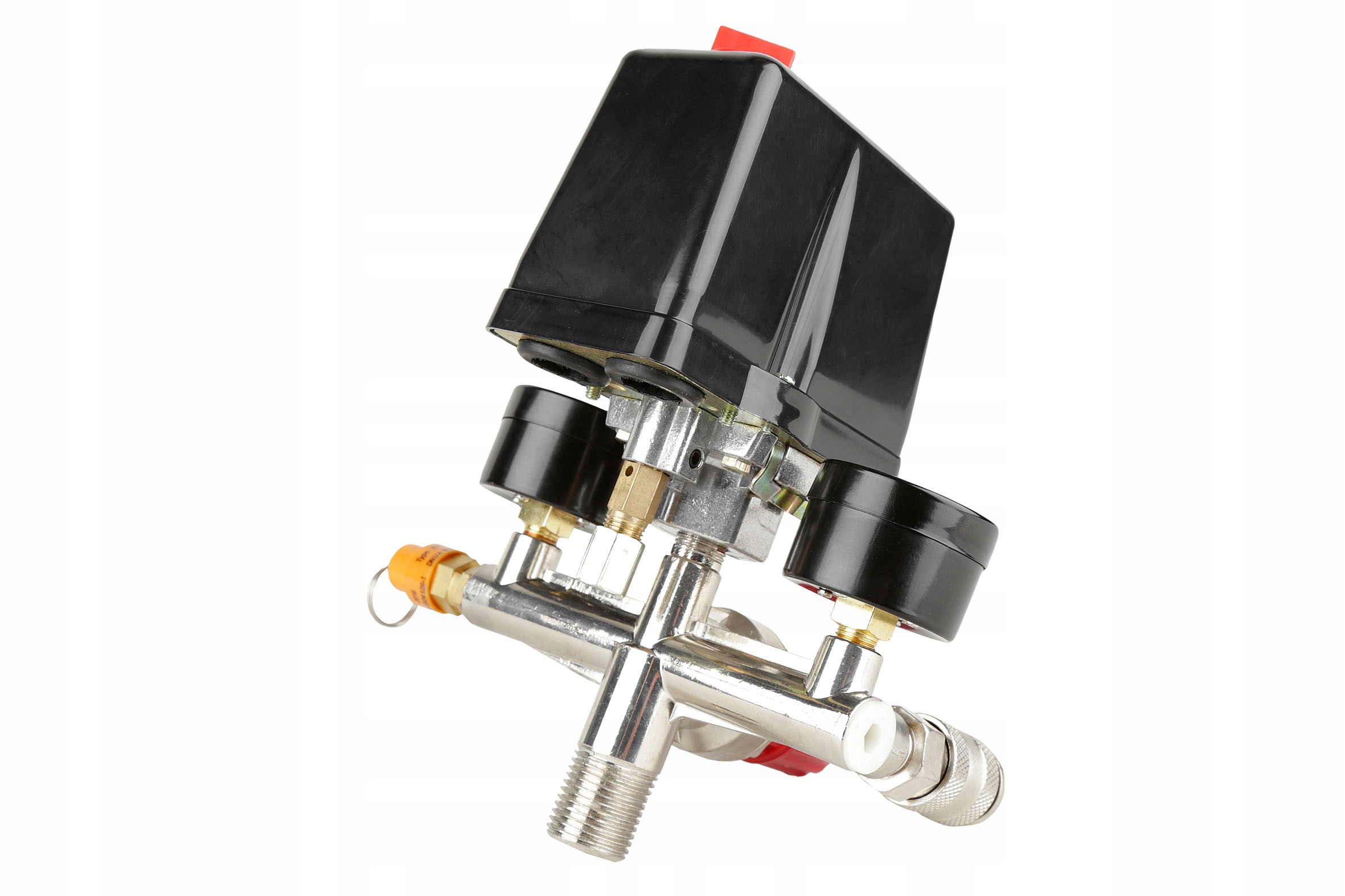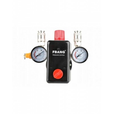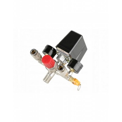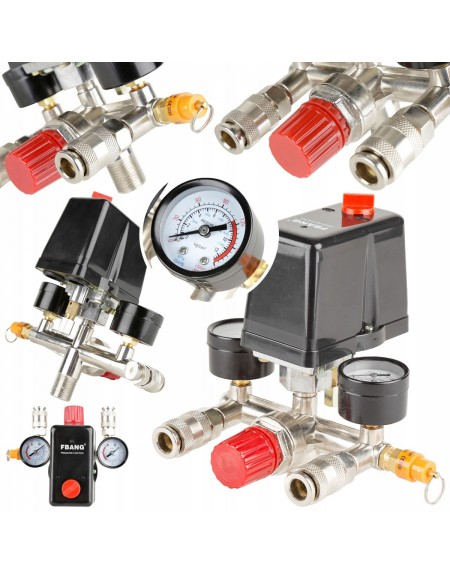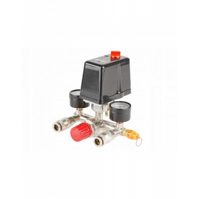 Wyłącznik ciśnieniowy (presostat) z reduktorem, kolektorem, dwoma szybkozłączkami i manometrami przeznaczony do kompresorów różnych producentów zasilanych napięciem 400V. Oferowany wyłącznik to uniwersalna część zamienna przeznaczona do kompresorów głównie z większymi zbiornikami (100, 120, 150, 200, 250, 500l). Wyłącznik posiada zawór ułatwiający rozruch sprężarki - upuszcza ciśnienie z kolektora tłoczącego. Ciśnienie w zbiorniku utrzymuje zawór zwrotny dostosowany do ciśnienia roboczego maksymalnie 8BAR. Konstrukcja presostatu pozwala mu na pracę pod ciśnieniem maksymalnie do 12BAR, co oznacza, że po zmianie zaworu bezpieczeństwa na większy presostat może służyć do obsługi kompresorów o wysokim ciśnieniu roboczym.