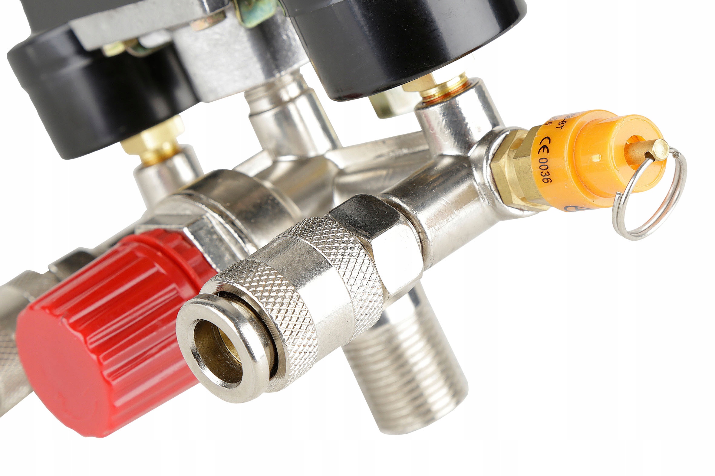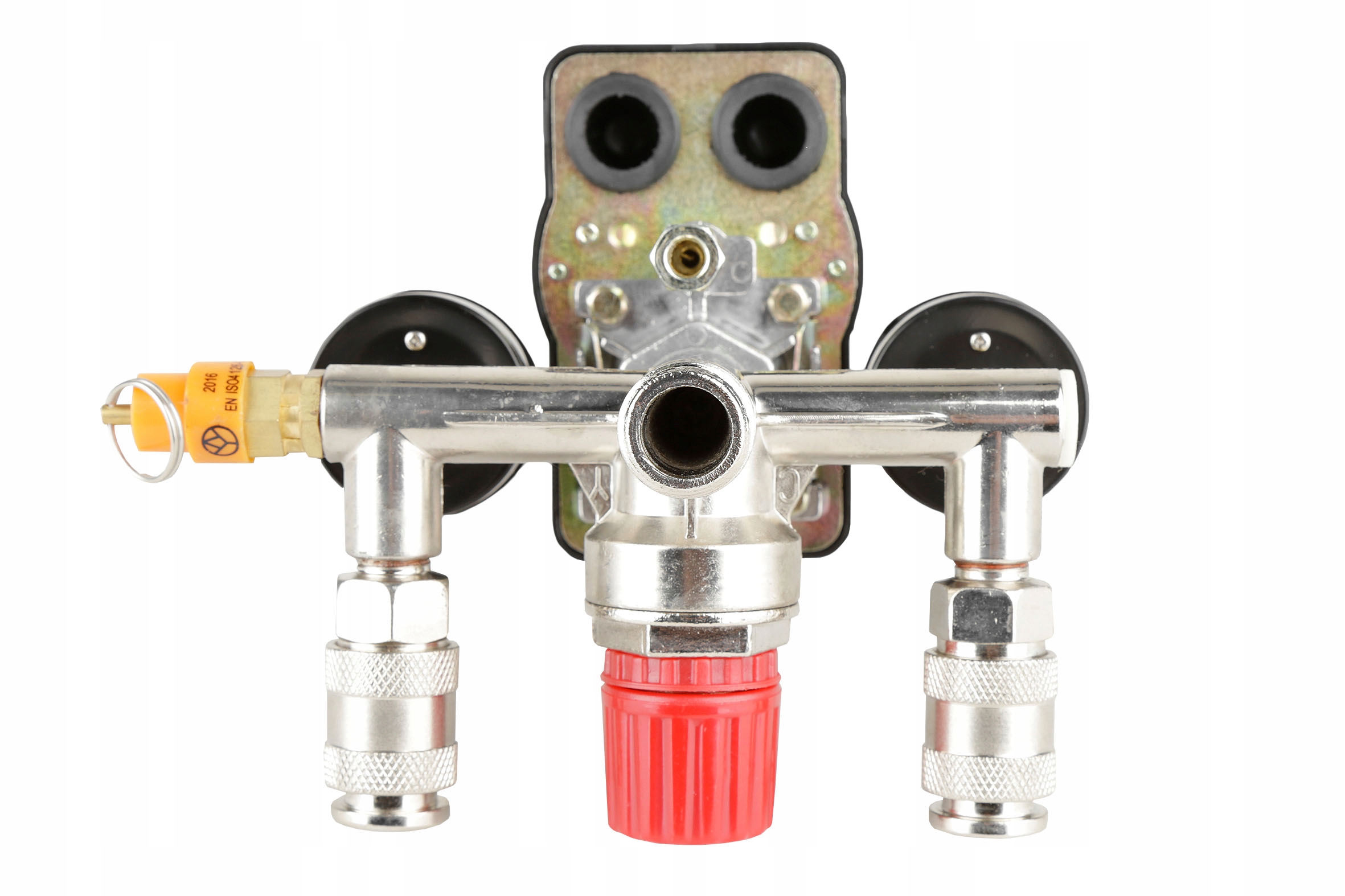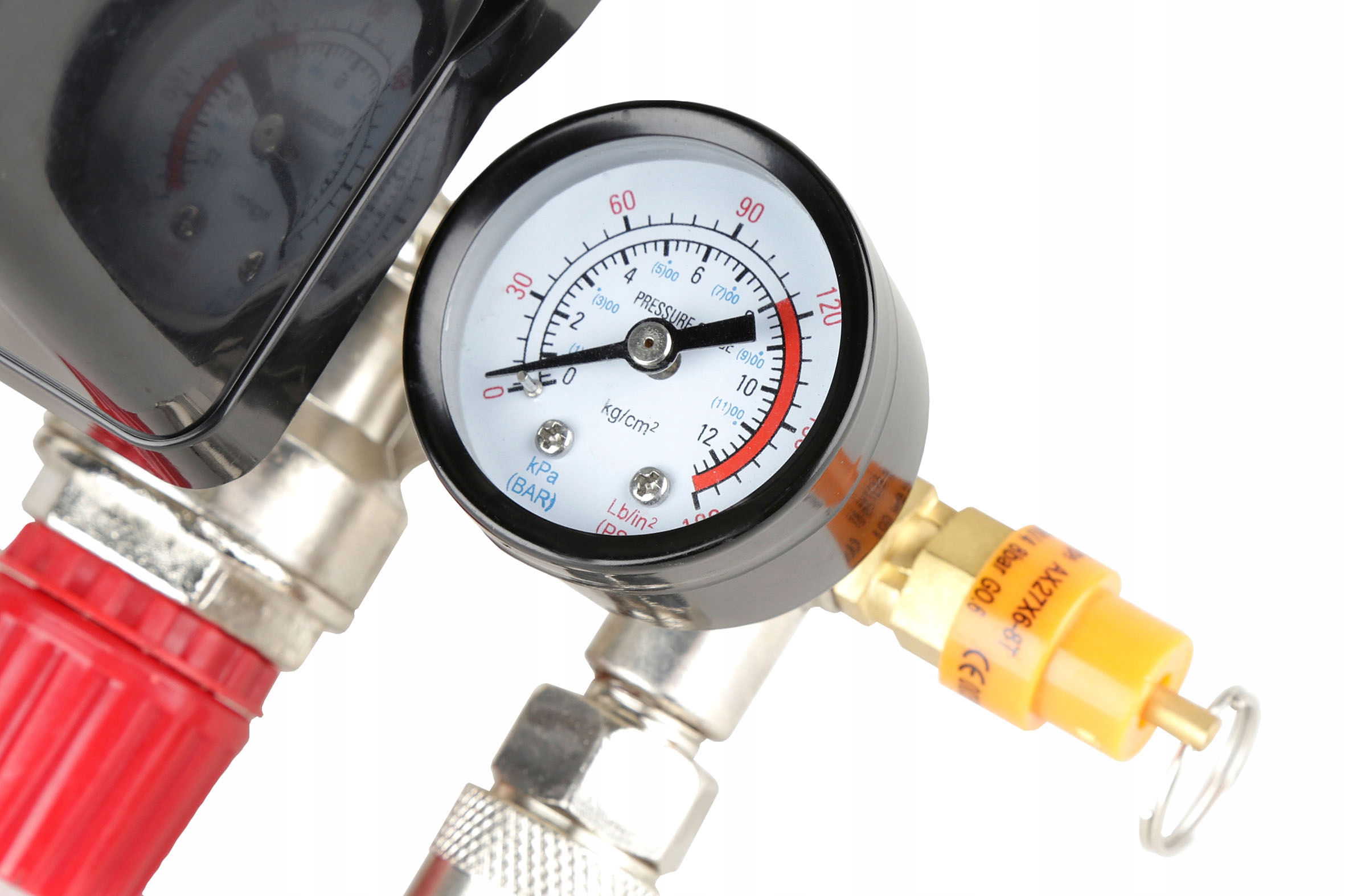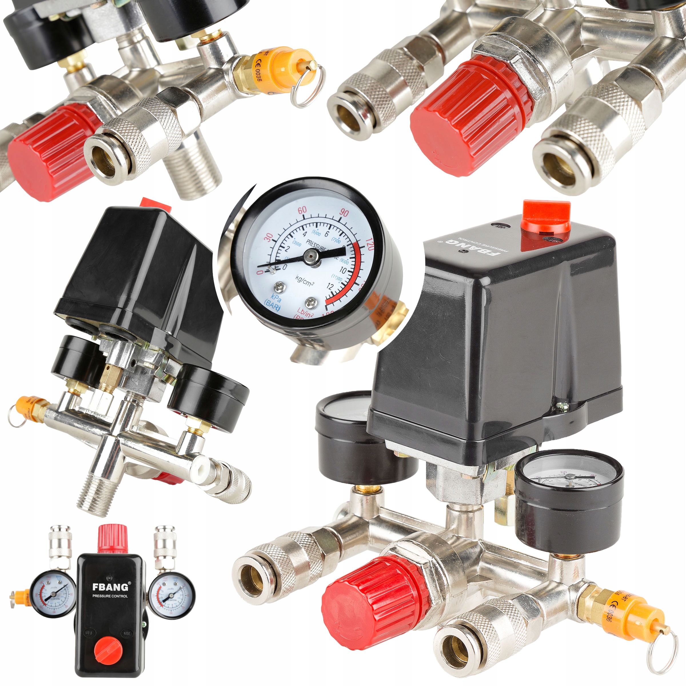 Wyłącznik ciśnieniowy (presostat) z reduktorem, kolektorem, dwoma szybkozłączkami i manometrami przeznaczony do kompresorów różnych producentów zasilanych napięciem 400V. Oferowany wyłącznik to uniwersalna część zamienna przeznaczona do kompresorów głównie z większymi zbiornikami (100, 120, 150, 200, 250, 500l). Wyłącznik posiada zawór ułatwiający rozruch sprężarki - upuszcza ciśnienie z kolektora tłoczącego. Ciśnienie w zbiorniku utrzymuje zawór zwrotny dostosowany do ciśnienia roboczego maksymalnie 8BAR. Konstrukcja presostatu pozwala mu na pracę pod ciśnieniem maksymalnie do 12BAR, co oznacza, że po zmianie zaworu bezpieczeństwa na większy presostat może służyć do obsługi kompresorów o wysokim ciśnieniu roboczym.