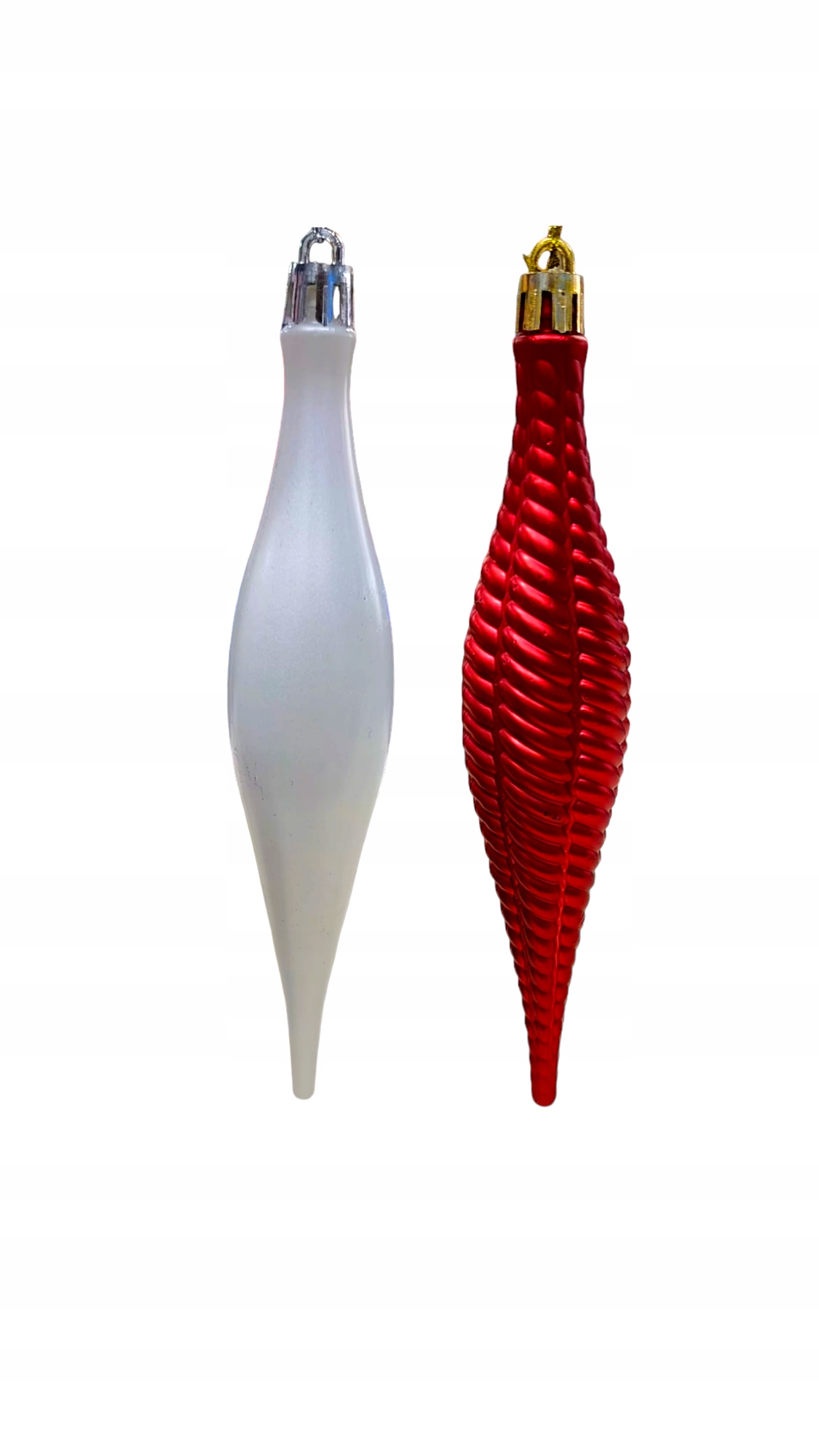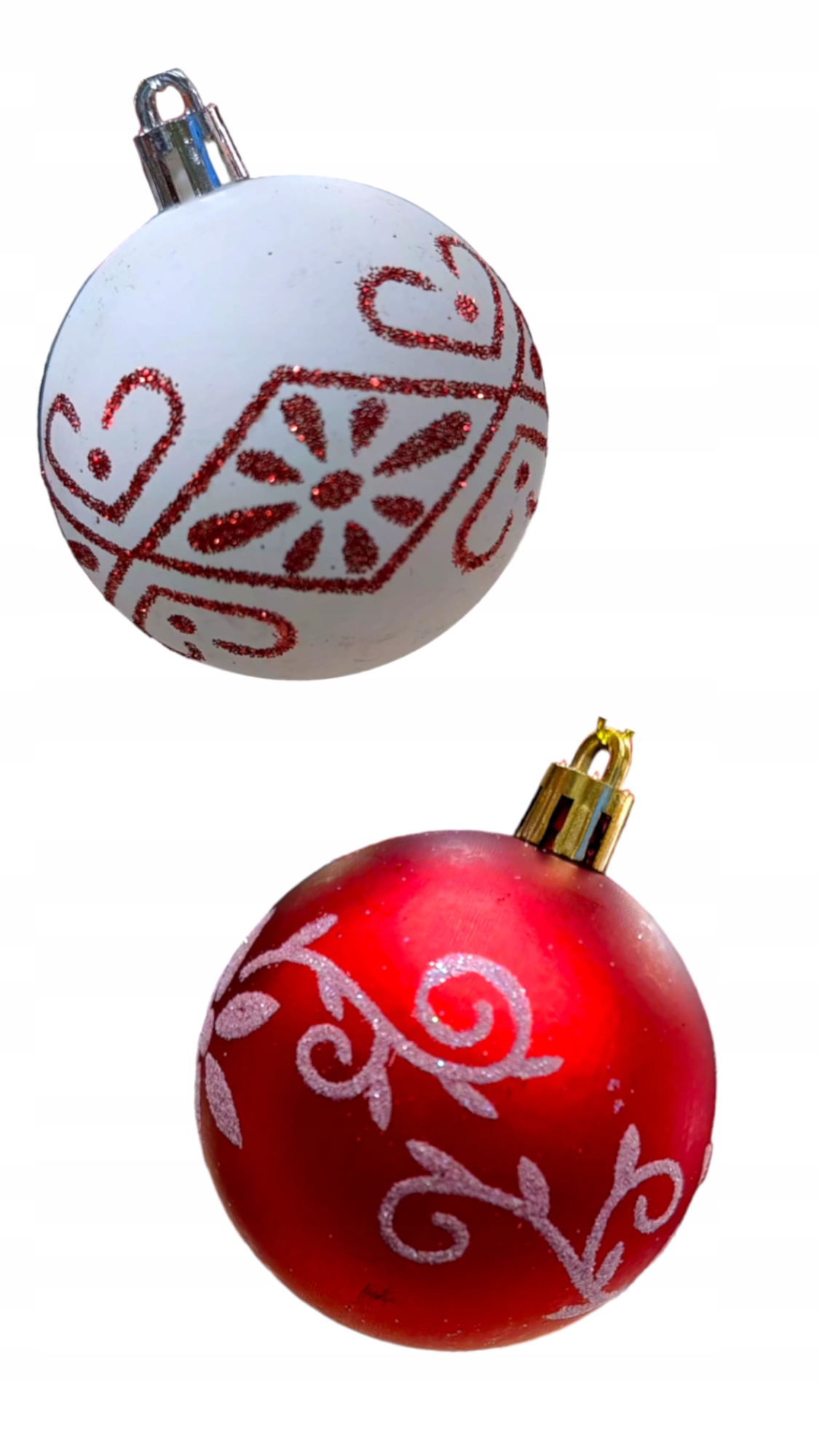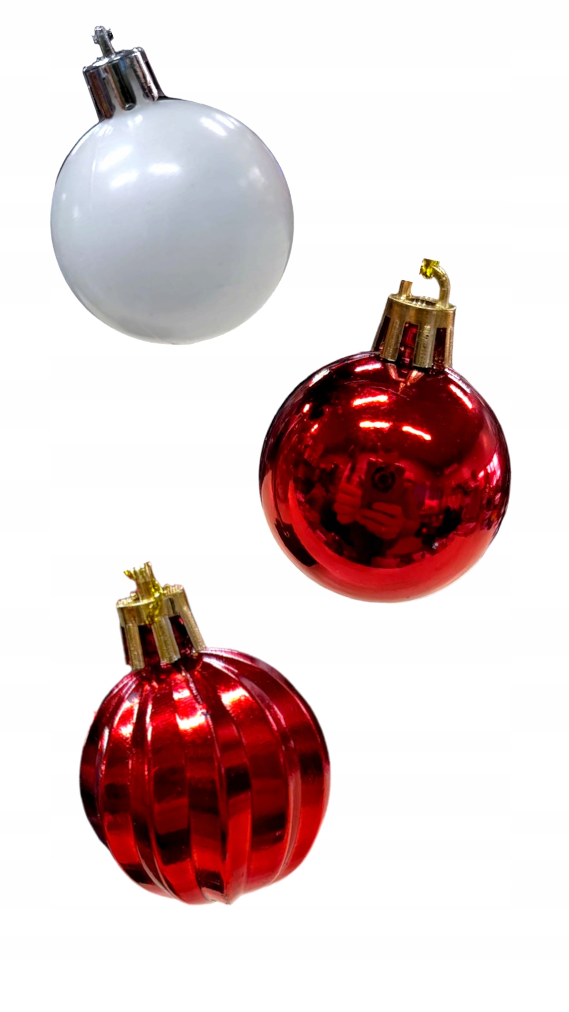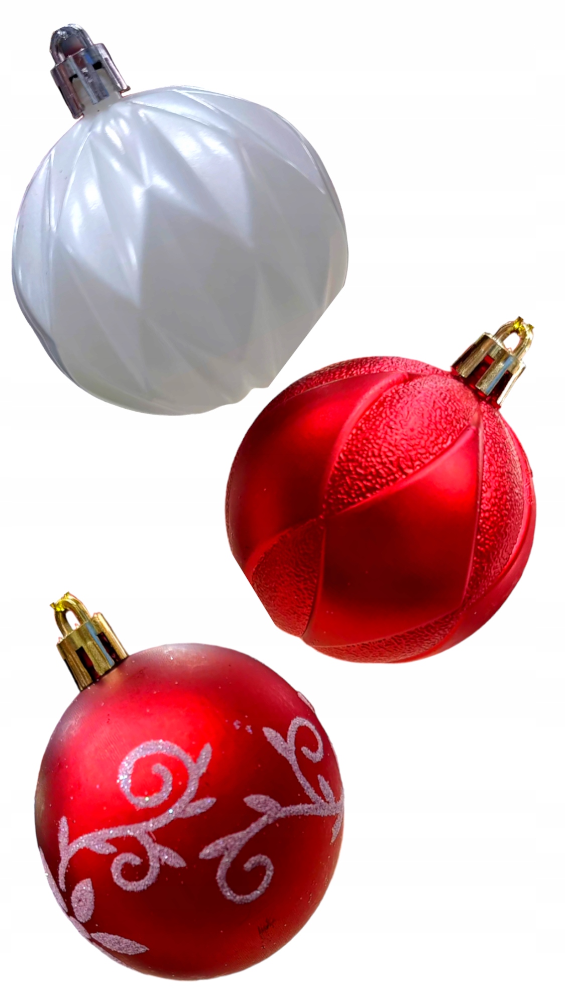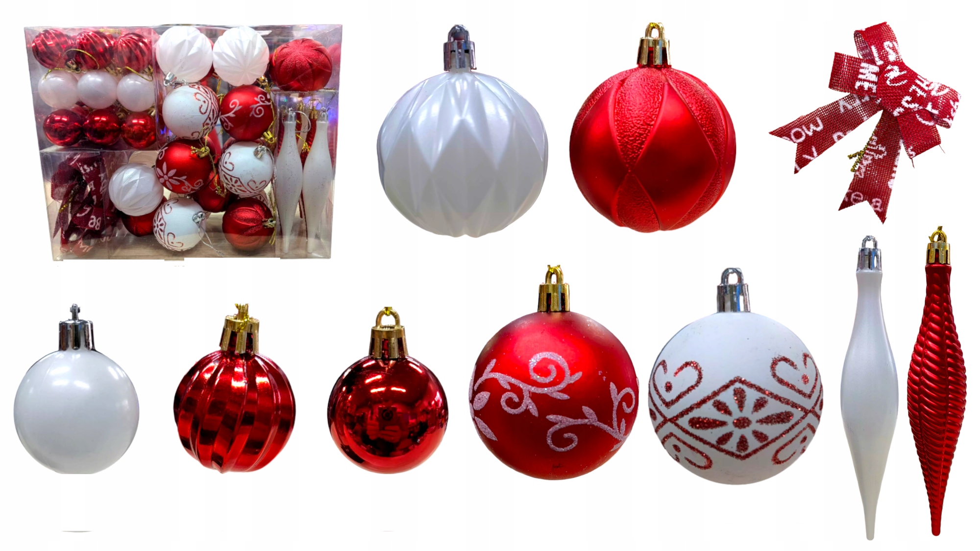 Zestaw bombek choinkowych składający się z 22 szt. bombek o średnicy 6 cm, 27 szt. bombek o średnicy 4 cm, 8 szt. bombek sopli, 6 szt. kokardek