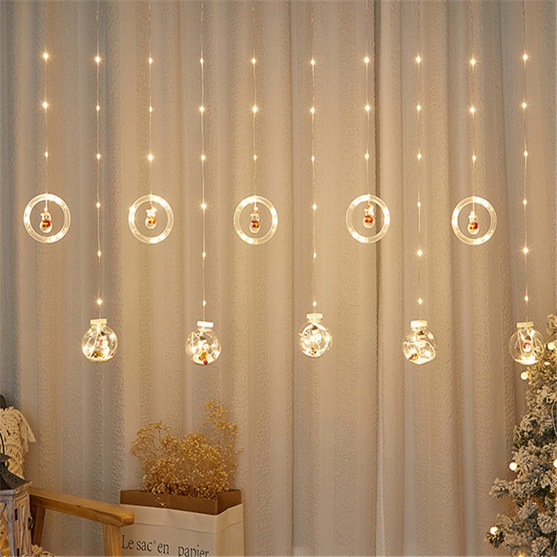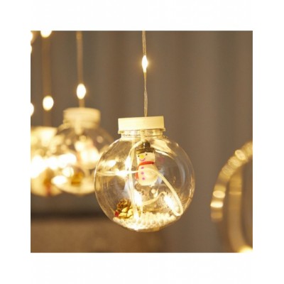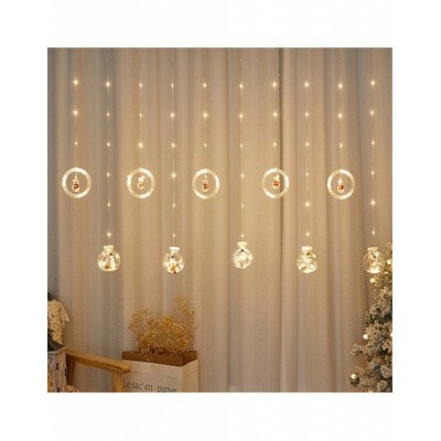 Kurtyna świetlna złożona z 10 pionowo zwisających przewodów, drucików na których umieszczone są diody mikro LED, zakończone śnieżnymi kulami i akrylowymi kółkami.