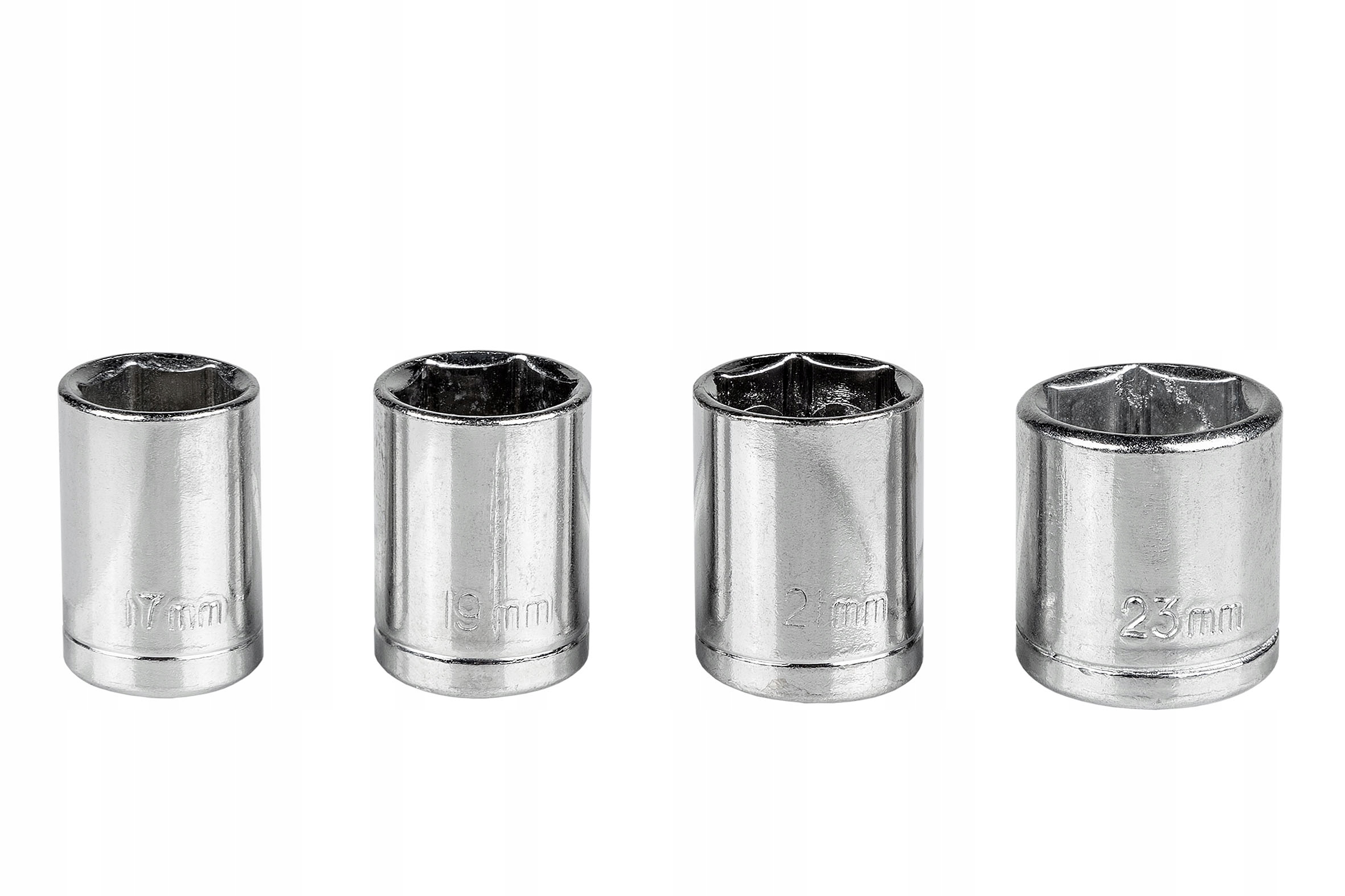 W zestawie znajdują się nasadki o zwiększonej wytrzymałości udarowej o wymiarach 17; 19; 21; 23 mm.
