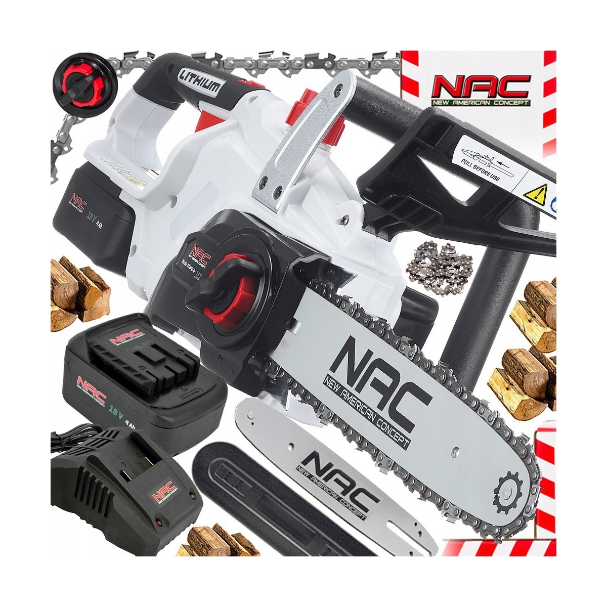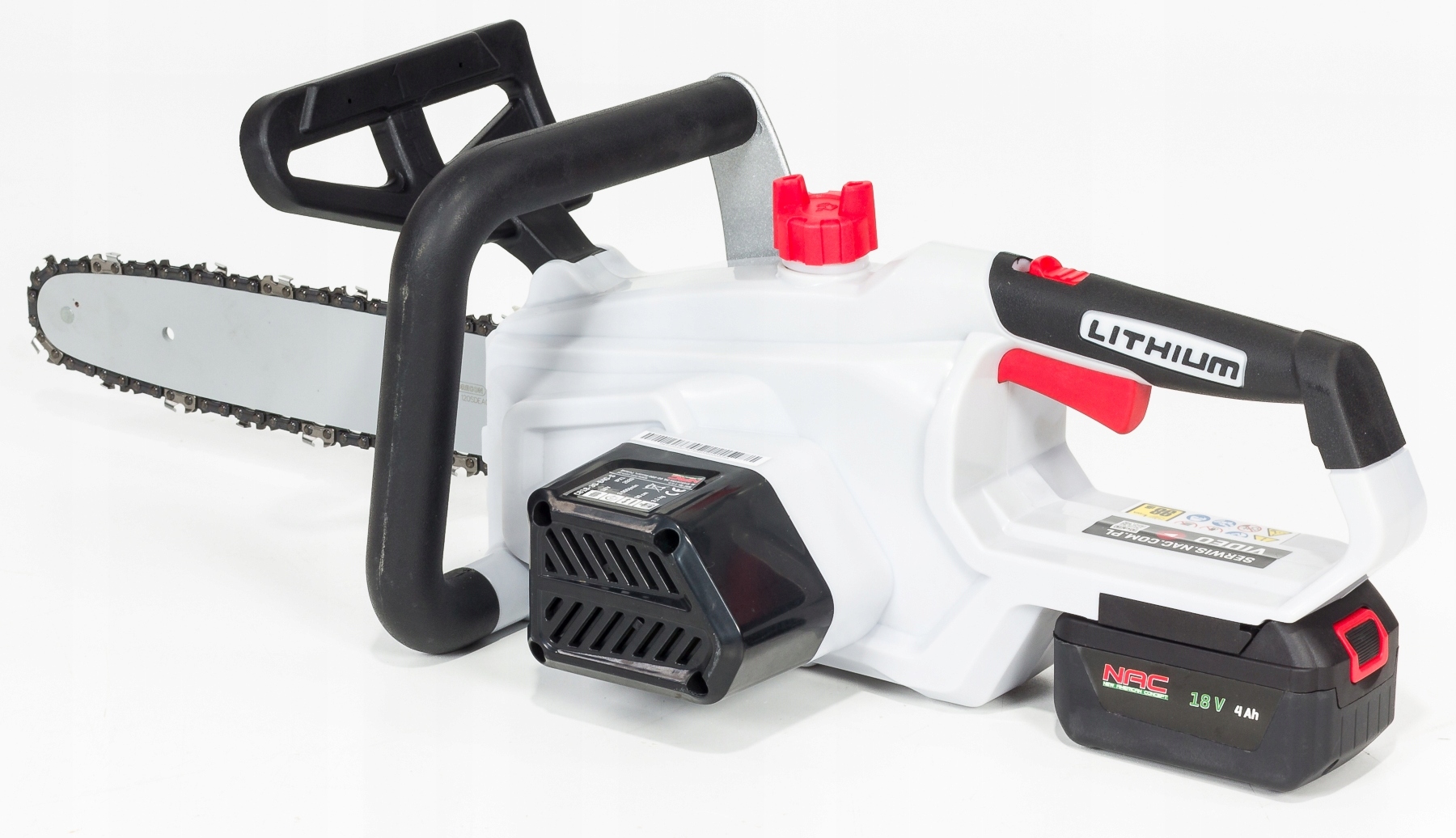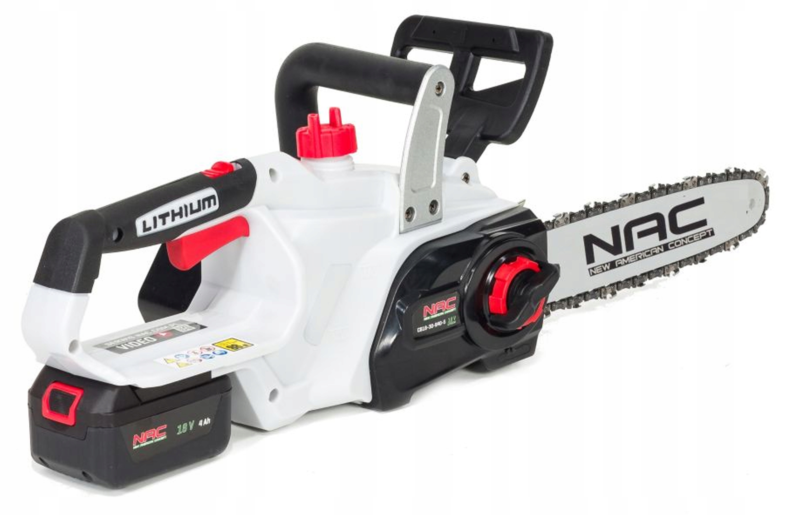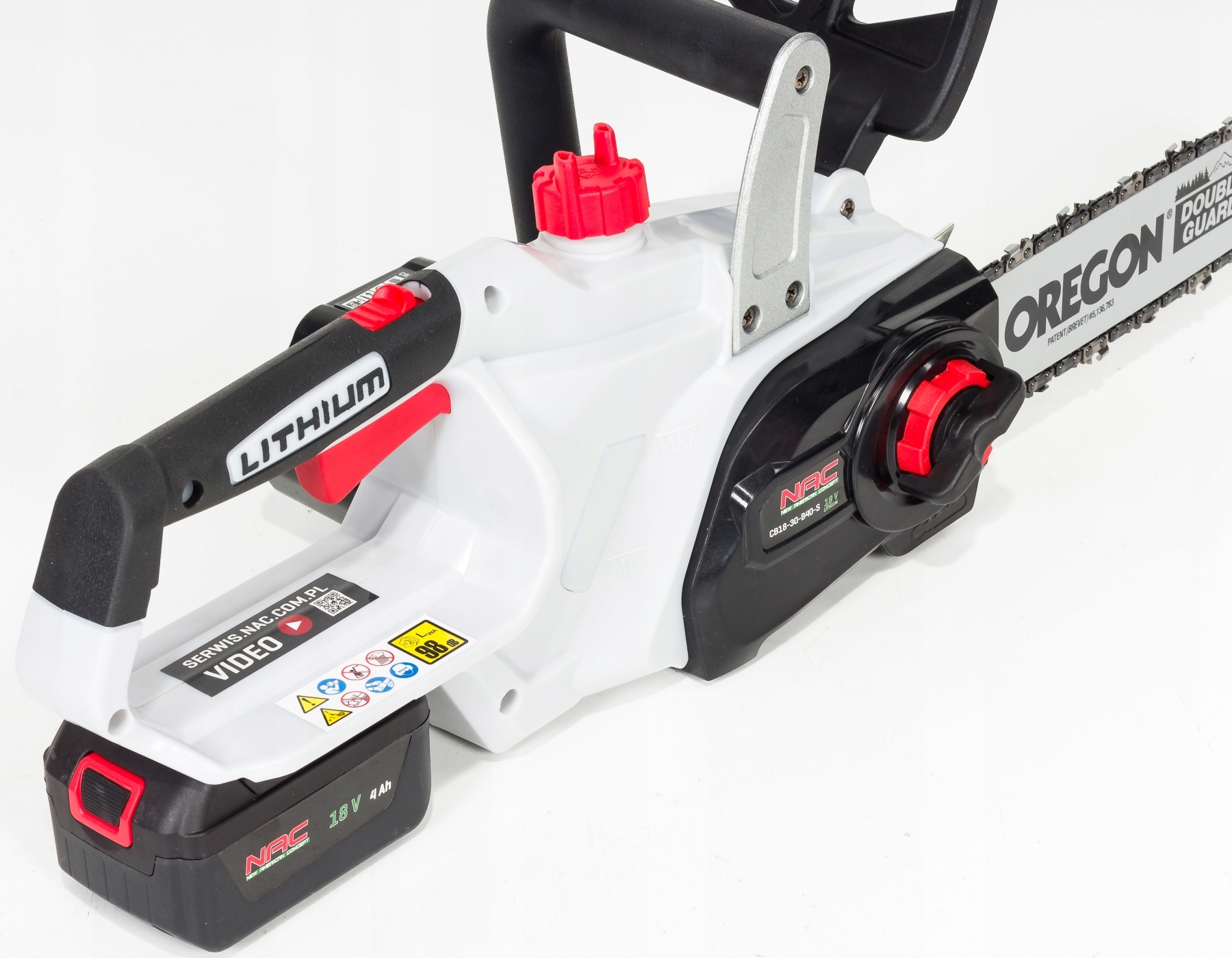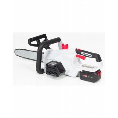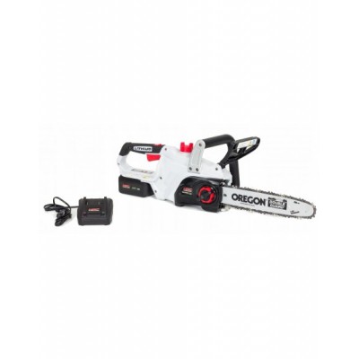 W zestawie: akumulator 4Ah, ładowarka, prowadnica z osłoną, łańcuch
