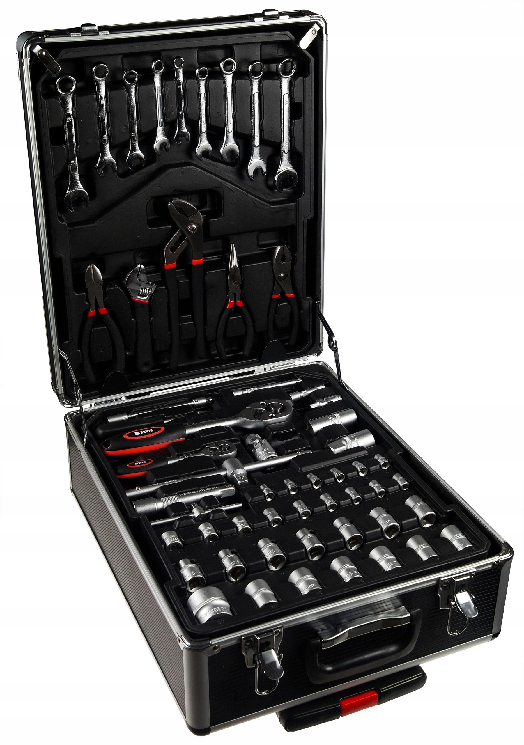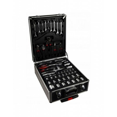 Zestaw narzędzi w metalowej walizce zamykanej na kluczyk. Wbudowane kółeczka ułatwiające przesuwanie walizki, oraz teleskopowa rączka. Doskonale wykonana walizka narzędziowa, Cały zestaw wykonany z zachowaniem solidnej jakości. Walizka aluminiowa z kółeczkami i rączką wyciąganą teleskopowo do przewożenia zestawu (jak walizka podróżna). Cztery wyciągane szuflady z narzędziami.