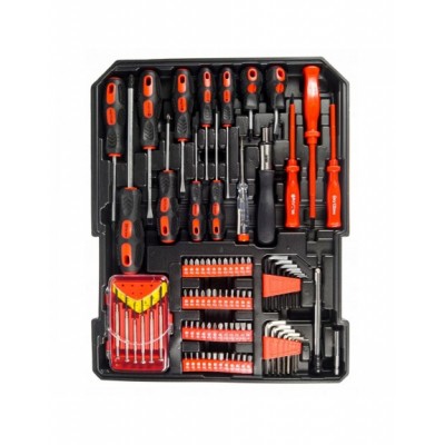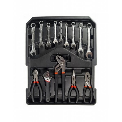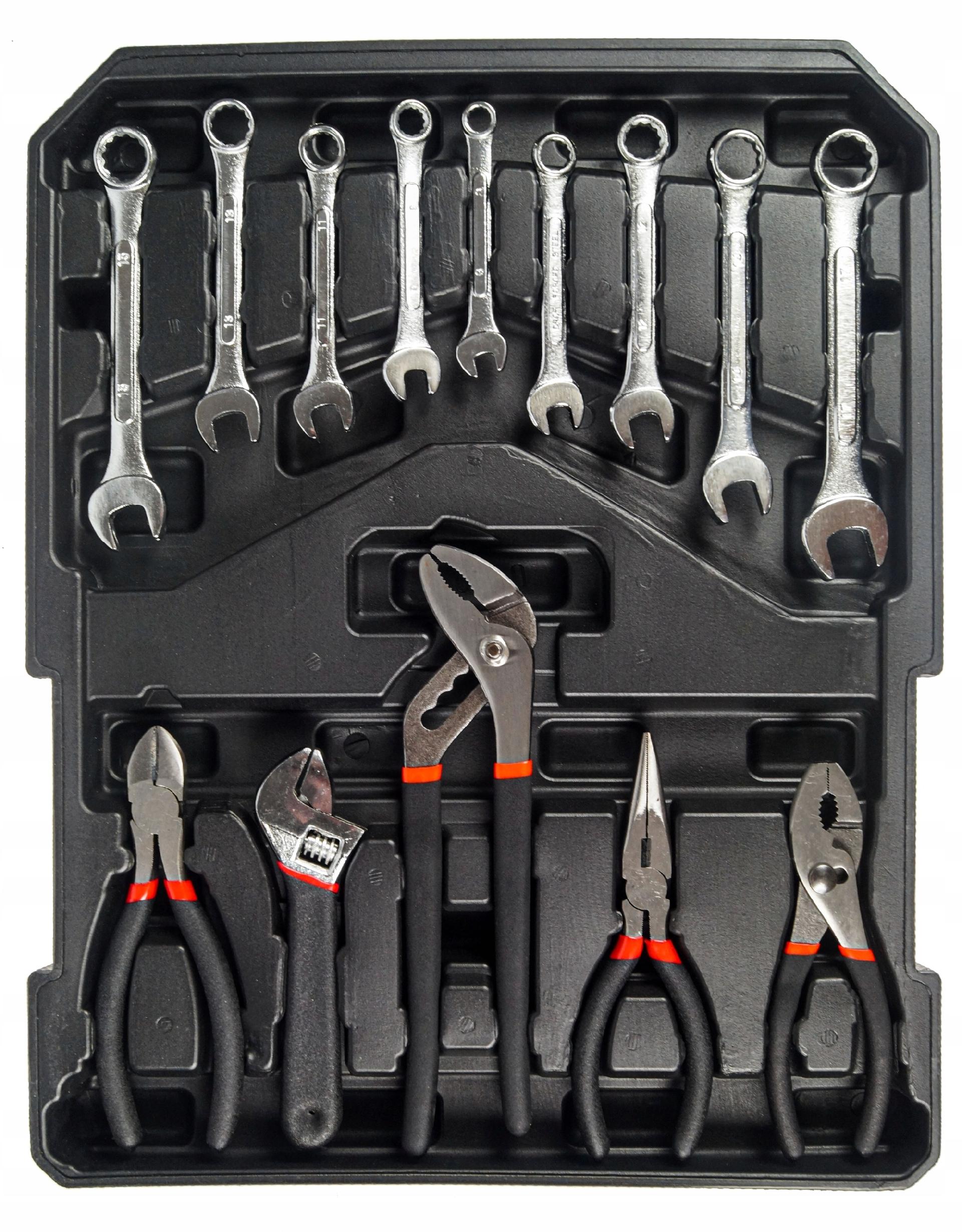 Zawartość opakowania: . Pierwsza szuflada: klucze płasko-oczkowe: 6; 8; 10; 11; 12; 13; 14; 15; 17 mm kombinerki żabka klucz szwedzki nastawny szczypce ucinaczki