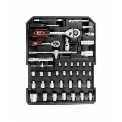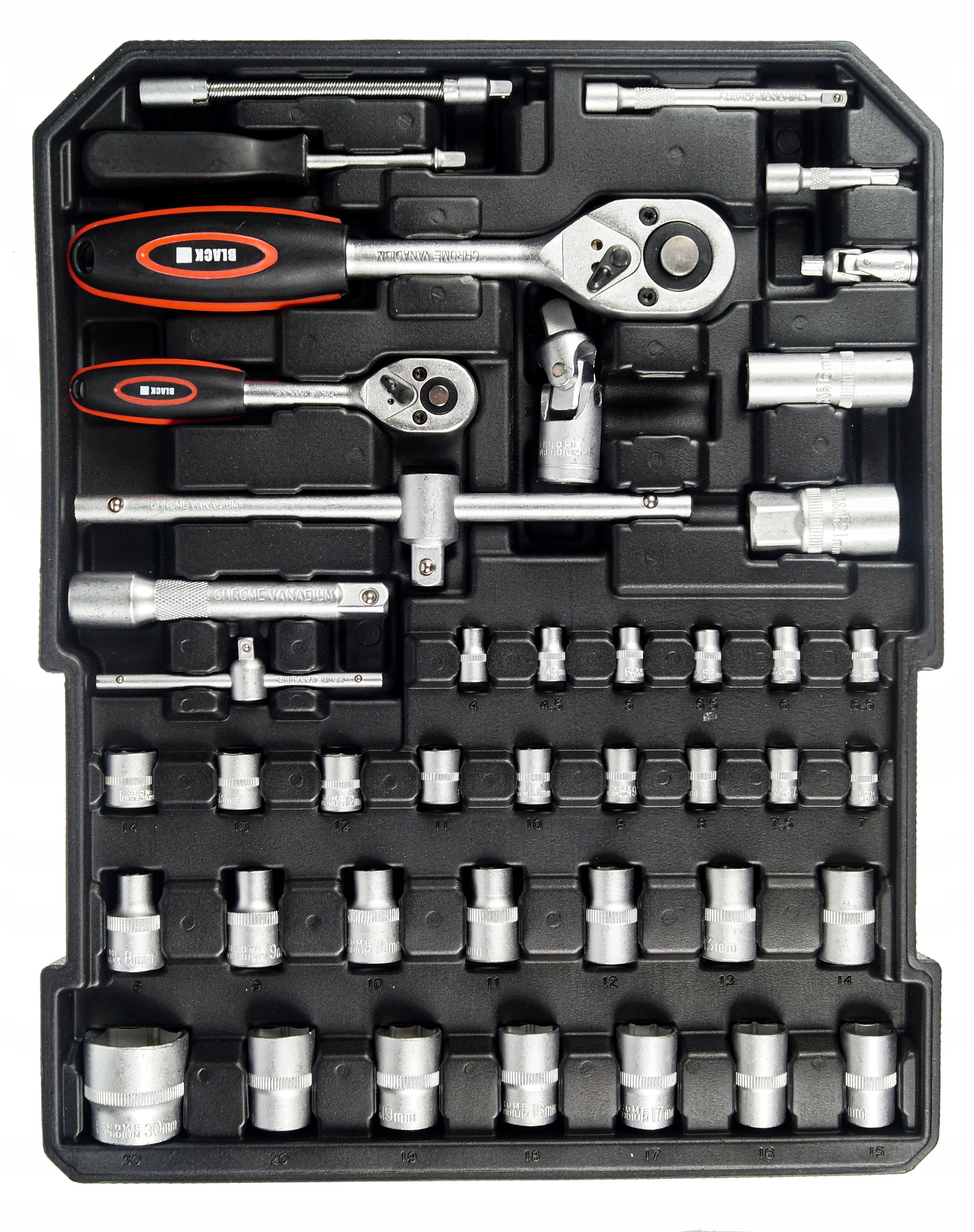 Druga szuflada: przedłużka 1/4 (2szt.: 50 i 100mm) przegub cardana 1/4 i 1/2 przedłużka elastyczna (giętka) 150mm pokrętło T 1/4 i 1/2 grzechotka 1/4 oraz 1/2 uchwyt śrubokręta nasadki 1/4 (4; 4,5; 5; 5,5; 6; 6,5; 7; 7,5; 8; 9; 10; 11; 12; 13; 14 mm) nasadki 1/2 (7;8; 9; 10; 11; 12; 13; 14; 15; 16; 17; 18; 19; 20 mm) nasadki świec 16mm i 21mm