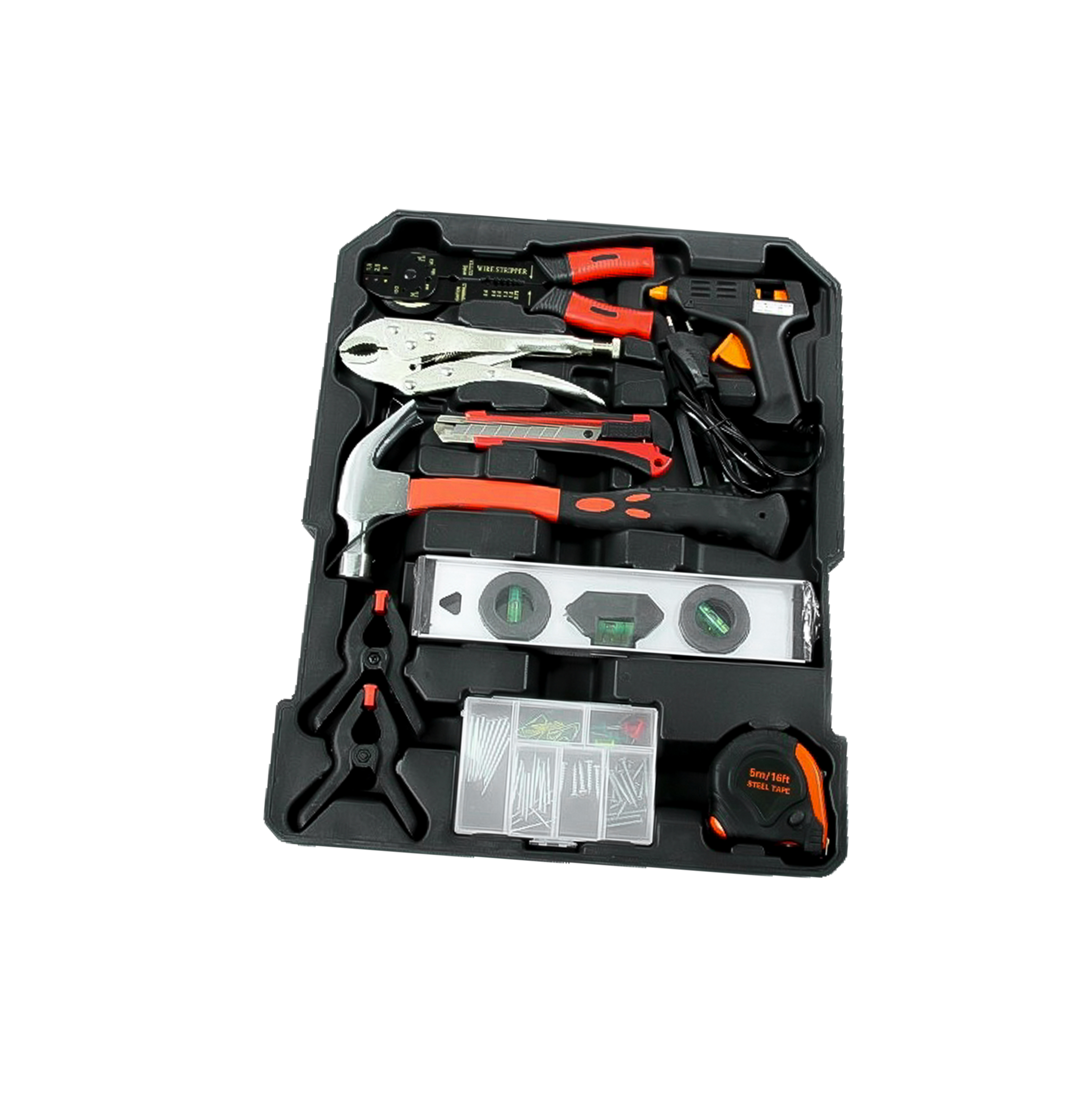Czwarta szuflada: miara 5 m poziomica 2x szczypce samozaciskowe młotek nożyce taśma izolacyjna nóż do tapet elektryczny pistolet do kleju + 2x wkłady do klejenia zestaw gwoździ i wkrętaków uniwersalny przyrząd do zarabiania przewodów elektrycznych