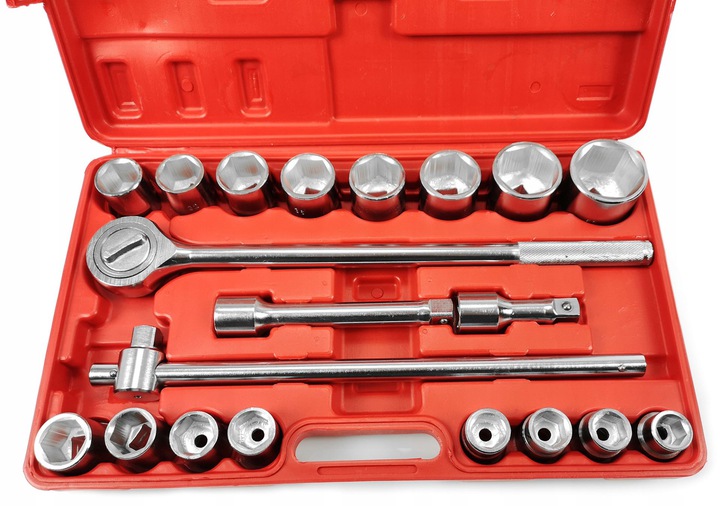 Profesjonalny zestaw klucz nasadowych 3/4". Idealne nadają się do dużych samochodów ciężarowych jak i maszyn rolniczych ,wykonane z mocnych materiałów co świetnie przekłada się na ich trwałość. Niezbędny w każdym warsztacie samochodowym, nasadki tej wielkości pomogą przy naprawie ciężarówek czy maszyn rolniczych. Idealne przy odkręcaniu lub dokręcaniu dużych śrub. Wszystkie nasadki oraz przejściówki znajdują się w praktycznej walizce. Zestaw składa się z 21 elementów.