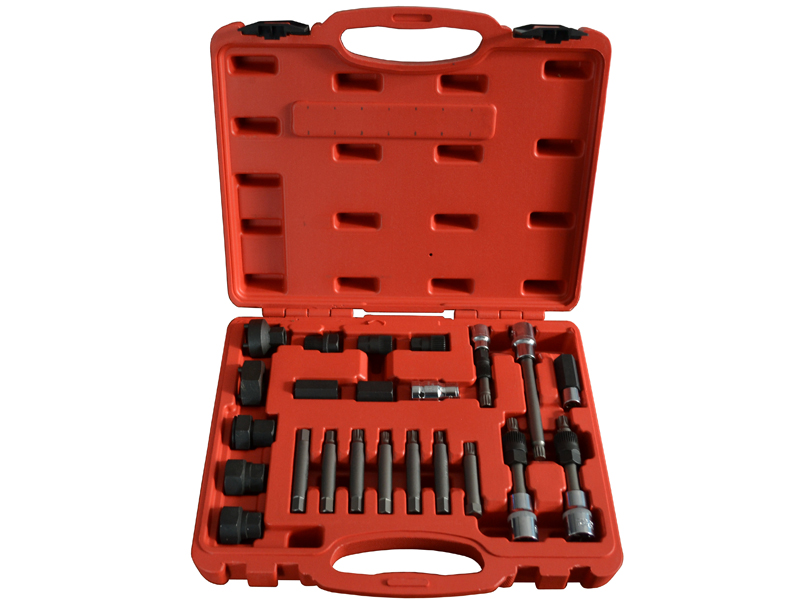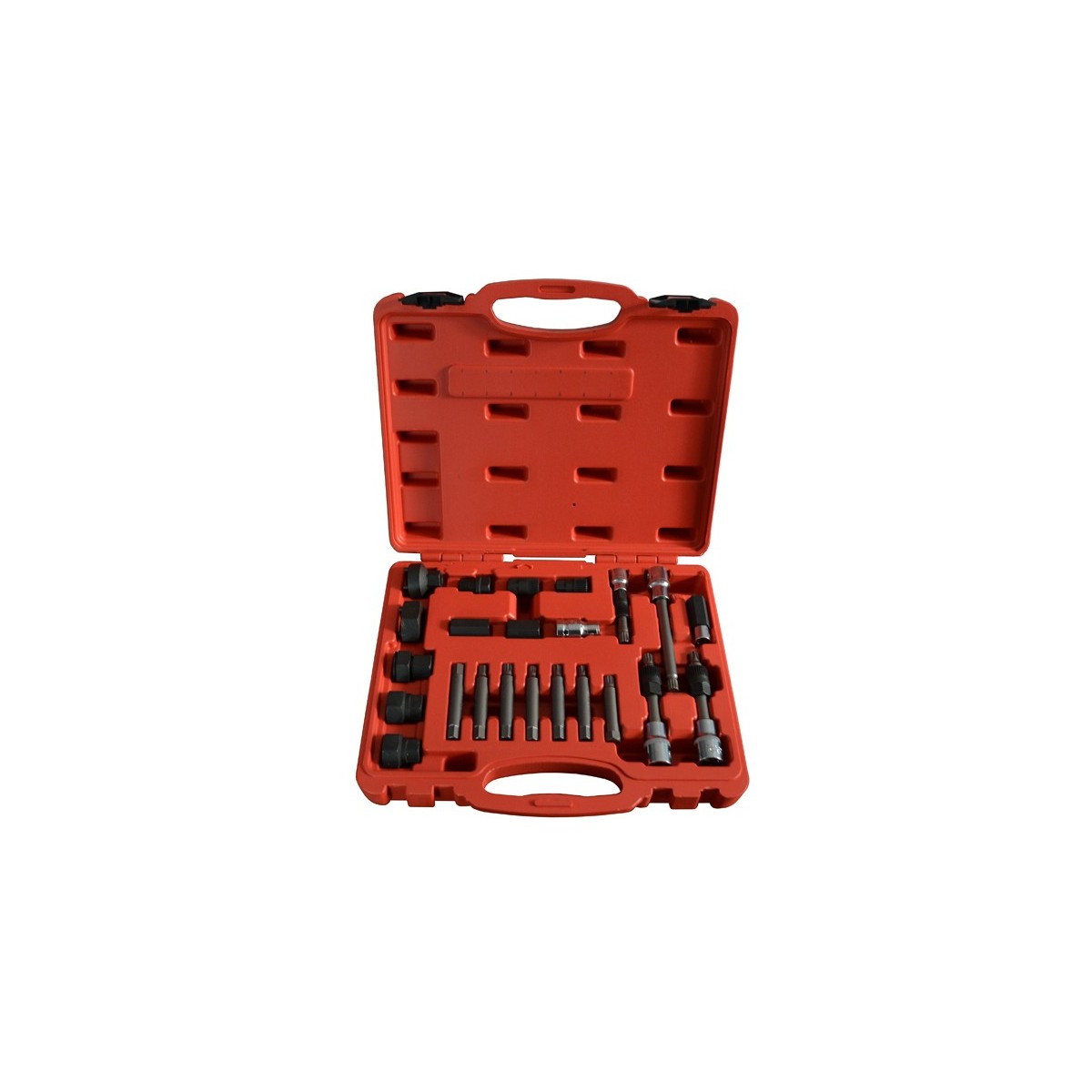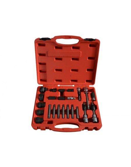 Zestaw 24-stu kluczy do montażu i demontażu alternatorów ze sprzęgłem typu Bosch i Magneti Marelli. Dostosowany do samochodów marek: Audi, BMW, Fiat, Ford, Mercedes, Opel, Porsche, Renault, Peugeot, Seat, Skoda, Volvo, VW i innych. Klucze umożliwiają jednoczesne odkręcanie śruby mocującej koło pasowe (za pomocą odpowiedniego bitu) oraz przytrzymywanie koła ze sprzęgłem (za pomocą specjalistycznej nasadki).