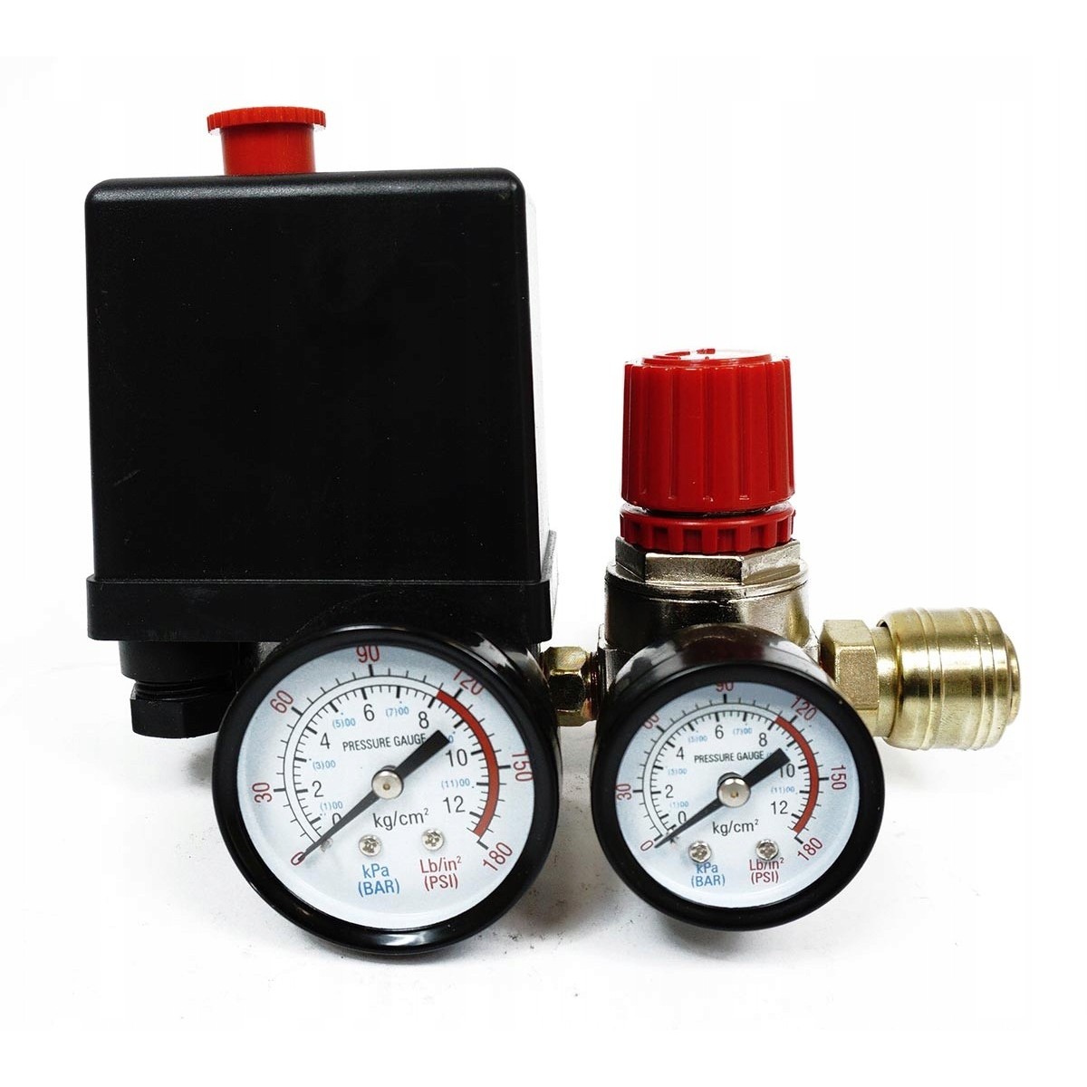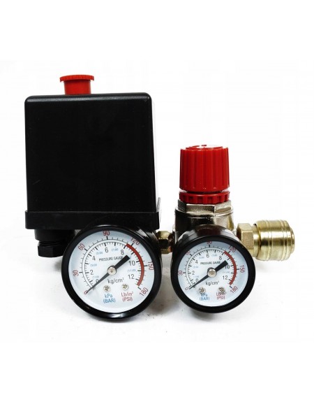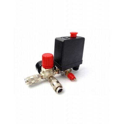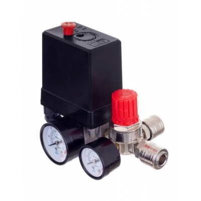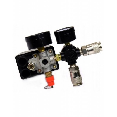 Wysokiej jakości wyłącznik ciśnieniowy (presostat) z kolektorem, dwoma szybkozłączkami i manometrami przeznaczony do kompresorów ciśnieniowych na 230V.