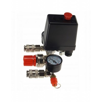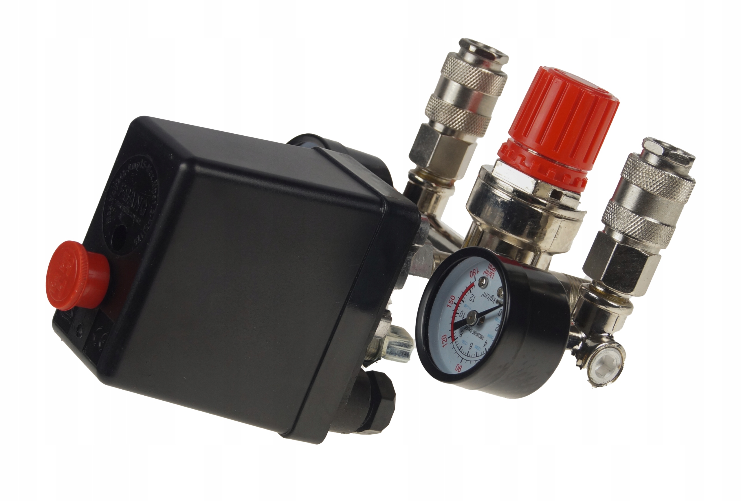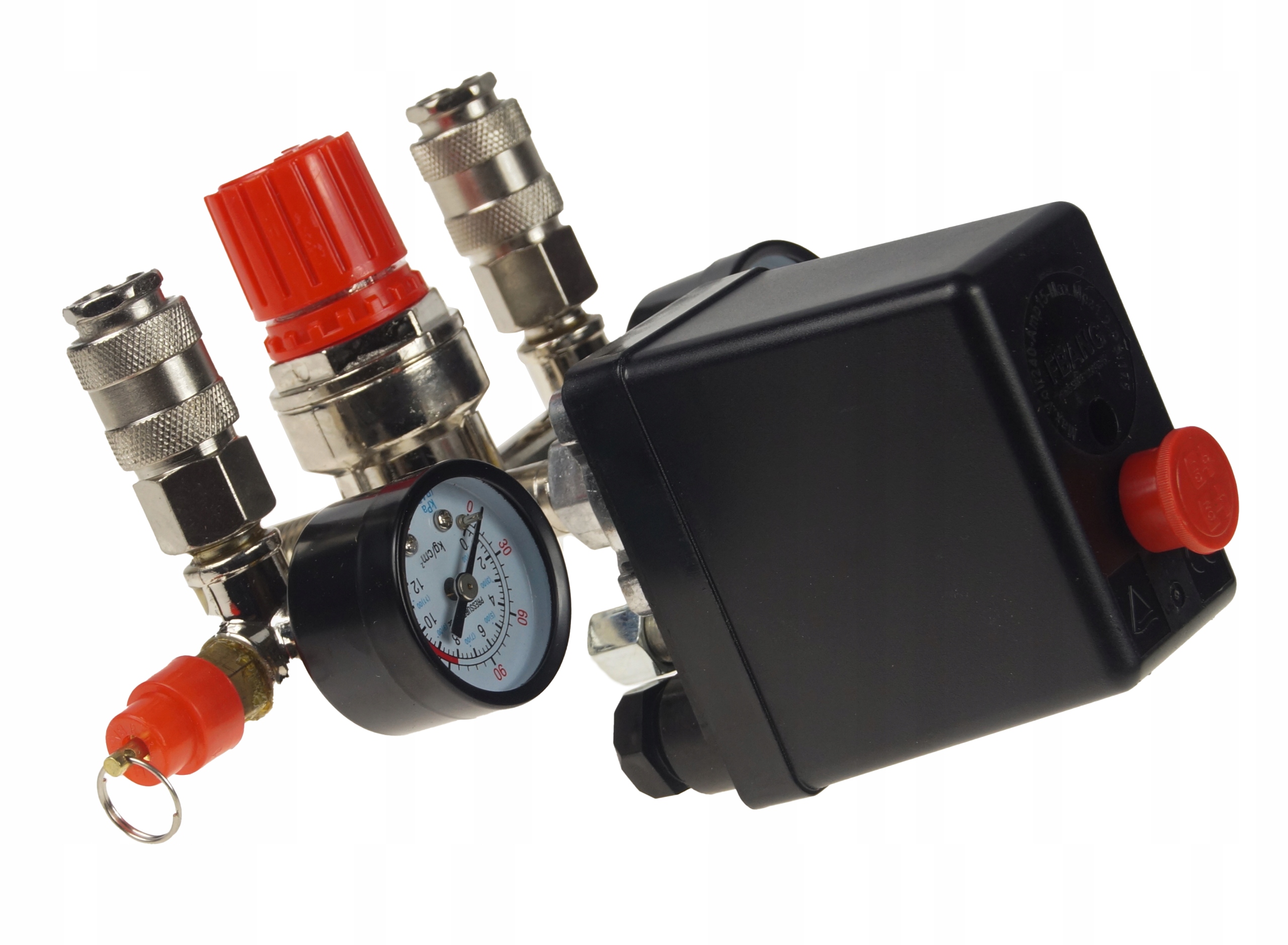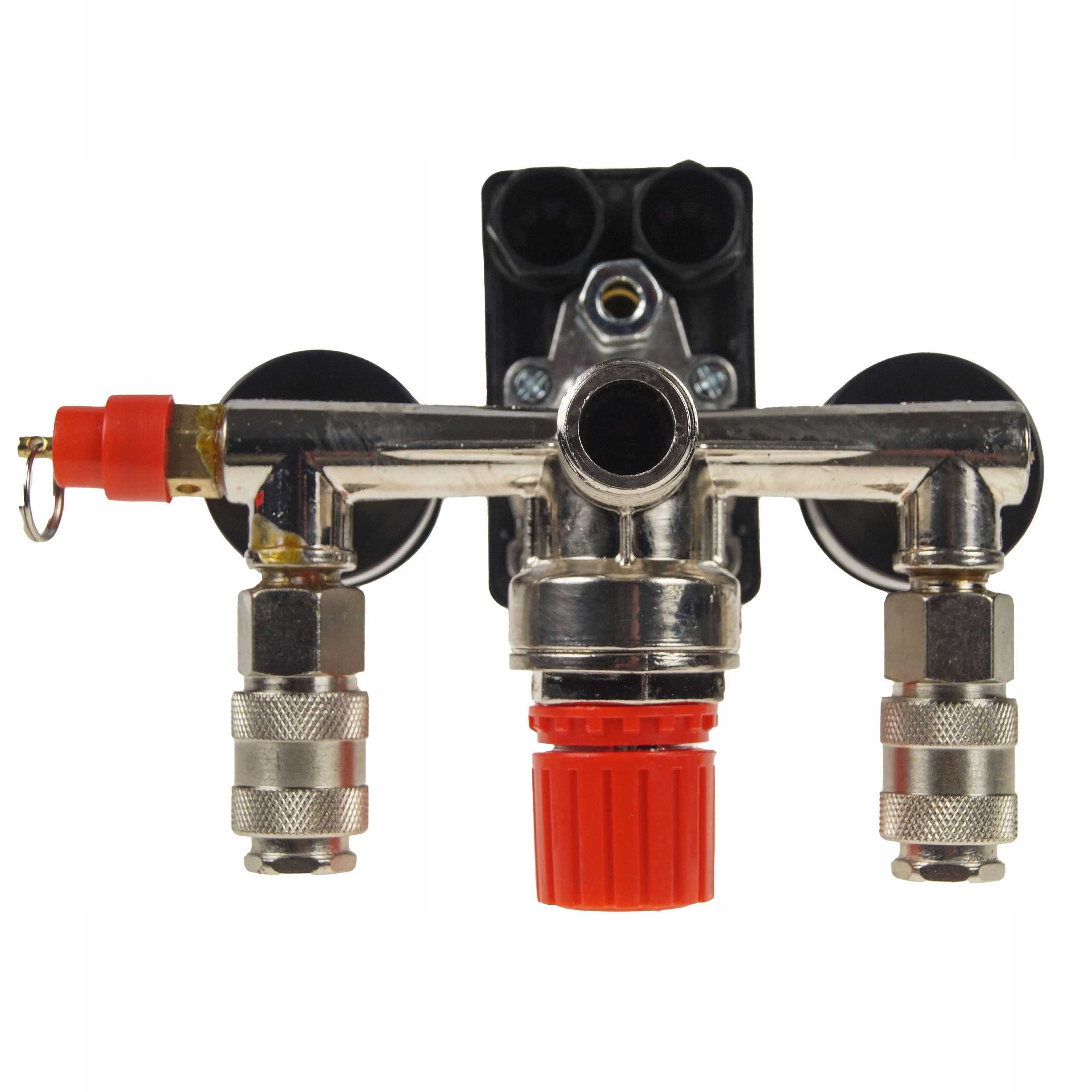 Wysokiej jakości wyłącznik ciśnieniowy (presostat) z kolektorem, dwoma szybkozłączkami i manometrami przeznaczony do kompresorów ciśnieniowych na 230V.