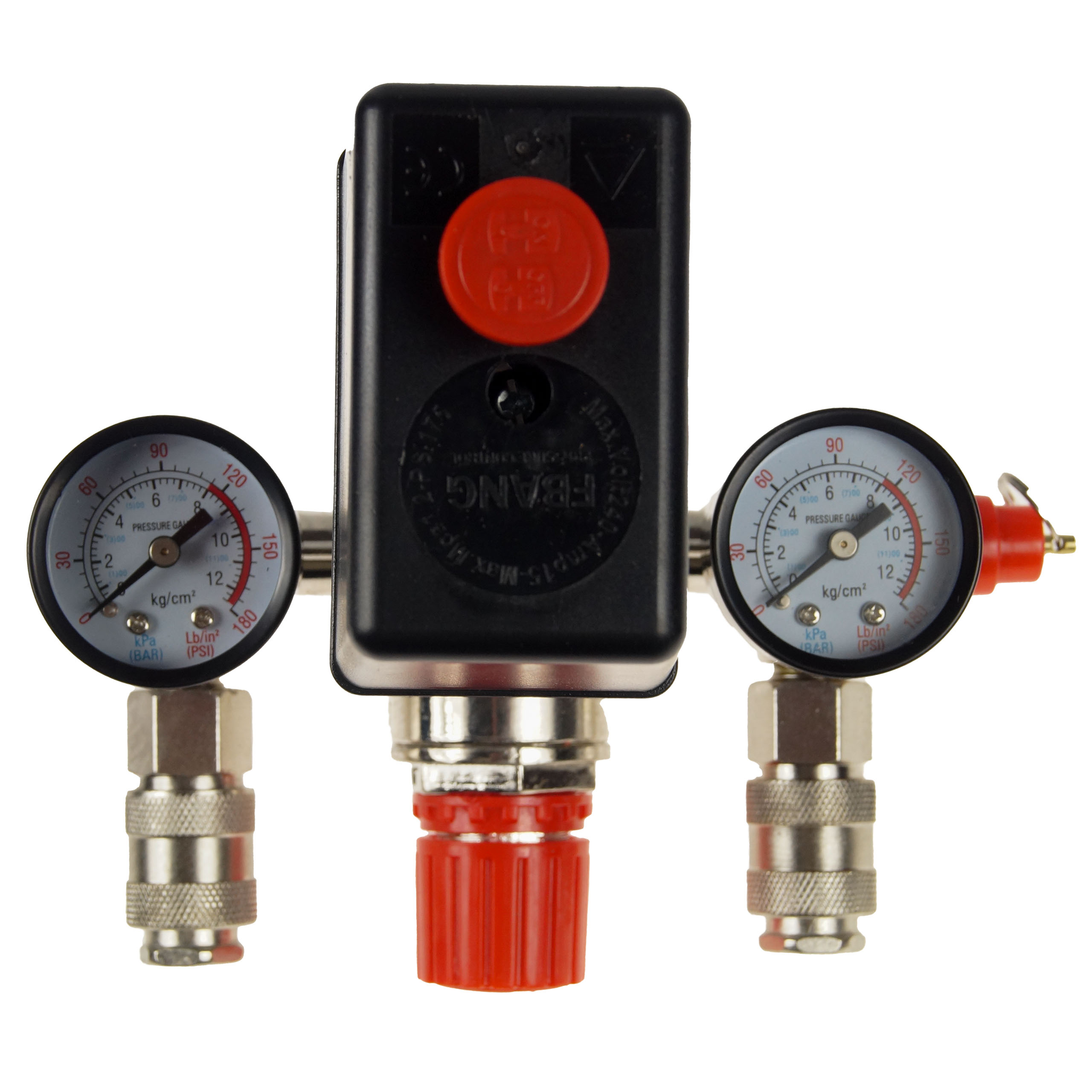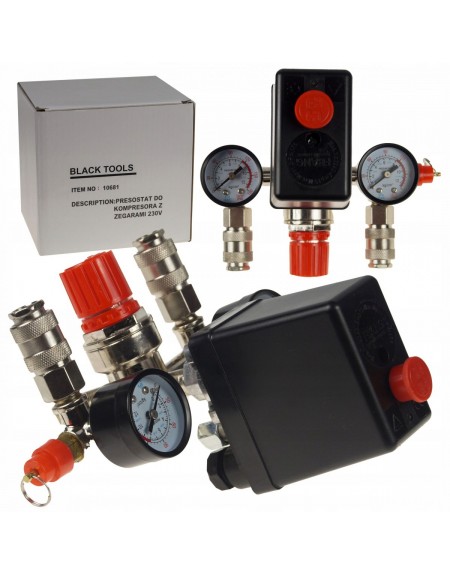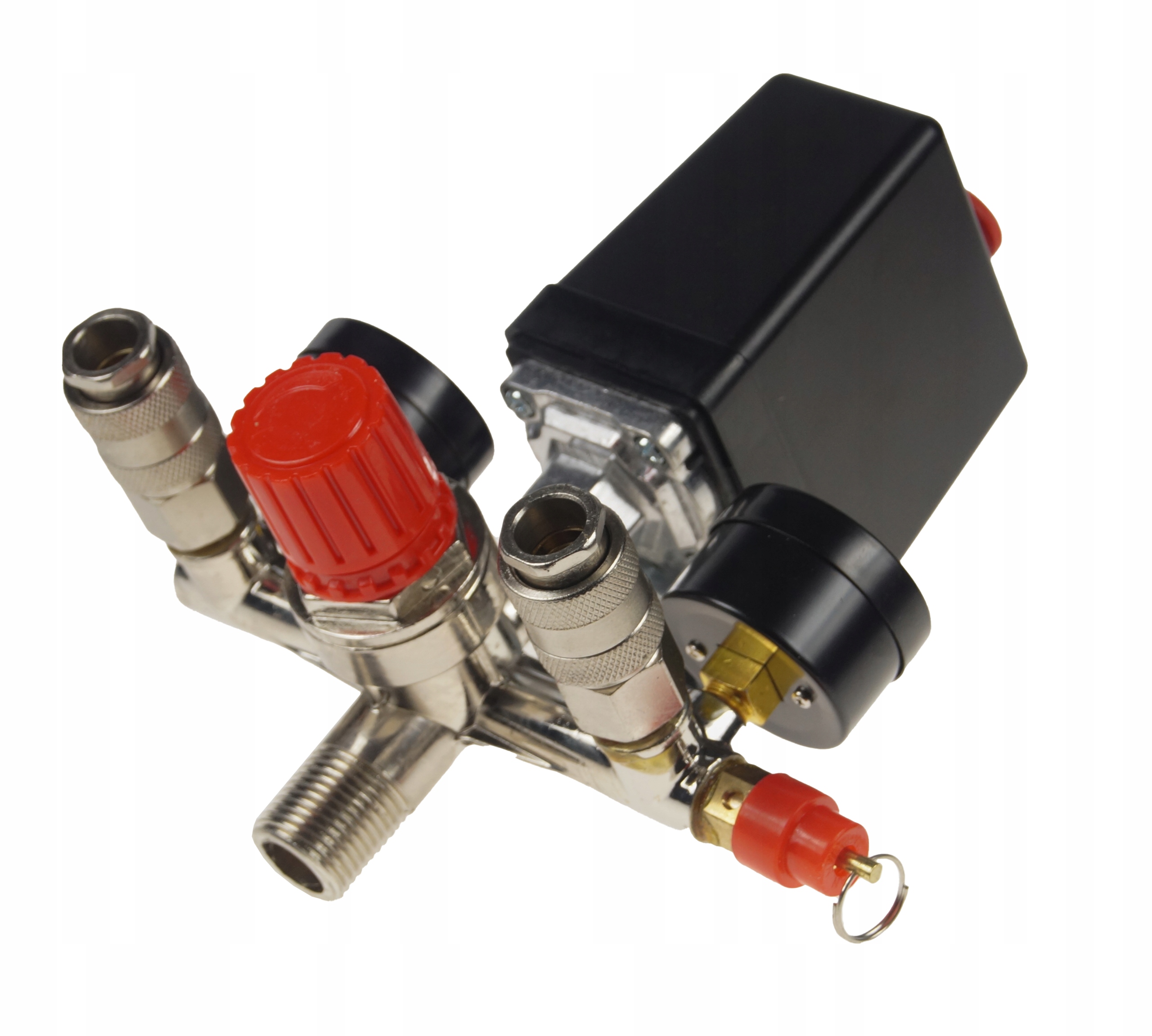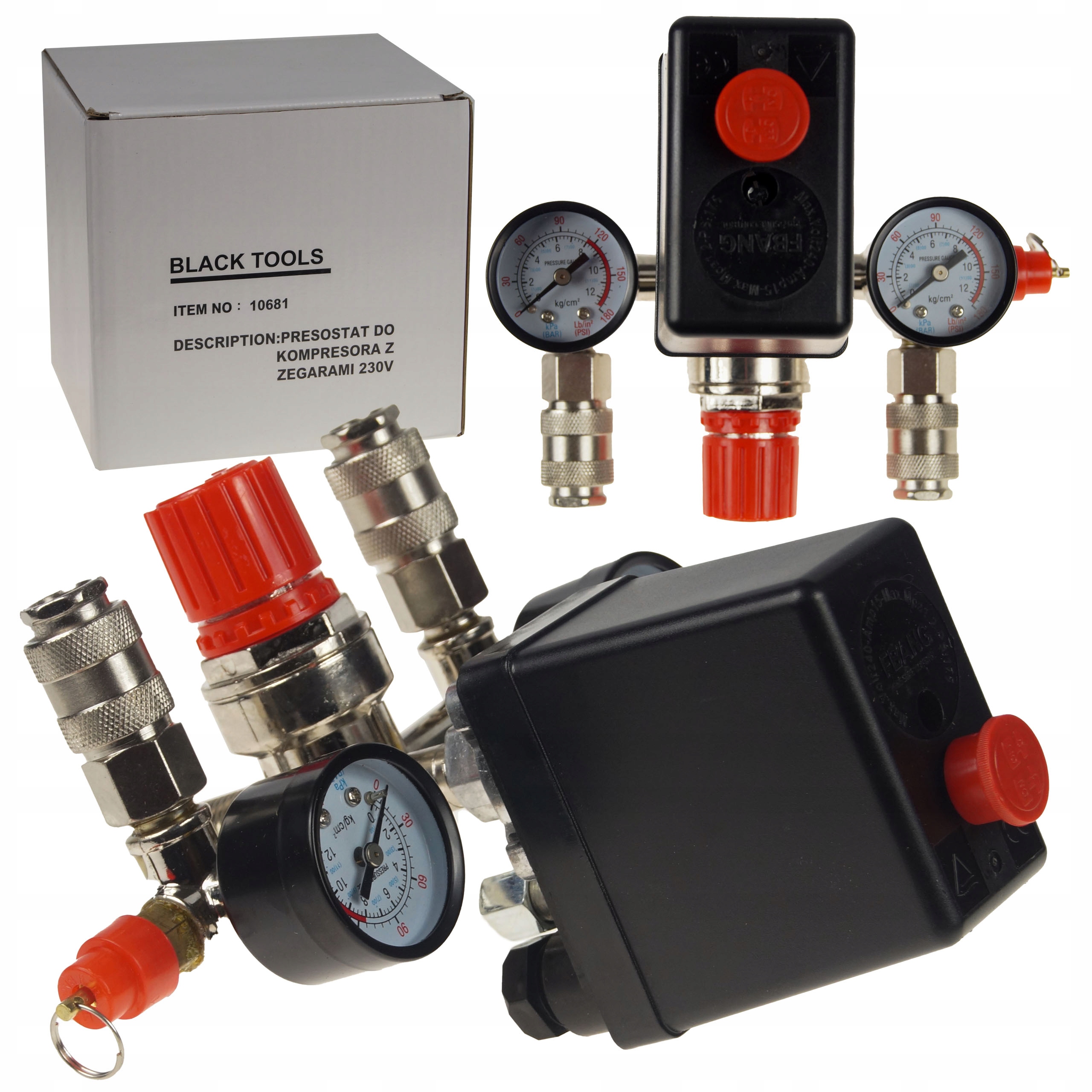 Wysokiej jakości wyłącznik ciśnieniowy (presostat) z kolektorem, dwoma szybkozłączkami i manometrami przeznaczony do kompresorów ciśnieniowych na 230V.